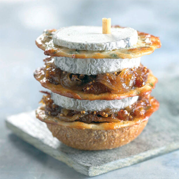 Monter les mille-feuilles en intercalant les tranches de Sainte-Maure-de-Touraine avec les tuiles aux herbes et la compote de figues.