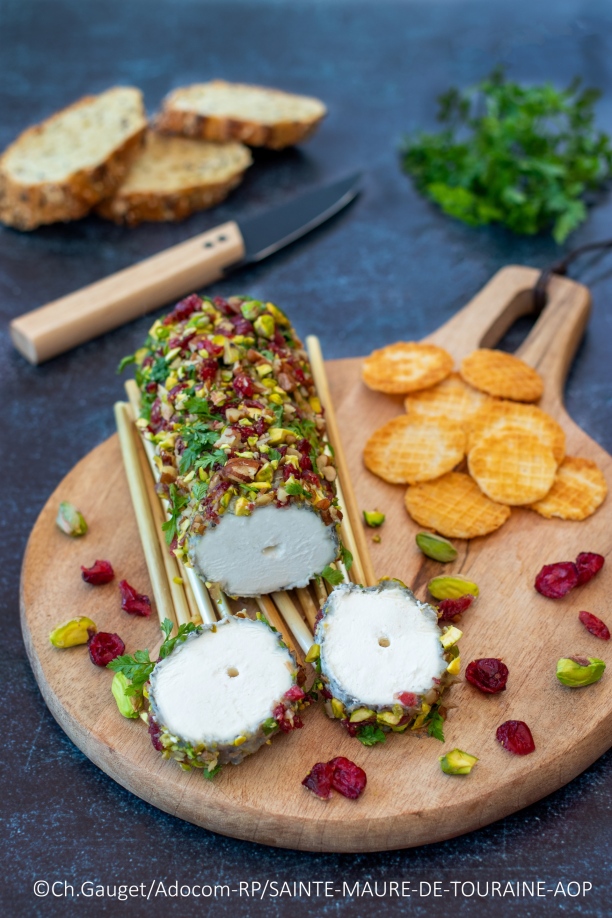 Déposer le Sainte Maure de Touraine AOP sur le mélange de fruits secs et le rouler délicatement afin de l’enrober totalement.