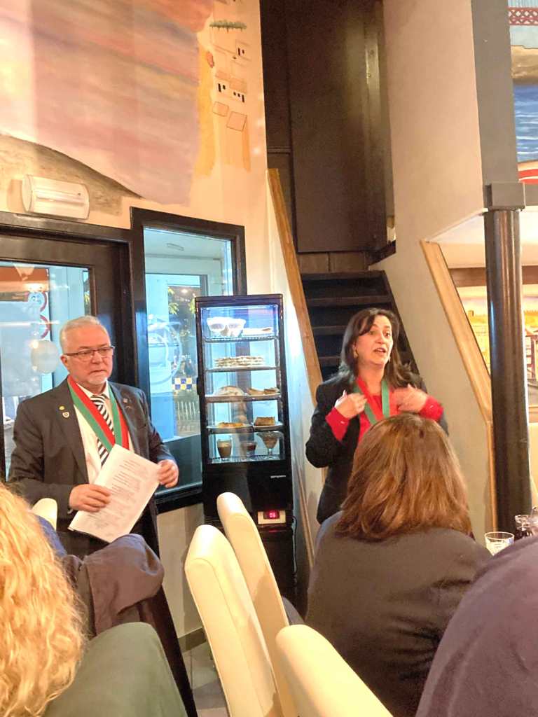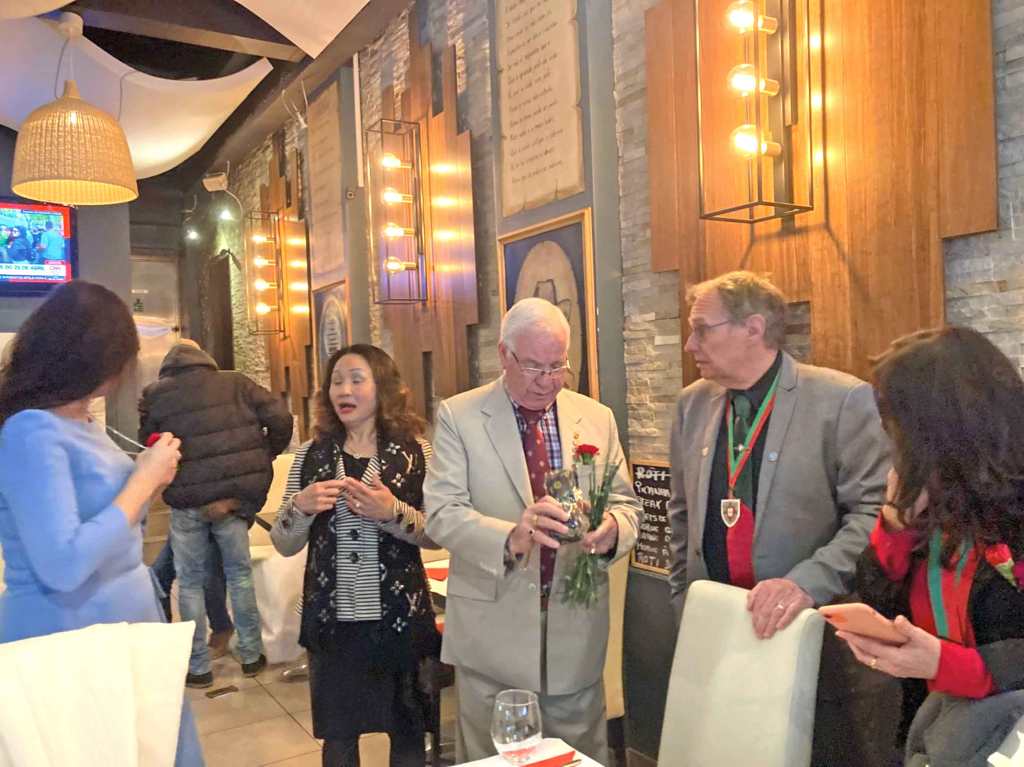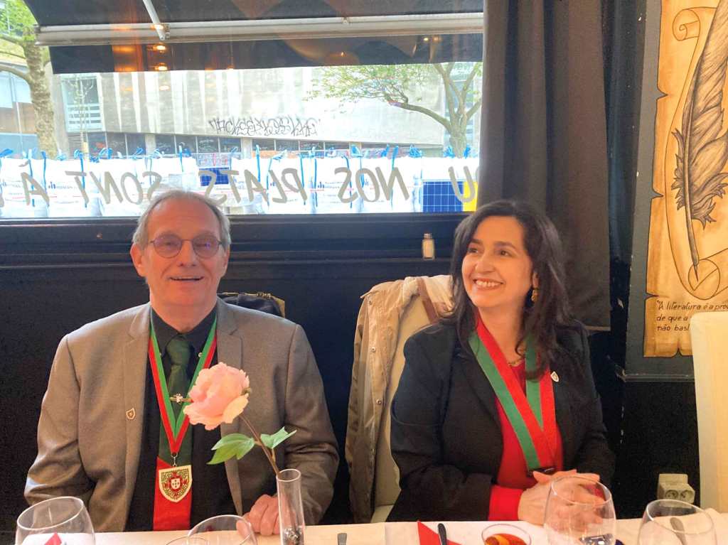 La Commanderie du fromage de Sainte Maure de Touraine était présente ce 25 avril à Bruxelles à l’occasion d’une soirée exceptionnelle. En effet, fêter la révolution des œillets avec nos amis portugais, voilà un beau rapprochement entre « peuples » ayant combattus pour leur liberté. Cet événement était organisé conjointement par les deux clubs Richelieu de Bruxelles, le club Richelieu de Bastogne, la Confrérie des vins du Portugal (Ordem dos Companheiros de São Vicente), avec la participation du président de l’Academia do Bacalhau de Bruxelles, et de membres des Compagnons de St Laurent (Meyboom), de l’Ordre de Gambrinus, confrérie des bières de Bruxelles, de l’Ordre des amis de Manneken-Pis et du club Richelieu du Littoral (Ostende). Le cadre de cette soirée fut le restaurant « Pessoa » à Ixelles, à proximité de la place Flagey et de l’unique statue érigée en l’honneur de Pessoa.