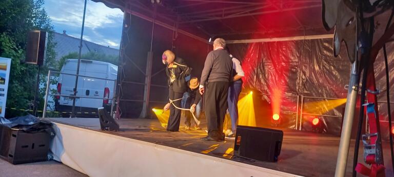 Un magicien a surpris le public par ses tours de magie ; Rémy , notre ami dignitaire, n’a pas compris ce qui lui est arrivé, nous non plus !!! Il était sur la scène juste devant nous appelé avec deux autres personnes. Suite à la demande du magicien, ils ont ligoté très sérieusement son assistante . Dans l’emplacement de la cage noire, il a fait placer Rémy et l’assistante ligotée et en un temps record le rideau de la cage est monté pour les cacher et est redescendu aussitôt, et qu’avons nous vu? Rémy n’avait plus sa veste qui était ficelée sous les cordes de l’assistante ligotée, ils ont défait les cordes pour récupérer la veste, mystère…mystère. Je ne saurais pas expliquer, les autres numéros non plus, bravo à ce sympathique magicien…
