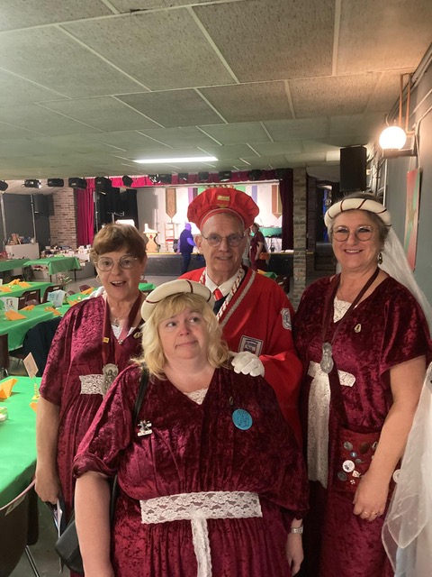 Voilà bien un passage incontournable en bord de Meuse, bien que la météo ne nous y ait pas vraiment incités ! Si nous avons bien dû affronter les tombées d’eau incessantes, nous avons cependant échappé aux nombreuses inondations qui ont affecté la région liégeoise. Enfin, c’est au compte-gouttes’ que les confrères font leur apparition dans les locaux de la Charlemagn’rie pour assister à la 17ème cérémonie d’intronisation organisée par la confrérie des Filles de Berthe au long pied. Désireuses de redresser une injustice flagrante, c’est en croisade que sont parties ces amazones herstaliennes pour rendre aux sœurs de Charlemagne, ce réputé préalien, la juste place et le mérite qui leur revenaient en les mettant à l’honneur au travers d’une confrérie spécifiquement féminine. Pour faire partie du groupe, il suffit d’être une femme de 18 à 98 ans, porter le costume et l’emblème lors de manifestations culturelles. Lors de festivités publiques, culturelles, ou sociales, la confrérie confectionne des crêpes (spéciales, à l’advocaat), fait goûter son alcool (cerise) et même sa praline (la bertine). Le tout fait maison.