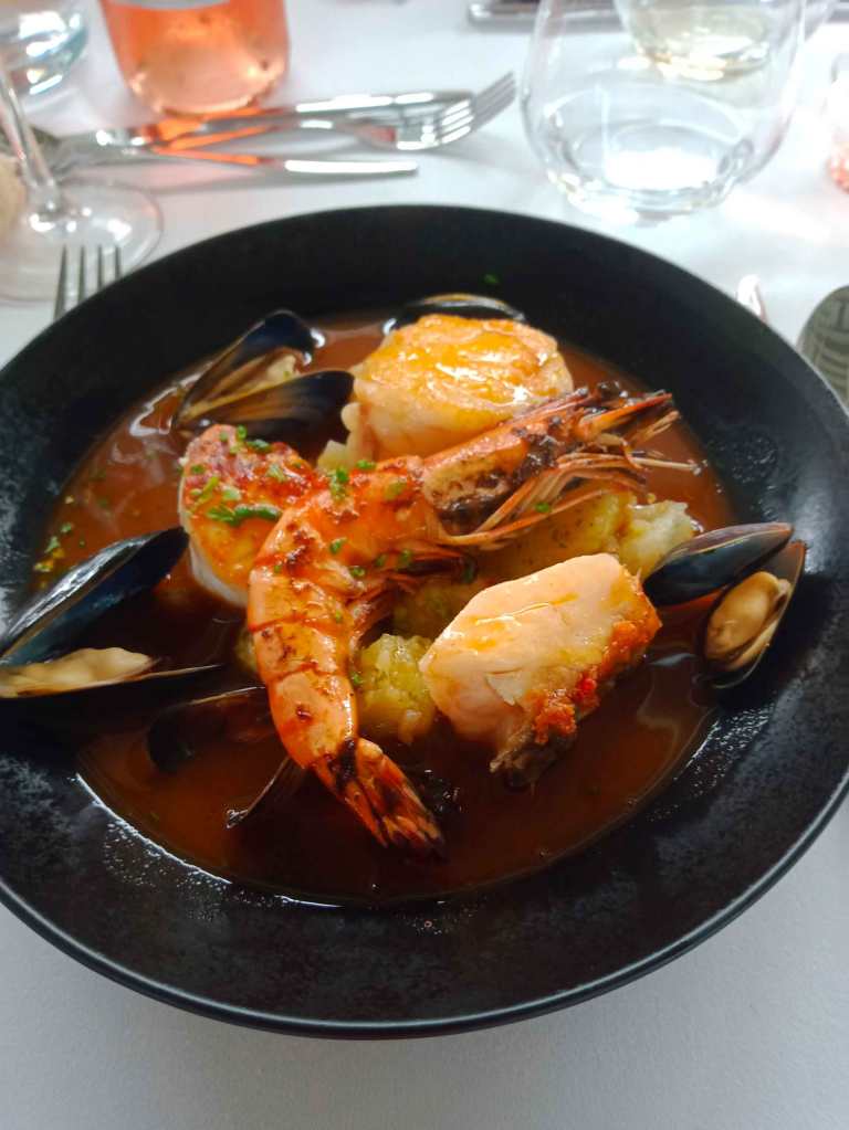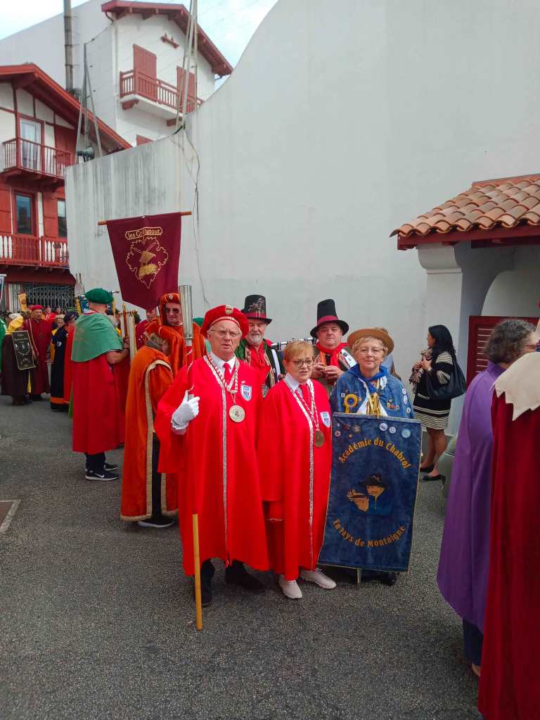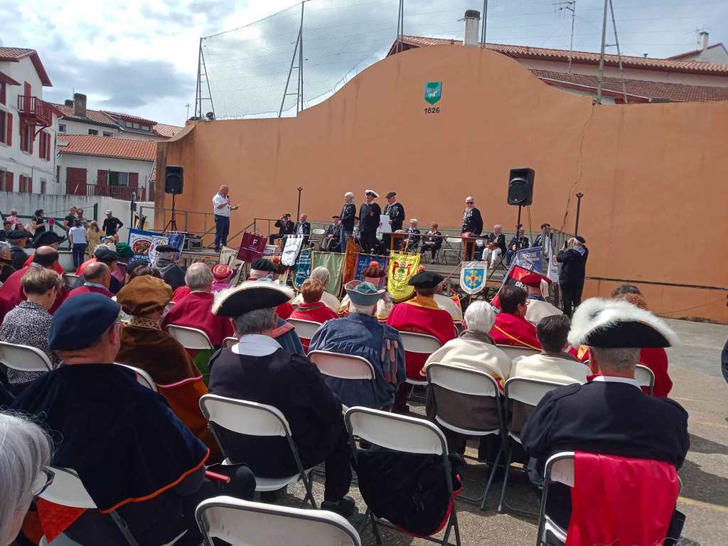 C’est par une matinée ensoleillée que nous avons été accueillis au bar Maïtena au fronton de Ciboure pour le buffet d’accueil traditionnel (nous étions une cinquantaine de confréries. Puis nous sommes partis en défilé dans les rues pour arriver à 10h30 dans la très belle église afin d’assister à la messe solennelle. Vers 12h00 ouverture du 41ème chapitre et quelques intronisations du fronton de Ciboure. Vers 13h00 départ en voiture vers la très belle salle polyvalente pour le déjeuner où nous avons dégusté la spécialité basque le TTORO (prononcer tioro) avec un excellent vin d’Espagne; ce plat typique régional est composé de poisson blanc et de grosses crevettes cuits dans un bouillon le tout accompagné de sauce rouille. Une animation musicale accompagnait ce repas. La journée s’est terminée vers 18h00 par un gros orage.