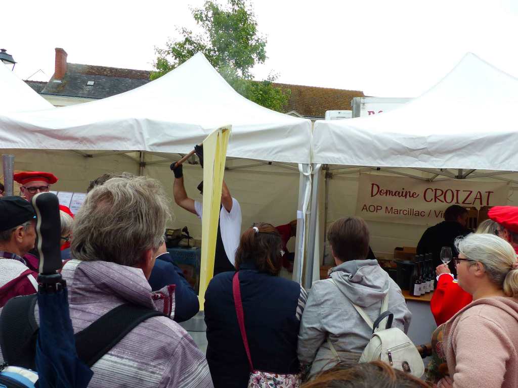A leurs côtés, un grand stand de l’A.O.P. Sainte Maure de Touraine, donnait la démonstration publique de toutes les opérations qui constituent la fabrication de notre fromage A.O.P., depuis le délicat moulage à la louche, l’égouttage, le démoulage, l’introduction de la paille pyrogravée, le saupoudrage de la poudre de charbon de bois et de sel qui donne à notre fromage, sa belle robe bleue. Démonstration suivie avec intérêt par le public.
