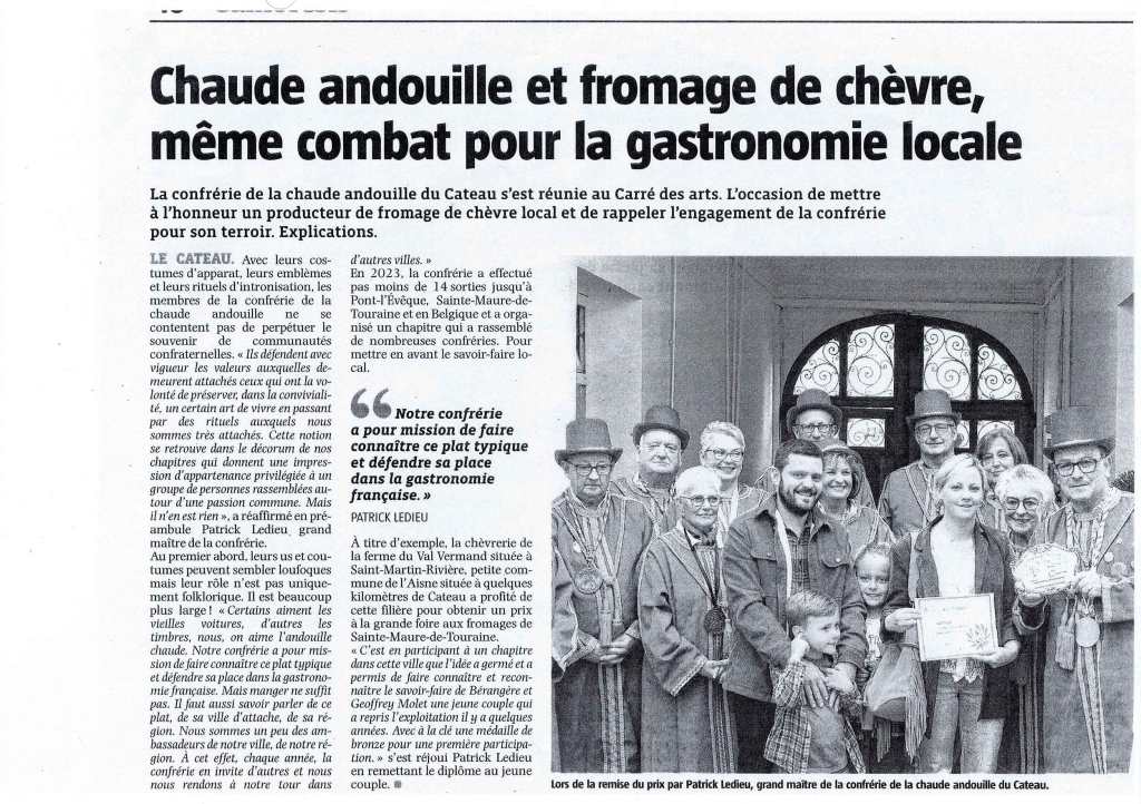 Lors de notre participation au Grand Chapitre de La Chaude Andouille, début avril, notre Confrère Patrick Ledieu nous avait guidé chez Bérangère et Geoffrey Molet visiter leur élevage de chèvres, leur fromagerie et leur magasin de vente à St Martin Rivière, proche du Cateau. A cette occasion, notre Confrère Jean Meunier les avait motivé pour présenter leurs produits au Concours Fromagora lors de la Foire aux Fromages 2024 de Sainte-Maure de Touraine.