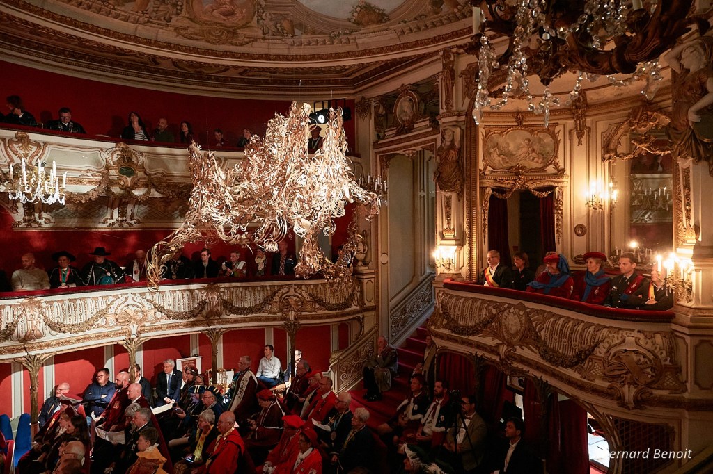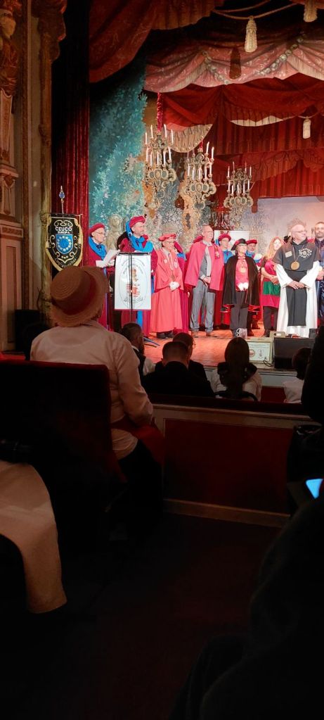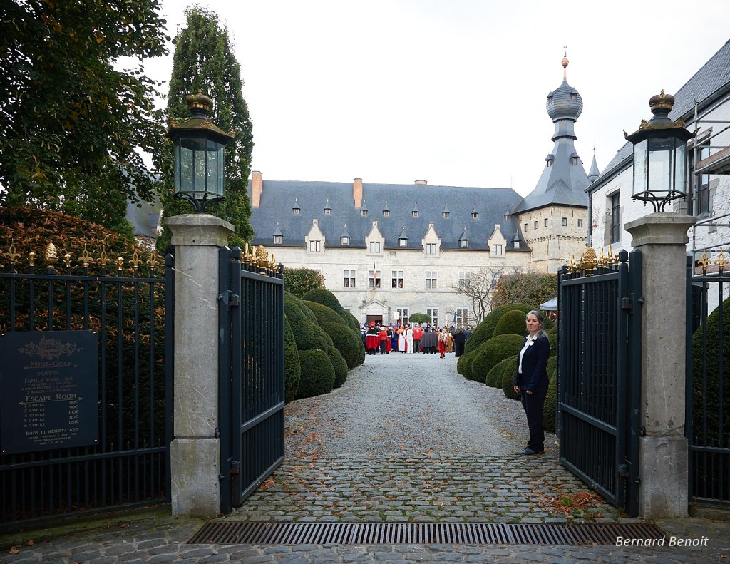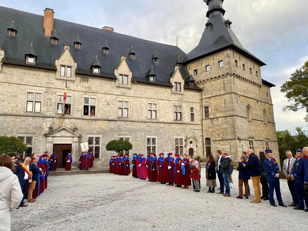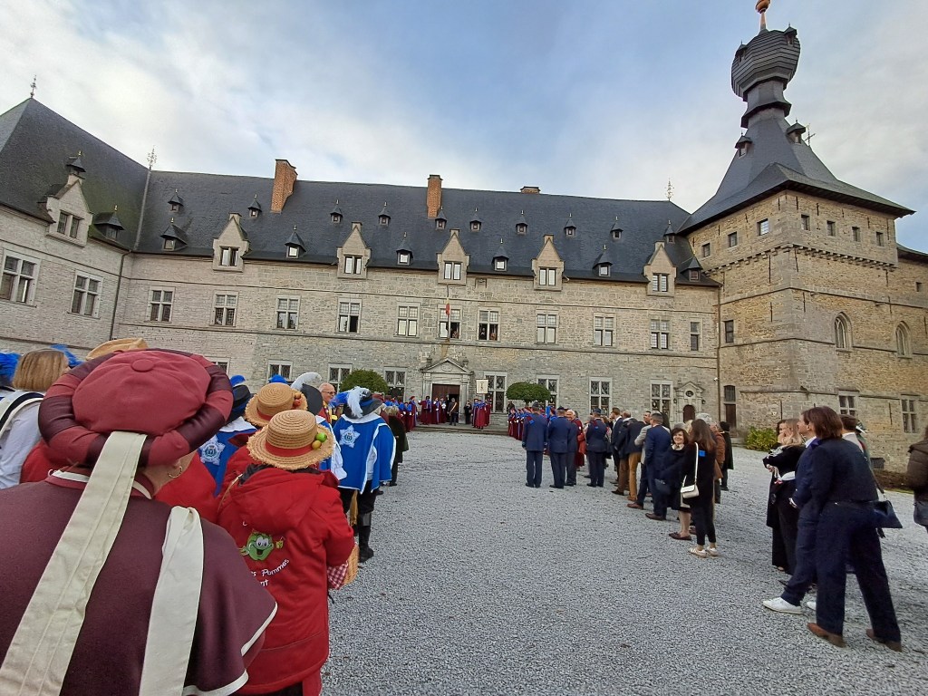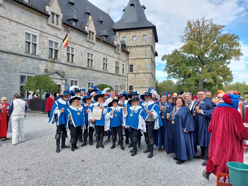 C’est par un matin d’automne que nous partons à l’accueil des confréries au Collège Saint Joseph ou ils nous servent un bon petit déjeuner, mise en habit, puis défilé de 44 confréries dont 5 françaises pour aller au Château des Princes de Chimay ouvert exceptionnellement pour les 58 intronisations y compris Fernand. A la fin des intros, ils ont chanté l’hymne Belge, la Marseillaise et l’Hymne Européen ensuite nous sortons dans la cour pour le verre de l’amitié, naturellement de la bière. Retour au Collège pour le repas gastronomique animé par Jacky Coppens et son Band.