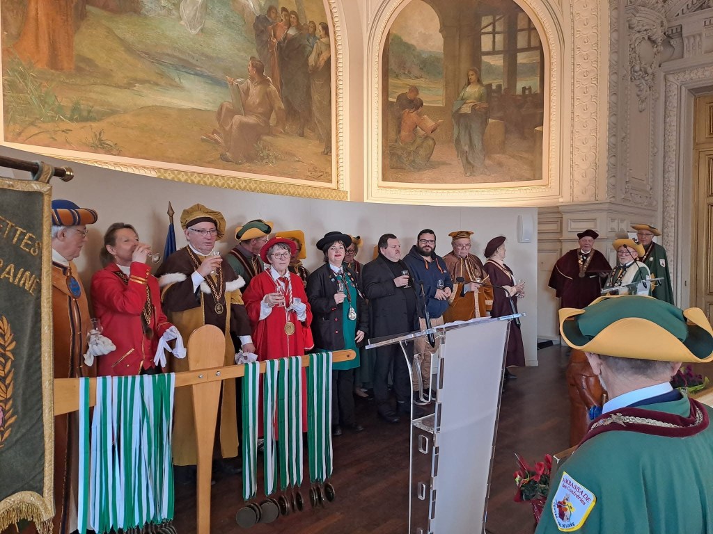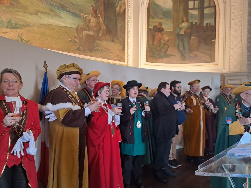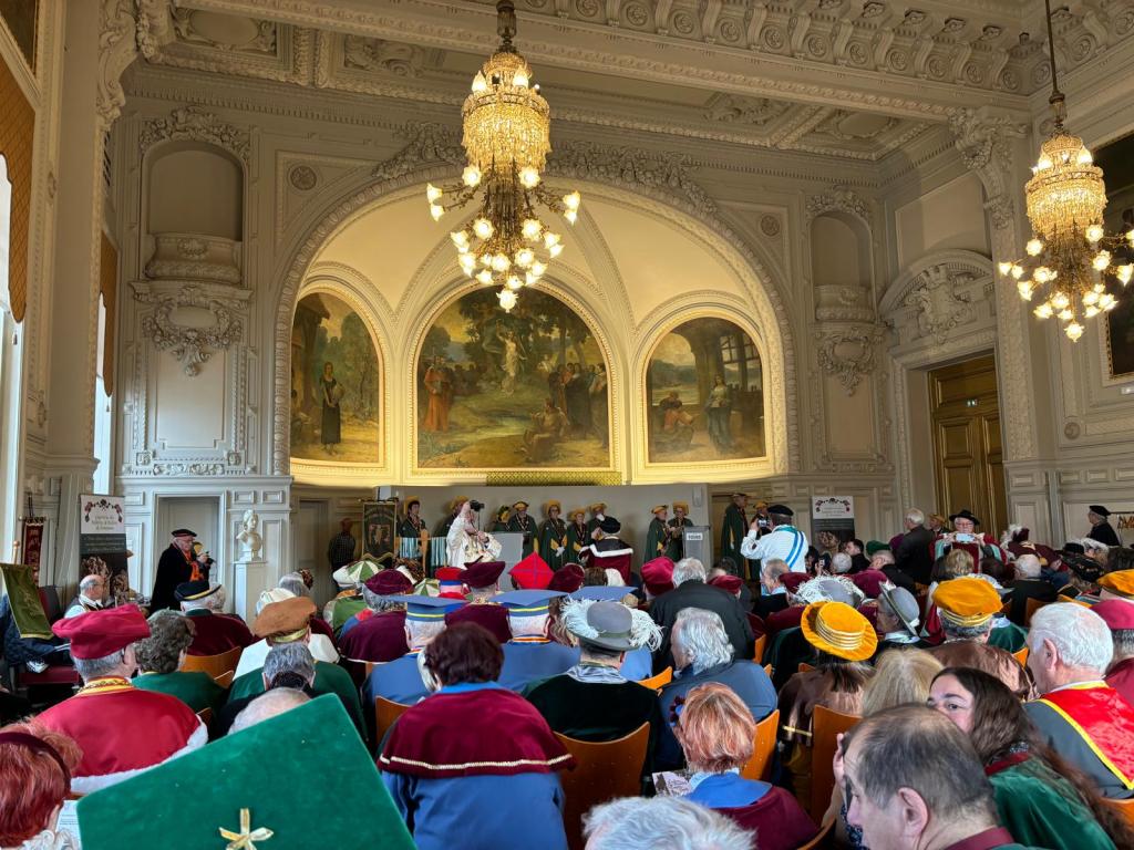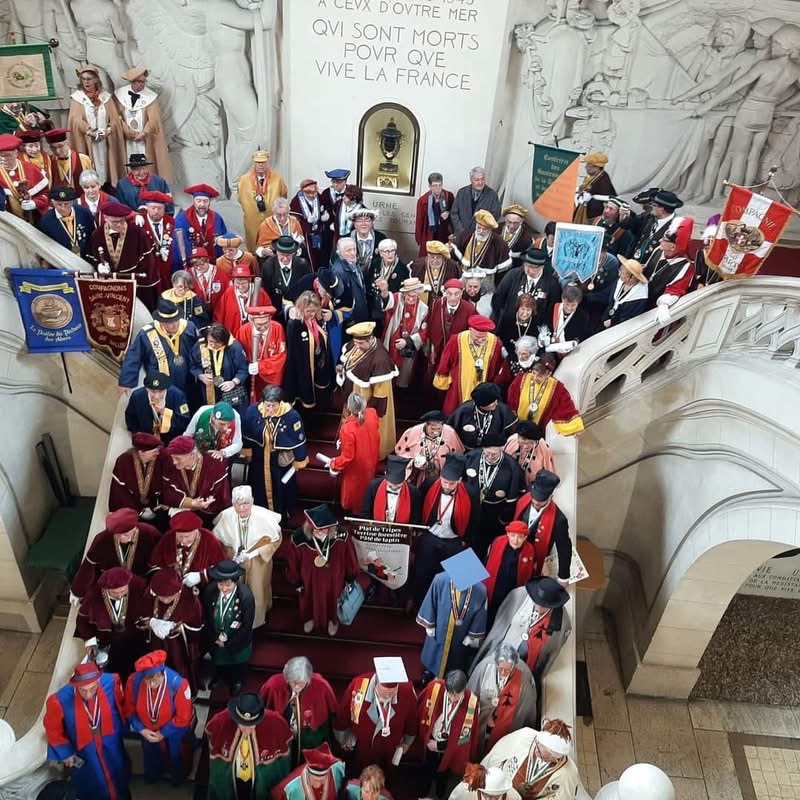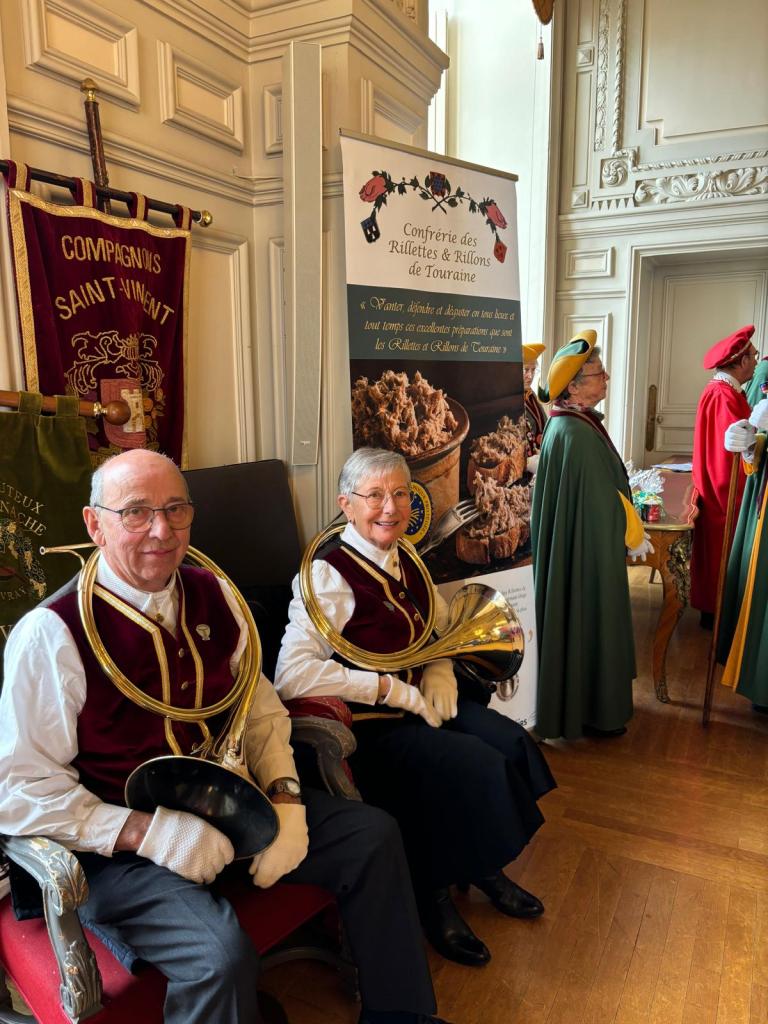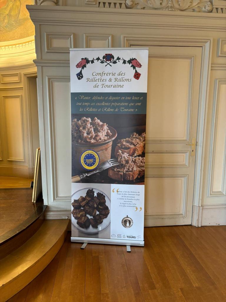 45ème chapitre de la Confrérie des rillettes et rillons de Touraine crée en 1977. Christine, Jean et Martine avons été accueillis à l’hôtel de Ville de Tours. La Ville de Tours est connue sous le surnom de « Petit Paris » en raison de sa situation géographique stratégique à environ 1h en TGV de Paris Montparnasse. Suivi d’un mangement bien gourmand. Mise en habit, puis présentation de 79 Confréries dans la magnifique salle de mariage. Le Grand Maitre Gérard BARS a intronisé une trentaine de convives dont notre ami Gérard FERRAND par surprise ( représentant l’association des membres de l’ordre du mérite agricole) ainsi que Martine qui ont eu l’honneur de déguster la brune confiture de cochon + rillons arrosé d’un verre de vin offert par les compagnons de la Saint Vincent de Vallères. Super déjeuner concocté par le traiteur Tardivon.