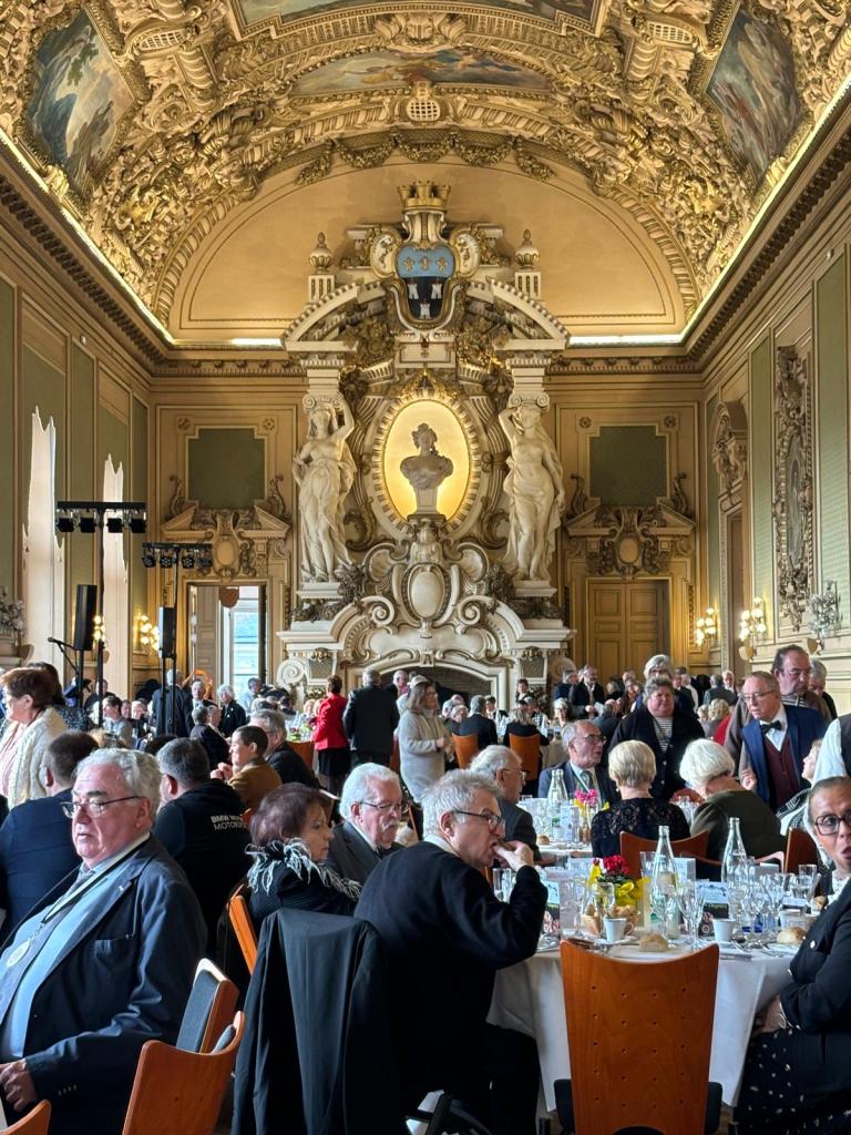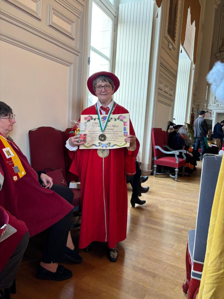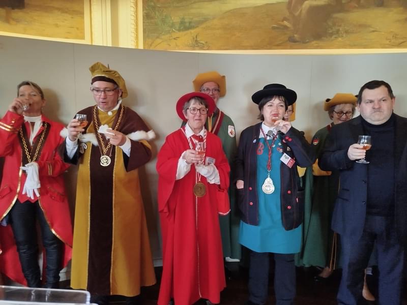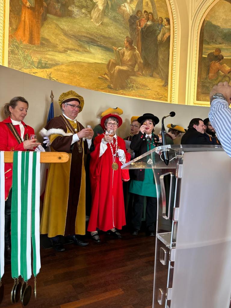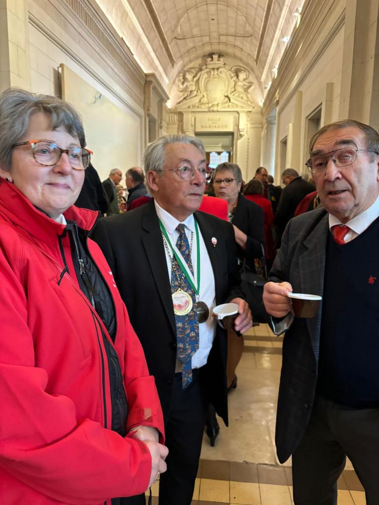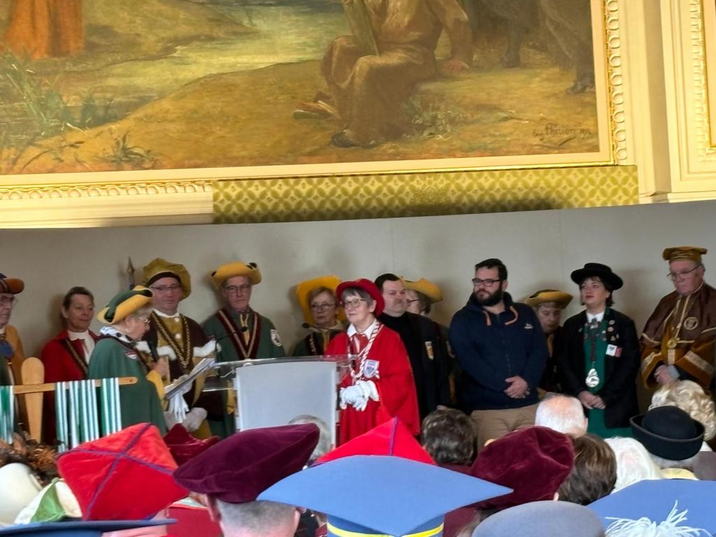 45ème chapitre de la Confrérie des rillettes et rillons de Touraine crée en 1977. Christine, Jean et Martine avons été accueillis à l’hôtel de Ville de Tours. La Ville de Tours est connue sous le surnom de « Petit Paris » en raison de sa situation géographique stratégique à environ 1h en TGV de Paris Montparnasse. Suivi d’un mangement bien gourmand. Mise en habit, puis présentation de 79 Confréries dans la magnifique salle de mariage. Le Grand Maitre Gérard BARS a intronisé une trentaine de convives dont notre ami Gérard FERRAND par surprise ( représentant l’association des membres de l’ordre du mérite agricole) ainsi que Martine qui ont eu l’honneur de déguster la brune confiture de cochon + rillons arrosé d’un verre de vin offert par les compagnons de la Saint Vincent de Vallères. Super déjeuner concocté par le traiteur Tardivon.