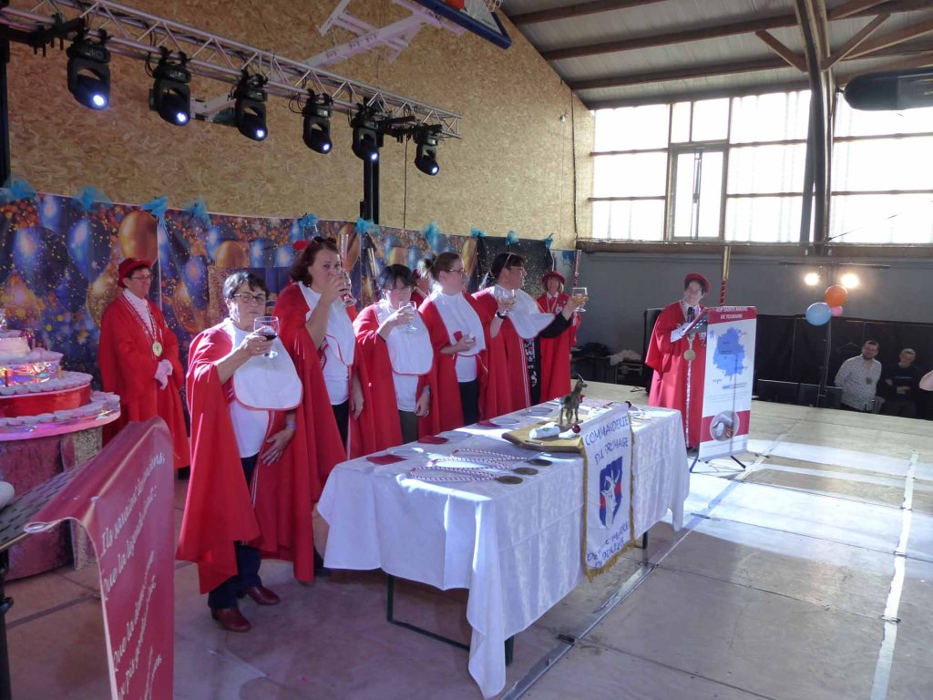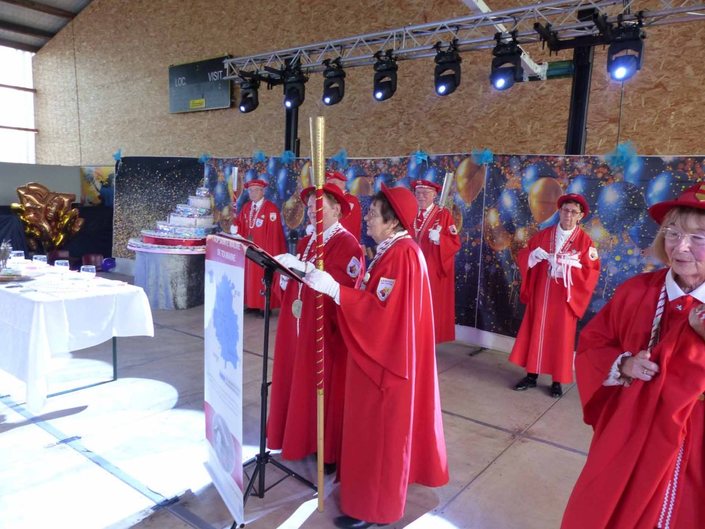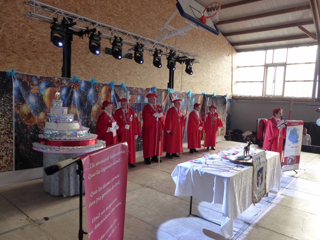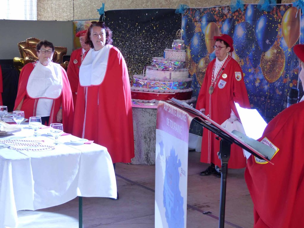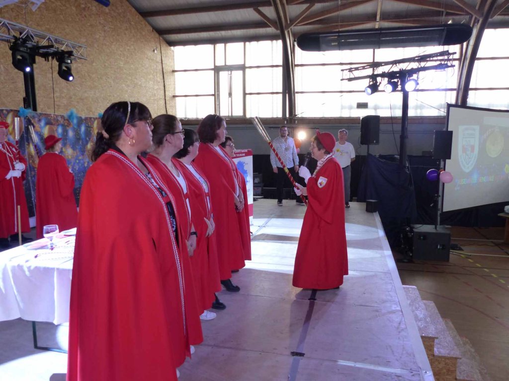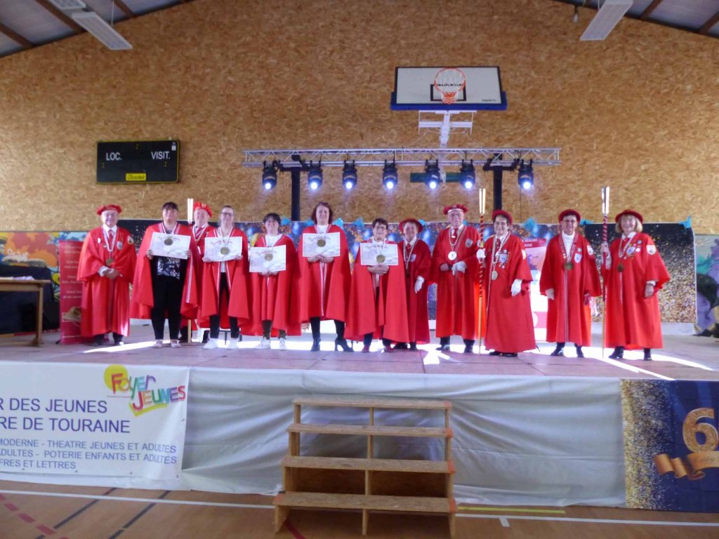 Un spectacle qui se termine en regroupant sur scène tous les participants autour d’un gâteau d’anniversaire XXL. Le public conquis a repris en chœur « l’HAPPY BIRTHDAY », suivi d’un tonnerre d’applaudissements. Soirée très réussie, qui a demandé un travail considérable (une année de préparation). Le lendemain matin, après la réunion de l’Assemblée Générale, les membres de la Commanderie du fromage de Sainte-Maure de Touraine sont à leur tour montés sur scène pour procéder à un Chapitre Exceptionnel afin d’introniser 5 CHEVALIERS : Françoise METAIS, Vice-Présidente de l’Association, Sabrina RISO-TRICOCHE, Lucy DOS SANTOS LOURO, Estelle AUBINEAU et Laëtitia DUBART qui ont toutes un point commun : leur investissement au niveau du Foyer des Jeunes.