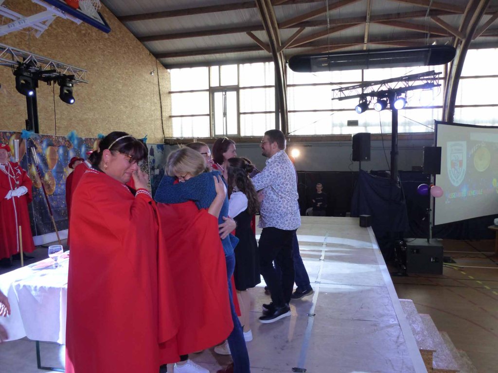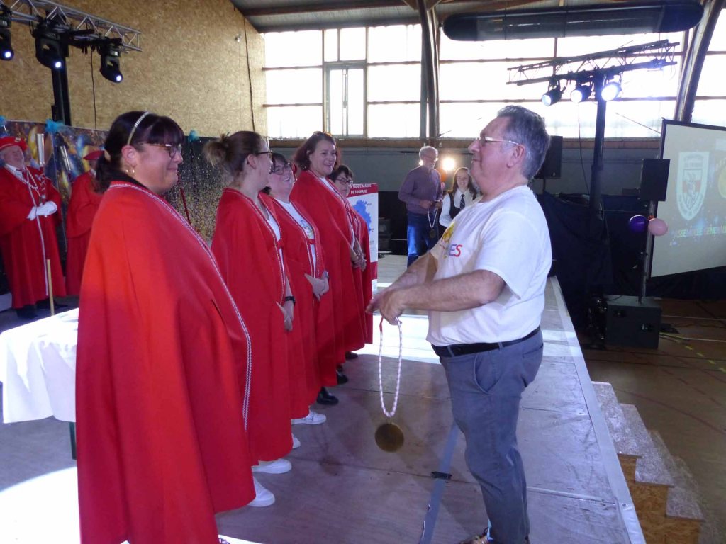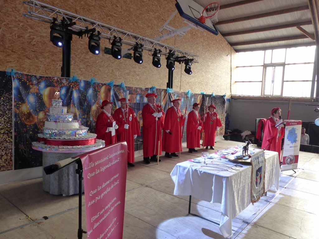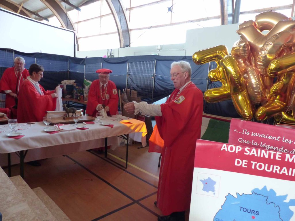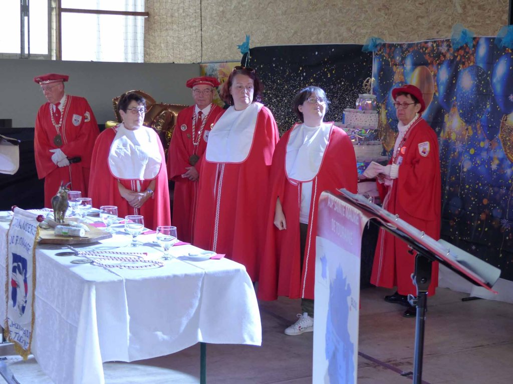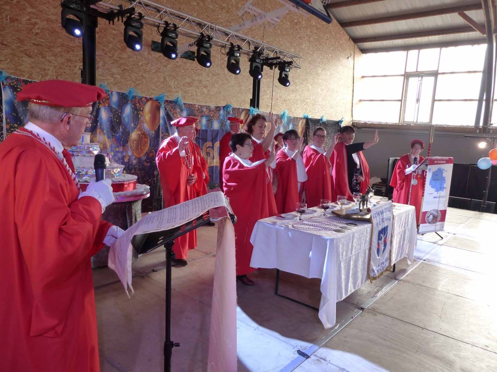 Un spectacle qui se termine en regroupant sur scène tous les participants autour d’un gâteau d’anniversaire XXL. Le public conquis a repris en chœur « l’HAPPY BIRTHDAY », suivi d’un tonnerre d’applaudissements. Soirée très réussie, qui a demandé un travail considérable (une année de préparation). Le lendemain matin, après la réunion de l’Assemblée Générale, les membres de la Commanderie du fromage de Sainte-Maure de Touraine sont à leur tour montés sur scène pour procéder à un Chapitre Exceptionnel afin d’introniser 5 CHEVALIERS : Françoise METAIS, Vice-Présidente de l’Association, Sabrina RISO-TRICOCHE, Lucy DOS SANTOS LOURO, Estelle AUBINEAU et Laëtitia DUBART qui ont toutes un point commun : leur investissement au niveau du Foyer des Jeunes.