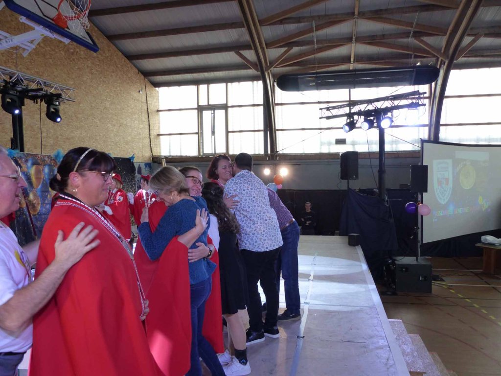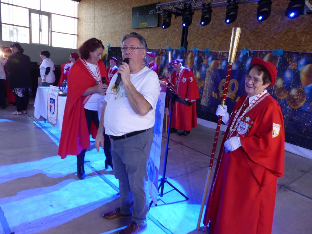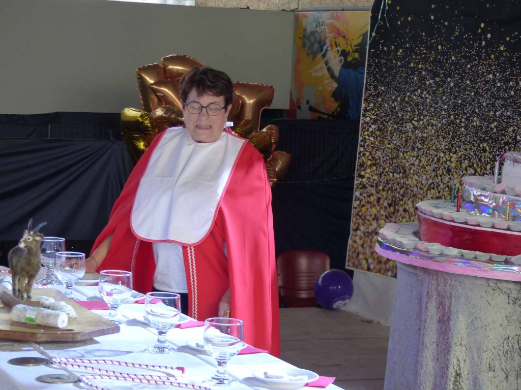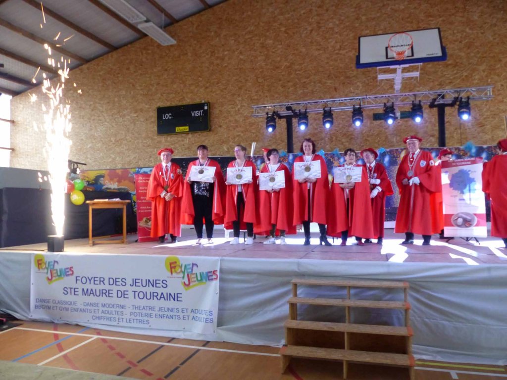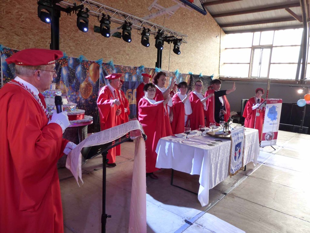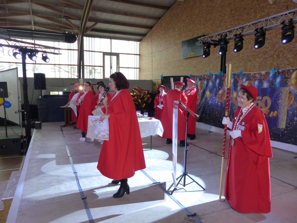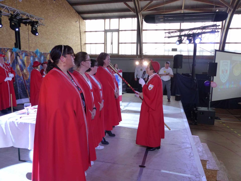 Un spectacle qui se termine en regroupant sur scène tous les participants autour d’un gâteau d’anniversaire XXL. Le public conquis a repris en chœur « l’HAPPY BIRTHDAY », suivi d’un tonnerre d’applaudissements. Soirée très réussie, qui a demandé un travail considérable (une année de préparation). Le lendemain matin, après la réunion de l’Assemblée Générale, les membres de la Commanderie du fromage de Sainte-Maure de Touraine sont à leur tour montés sur scène pour procéder à un Chapitre Exceptionnel afin d’introniser 5 CHEVALIERS : Françoise METAIS, Vice-Présidente de l’Association, Sabrina RISO-TRICOCHE, Lucy DOS SANTOS LOURO, Estelle AUBINEAU et Laëtitia DUBART qui ont toutes un point commun : leur investissement au niveau du Foyer des Jeunes.