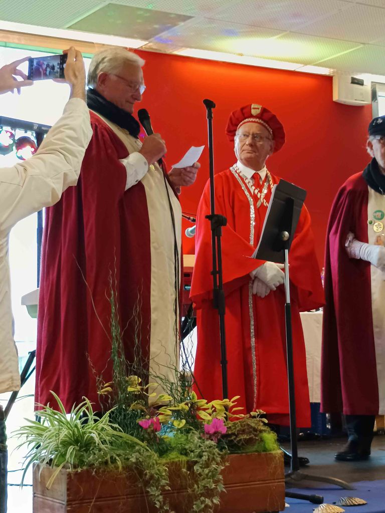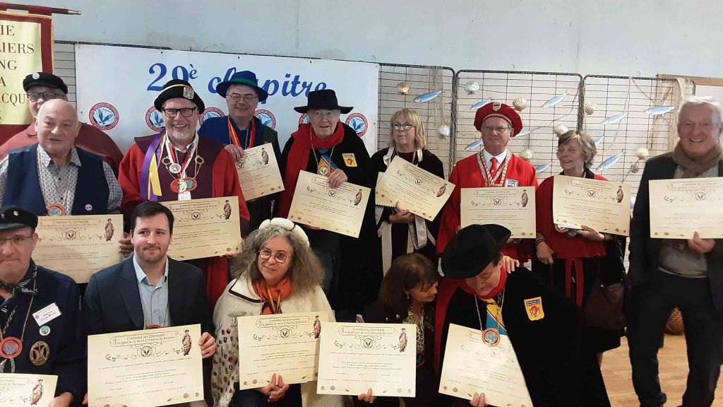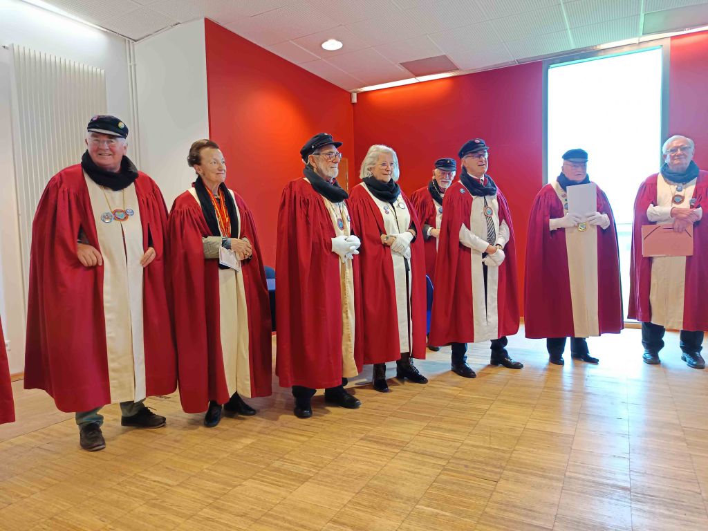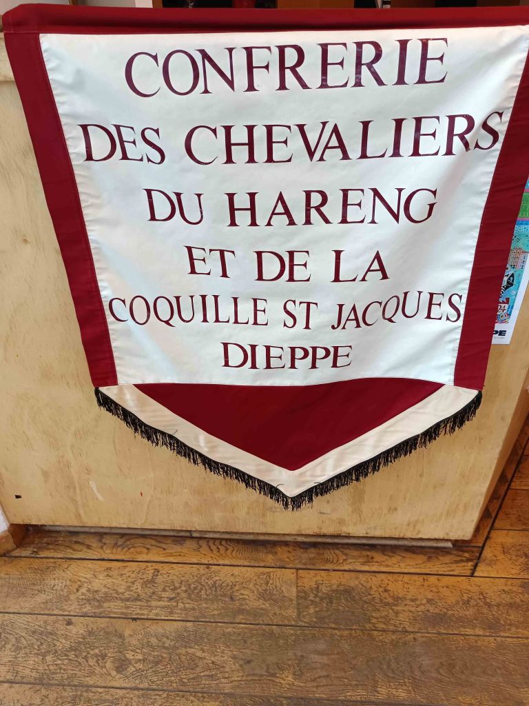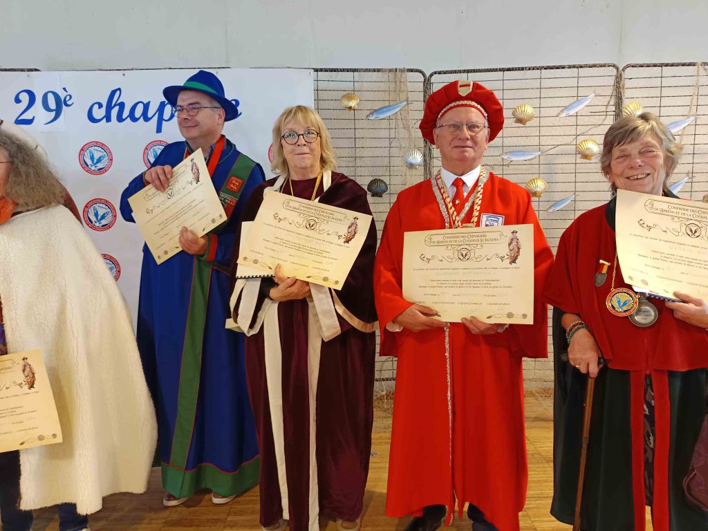 En ce dimanche 10 novembre 2024 nous sommes arrivés à 10h00 salle des congrès de Dieppe où les chevaliers de la Confrérie du Hareng et de la Coquille St Jacques nous ont accueilli pour un petit déjeuner de café, thé et viennoiseries. Puis mise en habit. Vers 11h00 nous nous sommes installés pour les intronisations (toujours dans la même salle), nous étions 14 confréries et environ 80 invités. A 12h00 cocktail au cours duquel nous avons dégusté huîtres, saumon fumé, hareng, St Jacques le tout nature ou préparé de façon originale, l’ensemble arrosé de vin blanc. Aux alentours de 13h30, toujours dans la même salle, nous nous sommes installés à table pour une deuxième dégustation de St Jacques, fromages et dessert.