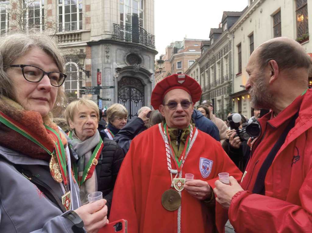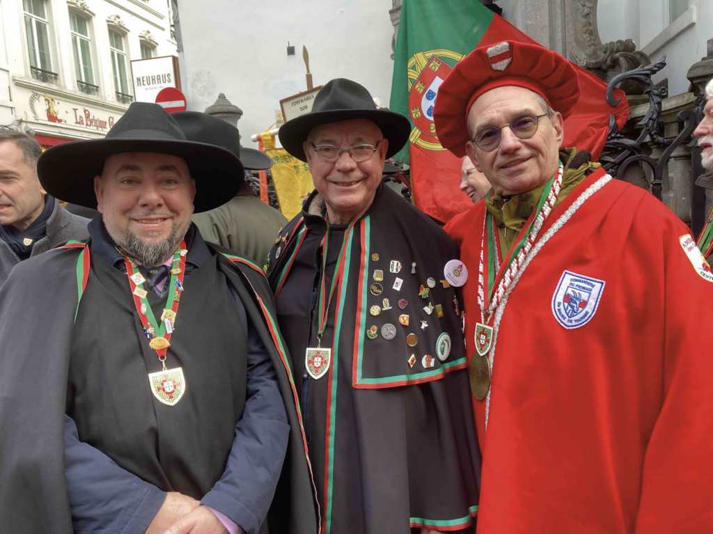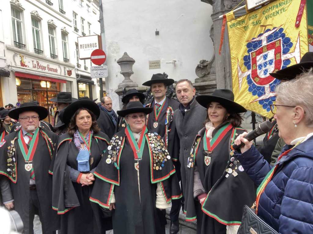 Par un temps pluvieux et froid, entouré d’amis issus des confréries ainsi que du folklore bruxellois, cet événement qui attire toujours la curiosité des touristes en nombre a été rehaussé par la présence du représentant de l’Ambassadeur du Portugal en Belgique ainsi que de plusieurs personnalités venues directement du Portugal dont des représentants communaux ainsi que 3 chefs coqs étoilés. Comme il se doit, des discours idoines furent prononcés. La traditionnelle chanson du Manneken-Pis fut fredonnée en cœur par les membres de l’Ordem et les invités sous la direction des amis de l’Ordre du Manneken-Pis. Pour parachever ce cérémonial, la Grand Maître de la confrérie, Cécilia Vidigal, invita alors les personnes présentes à déguster du Moscatel ravivant les papilles tant des confrères que des touristes présents. La confrérie nous convia ensuite à un excellent repas, servi au restaurant « Le Cercle des Voyageurs » à deux pas de notre célèbre angelot. Ce repas fut précédé par une dégustation et une présentation de Vinho Verde en direct de Ponte de Lima. Comme d’habitude, festivité rima avec convivialité.