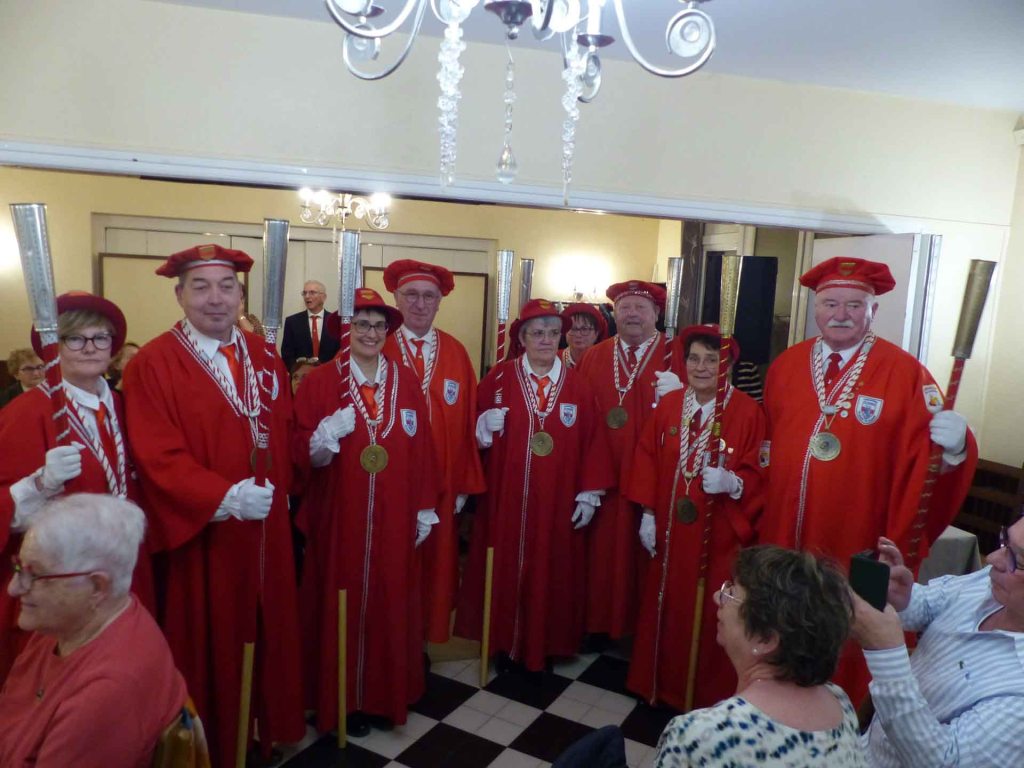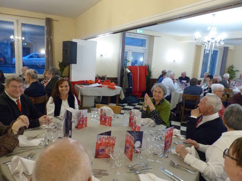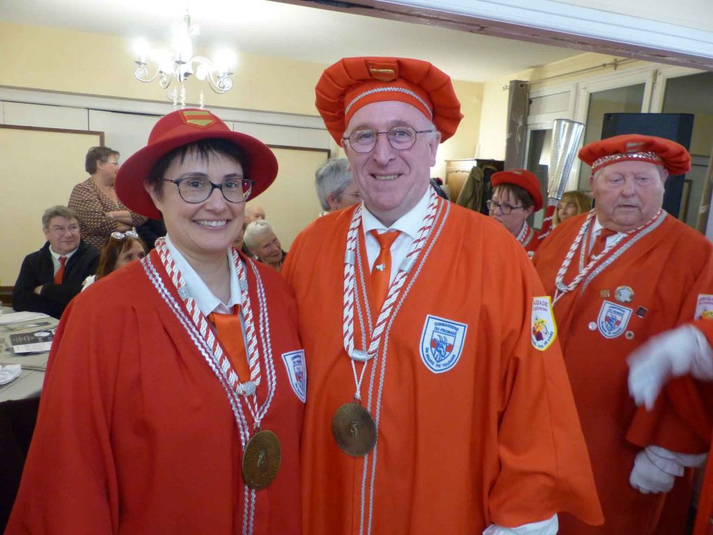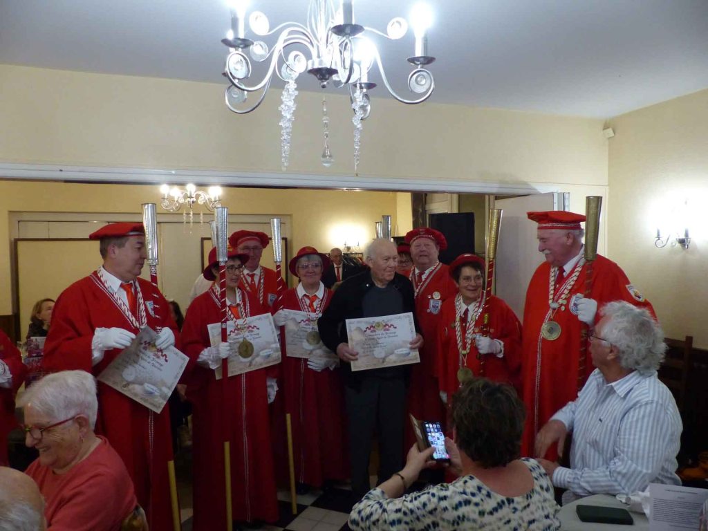 En conclusion « Je vous demande d’être de dignes et valeureux Ambassadeurs de notre Commanderie et de porter très haut la renommée de Notre Fromage » La cérémonie terminée, chaque nouveau Dignitaire a trinqué avec chaque convive. Dans la continuité de cette cérémonie protocolaire, Notre Grand Maître a appelé notre Confrère et Ami Guy Desmazeau. Guy est entré comme Dignitaire dans La Commanderie en 1974 ou 1975. Pendant ces cinquante années, Guy a assuré la tâche de « Grand Echanson » avec compétence, recherchant toujours le meilleur rapport qualité prix. En le remerciant et le félicitant, ainsi que son épouse Eliane, pour leur dévouement et leur fidélité à La Commanderie, Madeleine a remis à Guy, le Diplôme de Dignitaire Honoraire