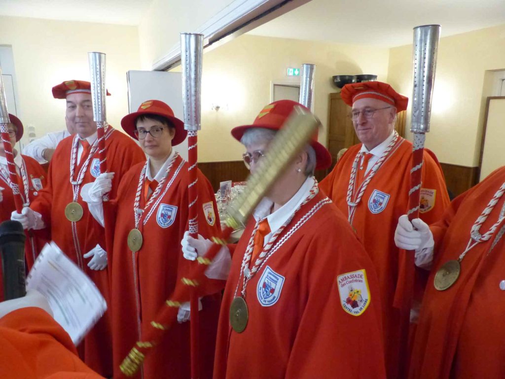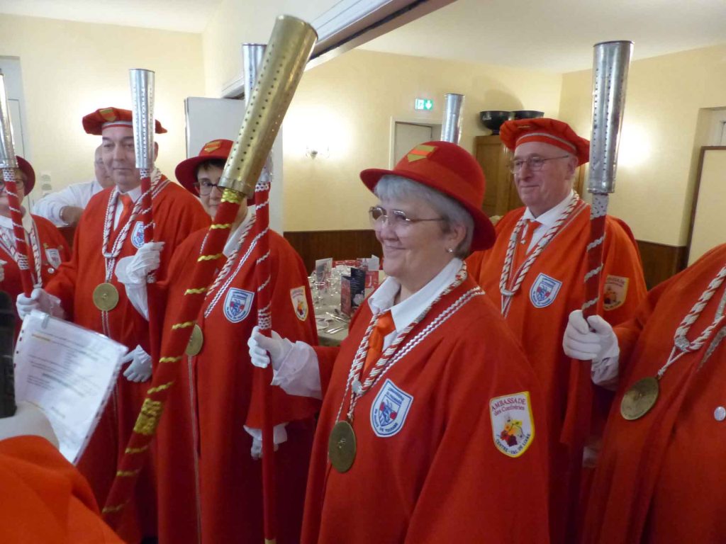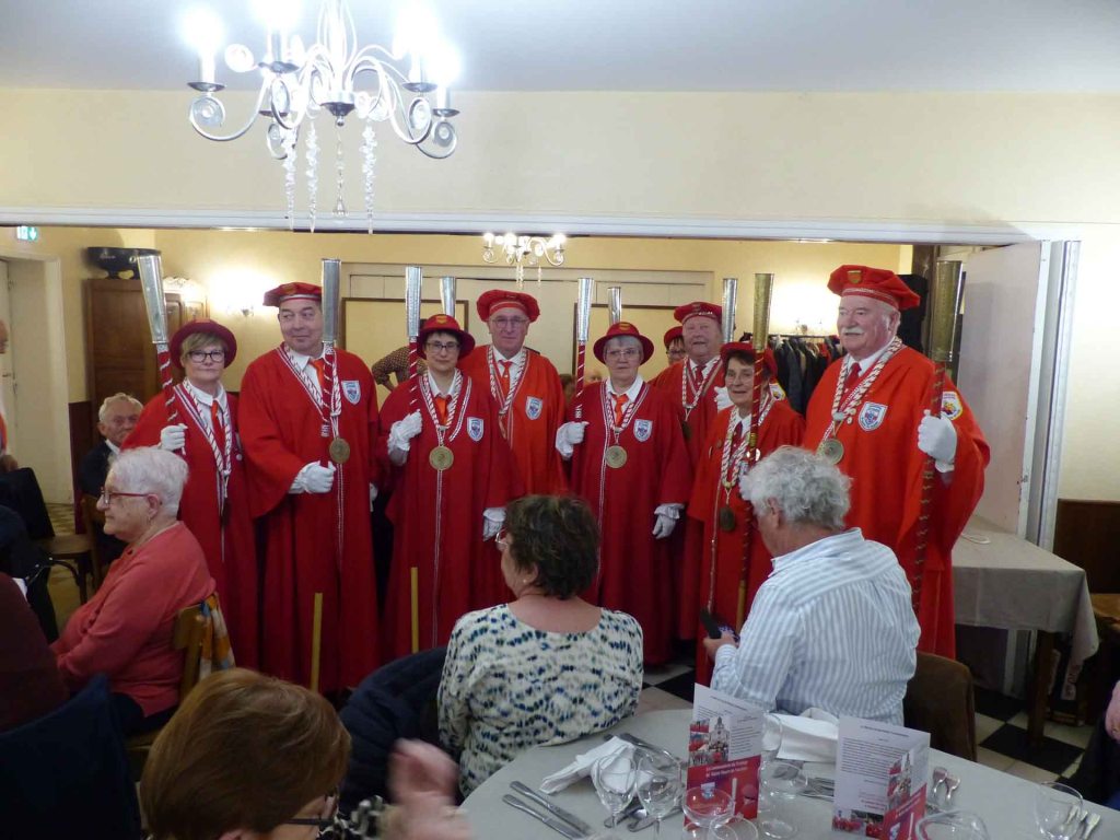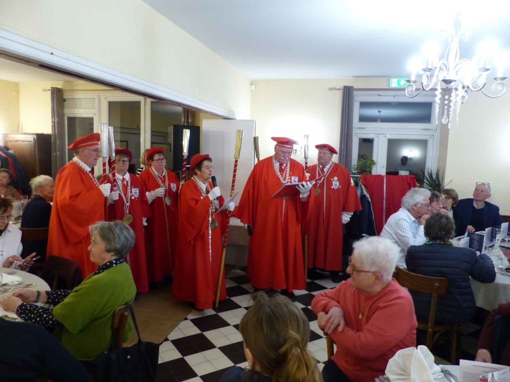 En introduction au traditionnel « Diner entre Nous », qui réunit chaque année après l’Assemblée Générale, Dignitaires et conjoints, notre Grand Maitre Madeleine, a élevé trois Chevaliers au grade de Dignitaire. Ces trois nouveaux Dignitaires, proposés par leur parrain, ont fait l’objet d’une ratification de leur candidature, à bulletins secrets par le Grand Conseil. Au cours du cérémonial spécial, Gérard notre Vice Grand Maître a donné connaissance aux candidats, des règles et préceptes liés à leur engagement, puis tous les trois ont prêté serment « de ne jamais faillir » en prononçant « Je m’engage ». Les parrains sont ensuite invités à revêtir leur filleul (le) de la tenue rouge de La Commanderie. La cravate rouge, les manchettes, la cape, la médaille au double cordon, la coiffe, les gants blancs, constituent la tenue officielle. Madeleine Grand Maitre adoube chaque nouveau Dignitaire « Je suis heureuse de vous recevoir comme Dignitaire au sein de La Commanderie du Fromage de Sainte Maure de Touraine »