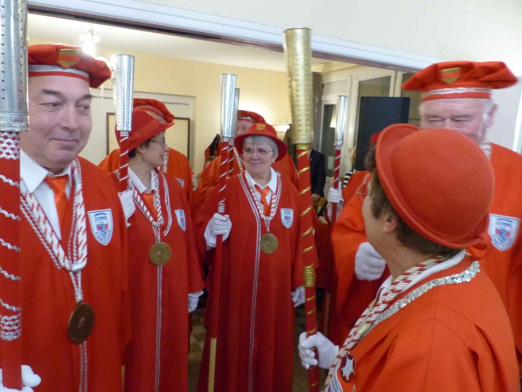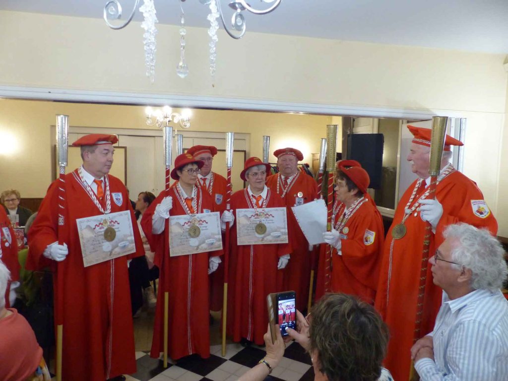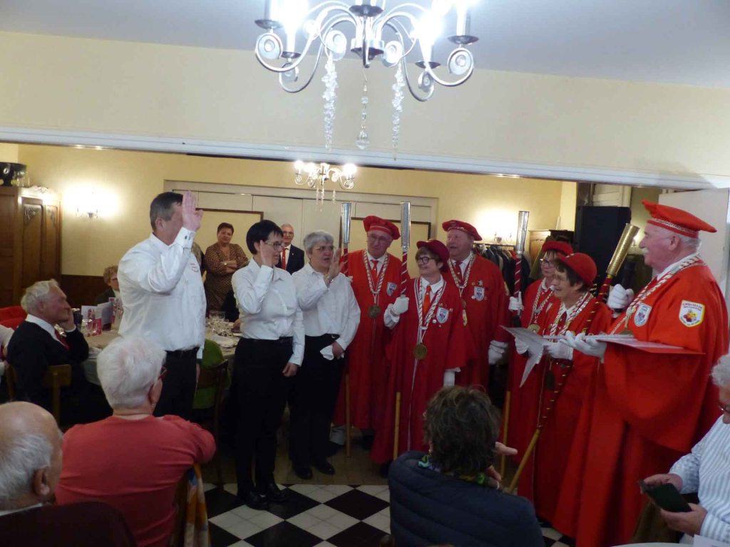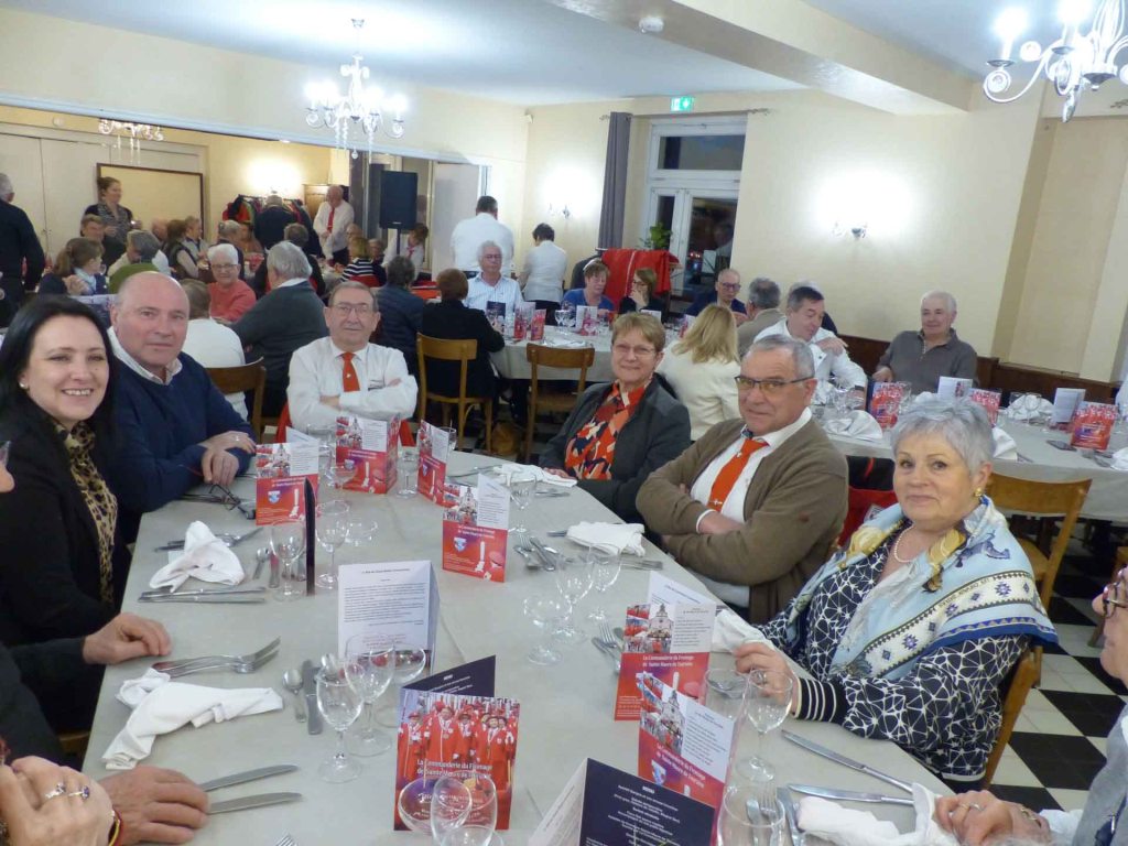 En introduction au traditionnel « Diner entre Nous », qui réunit chaque année après l’Assemblée Générale, Dignitaires et conjoints, notre Grand Maitre Madeleine, a élevé trois Chevaliers au grade de Dignitaire. Ces trois nouveaux Dignitaires, proposés par leur parrain, ont fait l’objet d’une ratification de leur candidature, à bulletins secrets par le Grand Conseil. Au cours du cérémonial spécial, Gérard notre Vice Grand Maître a donné connaissance aux candidats, des règles et préceptes liés à leur engagement, puis tous les trois ont prêté serment « de ne jamais faillir » en prononçant « Je m’engage ». Les parrains sont ensuite invités à revêtir leur filleul (le) de la tenue rouge de La Commanderie. La cravate rouge, les manchettes, la cape, la médaille au double cordon, la coiffe, les gants blancs, constituent la tenue officielle. Madeleine Grand Maitre adoube chaque nouveau Dignitaire « Je suis heureuse de vous recevoir comme Dignitaire au sein de La Commanderie du Fromage de Sainte Maure de Touraine »