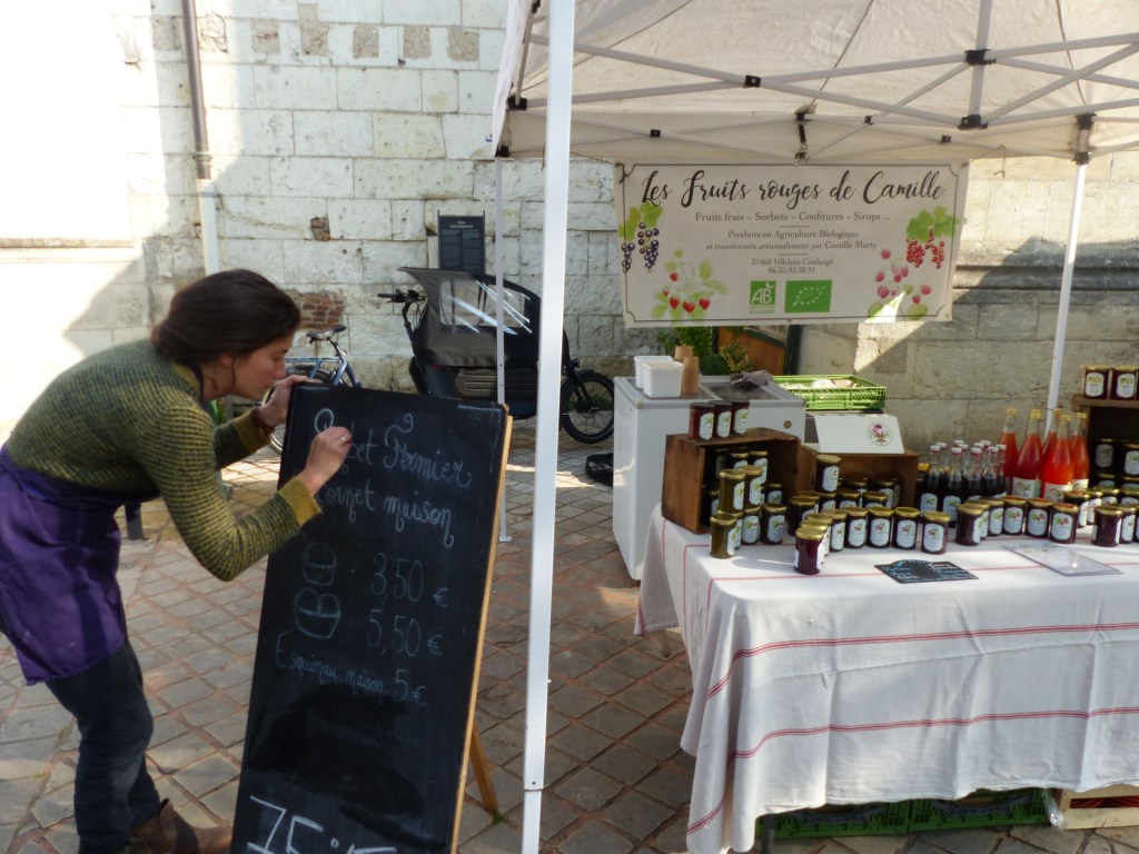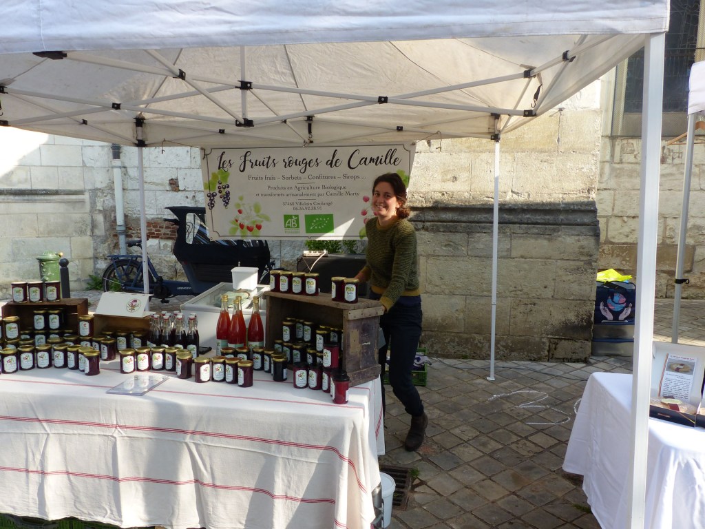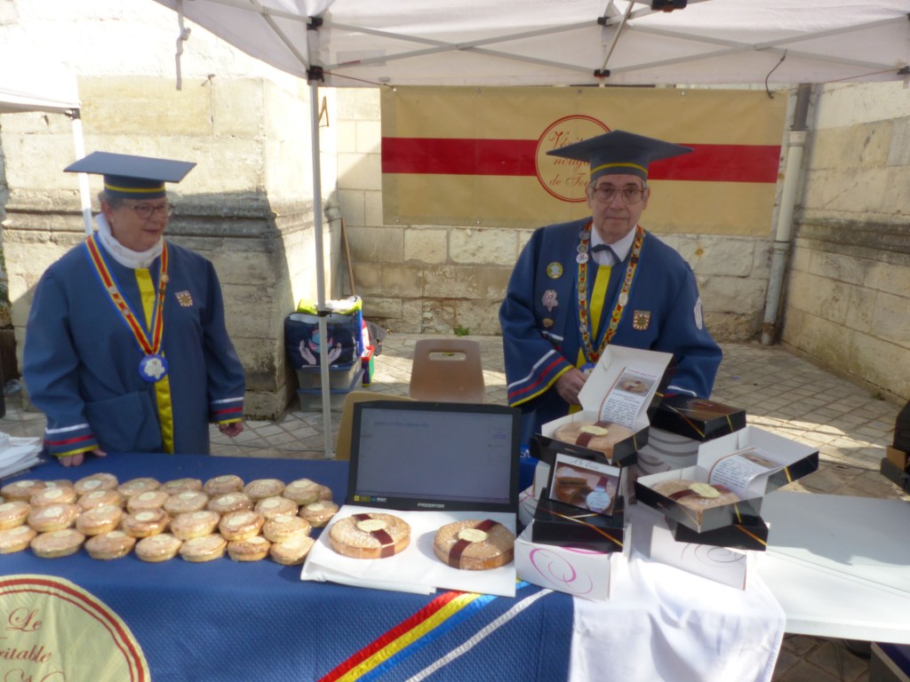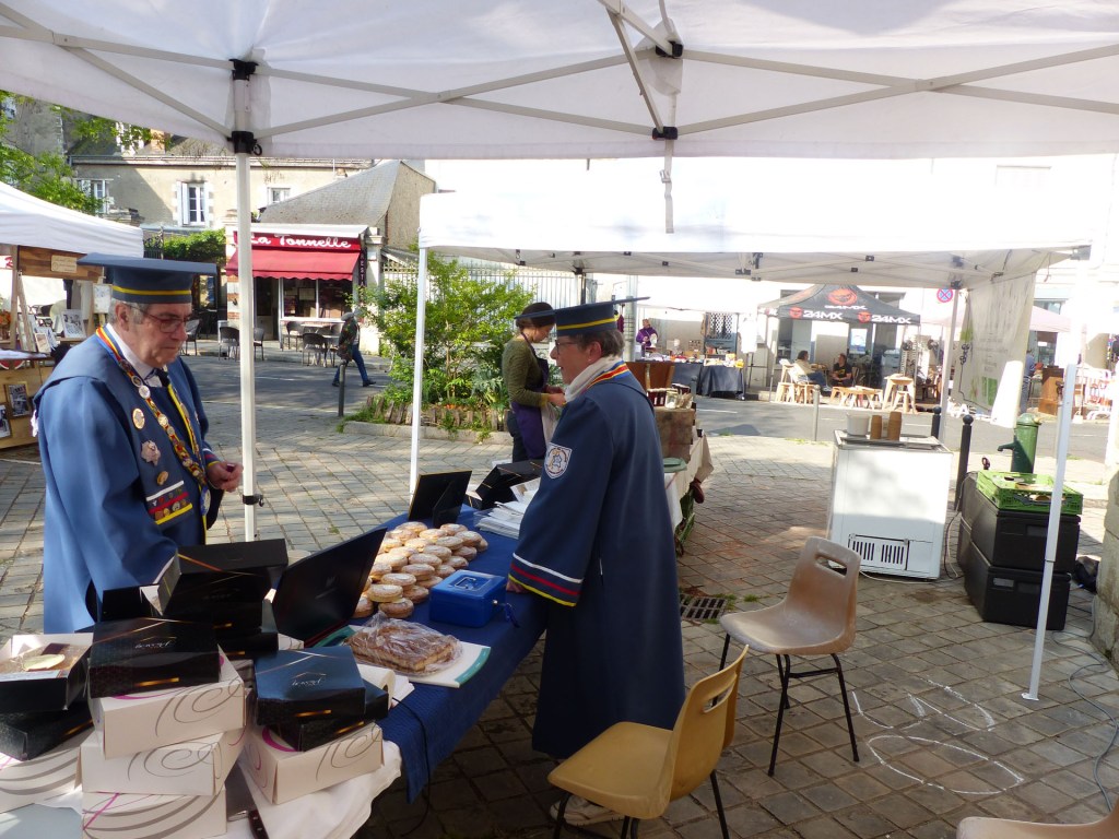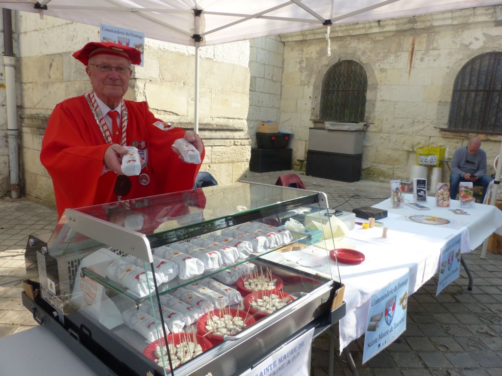 Nous sommes dans la catégorie « Fromages et desserts ». Commençons par « Les Fruits Rouges de Camille », succulentes confitures de myrtilles, cassis, fraises et plus encore, délicieux sorbets, dont le succès s’est révélé sous le soleil de l’après-midi. Autre dessert présenté par nos Confrères du Nougat de Tours, ce délicieux gâteau, qui nous a régalés, facile à transporter et à consommer…… Et bien sûr notre Fromage, en dégustation quasi-continue, tout au long de cette très belle journée. La plupart de nos visiteurs, nous disent, ah ! oui le Ste Maure, nous connaissons ! ce qui nous permet de bien préciser, notre A.O.P. c’est Sainte Maure de Touraine ! Et le dialogue s’installe, cahier des charges, paille pyrogravée au nom et N° d’élevage. Avec chaque interlocuteur, un bel échange, dont la conclusion, après dégustation : J’ai appris quelque chose aujourd’hui !
