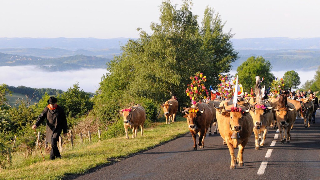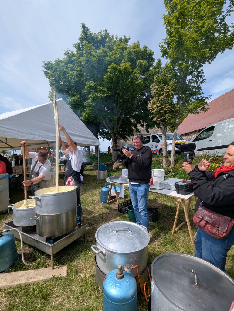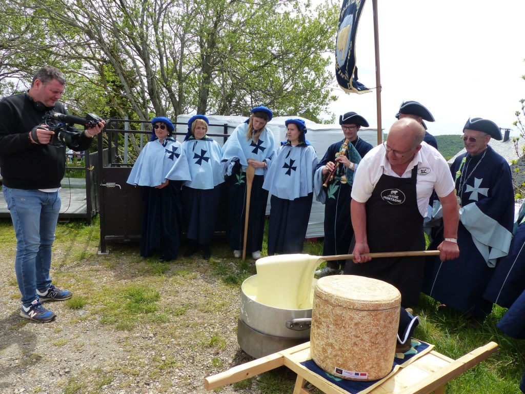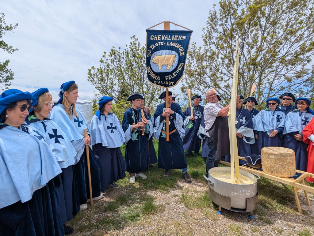 André VALADIER, Fondateur et Président de La Coopérative « Jeune Montagne ». Sur ces paroles fortes et frappées de bon sens de André Valadier, 92 ans, nous avons partagé ces belles journées de fête de la « transhumance » dans le village d’AUBRAC, (altitude 1300m), département de l’Aveyron, avec nos Amis de la Confrérie du Taste Fourme de Laguiole et Grands Fileurs d’Aligot de l’Aubrac. Nous les avions reçus à Sainte Maure de Touraine, pour la Foire aux Fromages des 1er et 2 juin 2024. Nous sommes chargés de renouveler leurs remerciements pour l’accueil des familles du Comité de Jumelage, du public et de La Commanderie. Chaque année autour du 25 mai, les éleveurs conduisent leurs troupeaux de race Aubrac et Simmenthal, dans les estives d’altitude, pour se nourrir de cette riche flore, favorable à la production d’un lait riche en protéïnes et matière grasse, pour nourrir leurs veaux qui les suivent et fournir le lait qui va permettre à la Coopérative, basée à LAGUIOLE (prononcer layole), de produire 650 tonnes de tomme qui vont être affinées plusieurs mois. Quatre mois minima pour obtenir l’A.O.P. Laguiole. Et 1200 tonnes de tomme fraiche destinée à la production de « l’Aligot », de « la Truffade », et autres préparations culinaires.