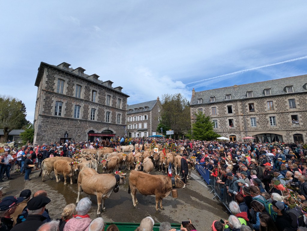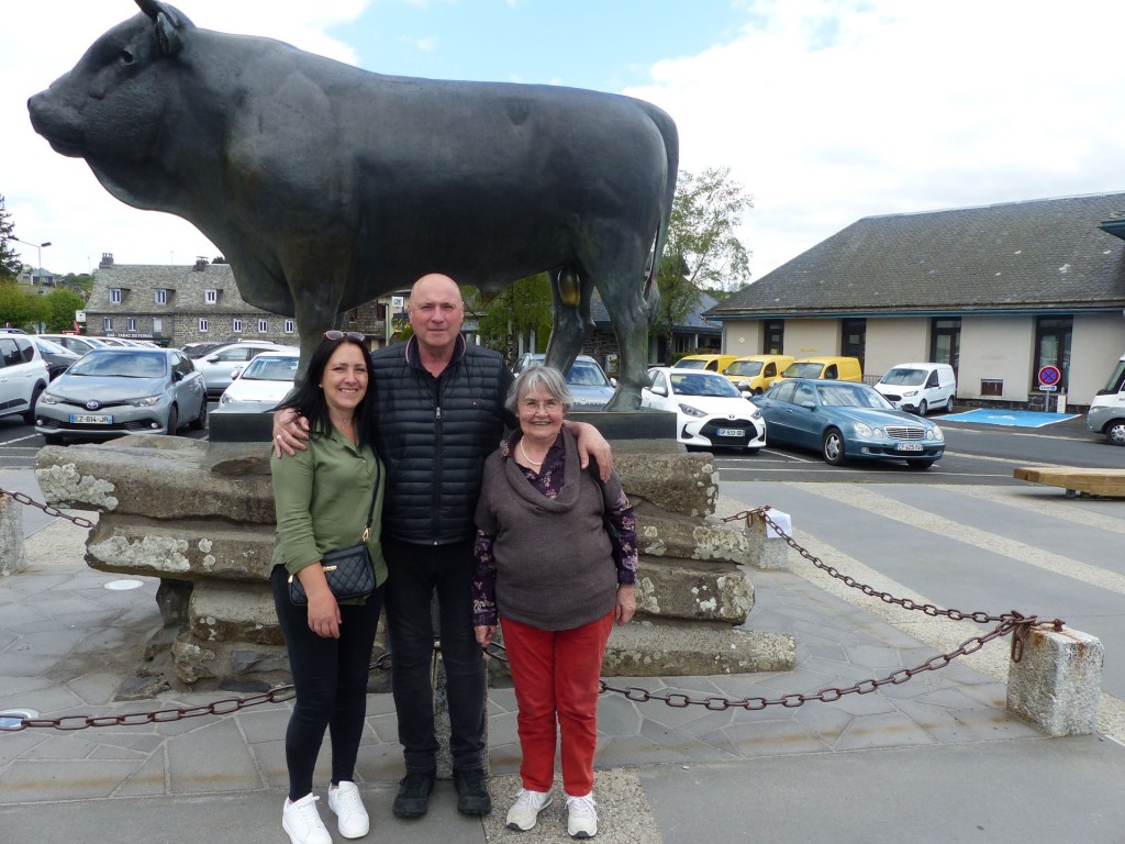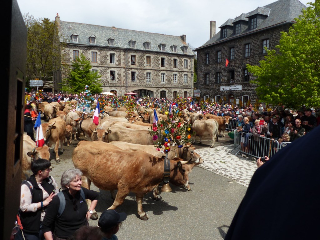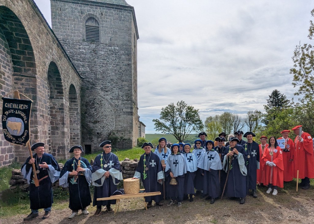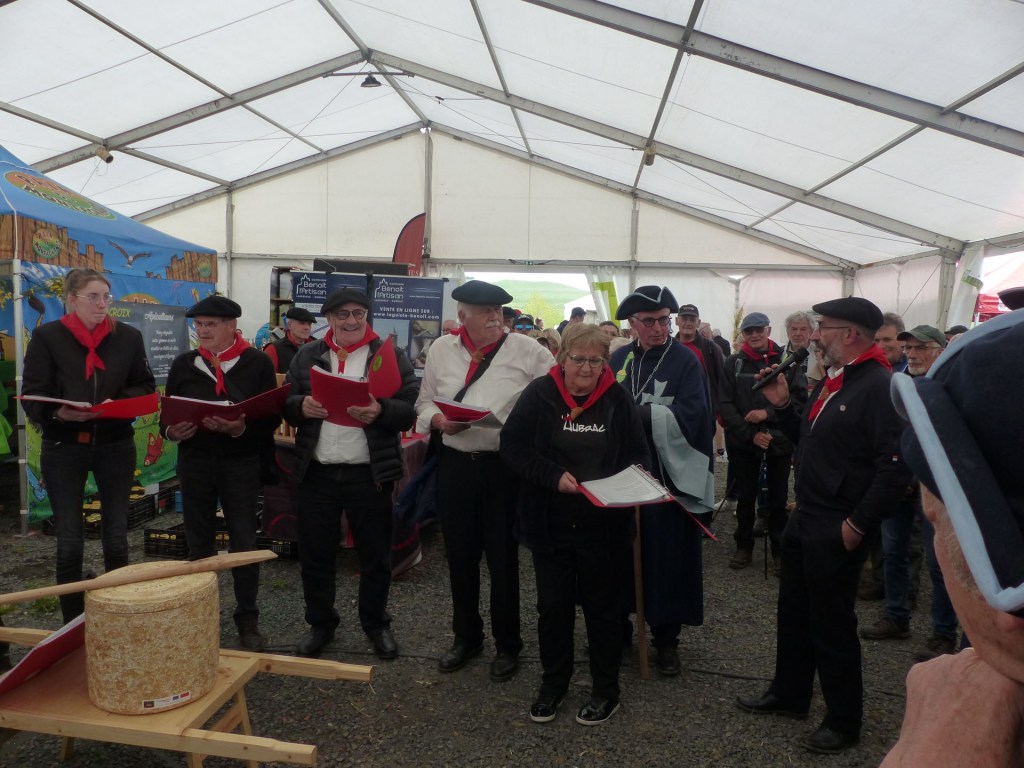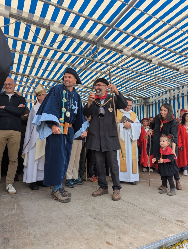 Après la Grand-Messe, chantée et accompagnée, les 2 Confréries ont rejoint la place et le podium où les personnalités avaient pris place, entourant l’Evêque qui a prononcé la bénédiction des troupeaux, devant la foule massée autour des barrières. Les prises de parole se sont succédées, élus, Maire, Député, Sénateur, interventions conclues par Madame Claire Chauffour-Rouillard, Préfète du département depuis le 6 novembre 2024. La cérémonie terminée, nous avons de nouveau déambulé à travers les stands, puis nous avons partagé le plateau offert par nos amis, dont le plat principal, devinez ? ….Aligot et brochette d’Aubrac savoureuse et tendre, suivi de la tomme de Laguiole et de la tarte aux pommes.