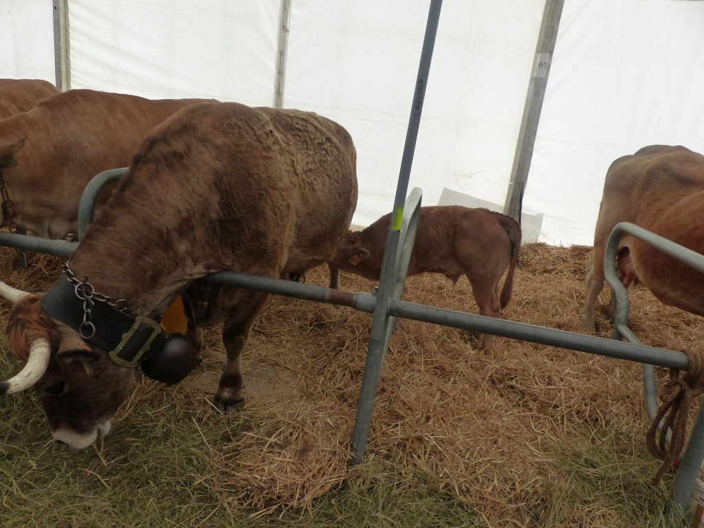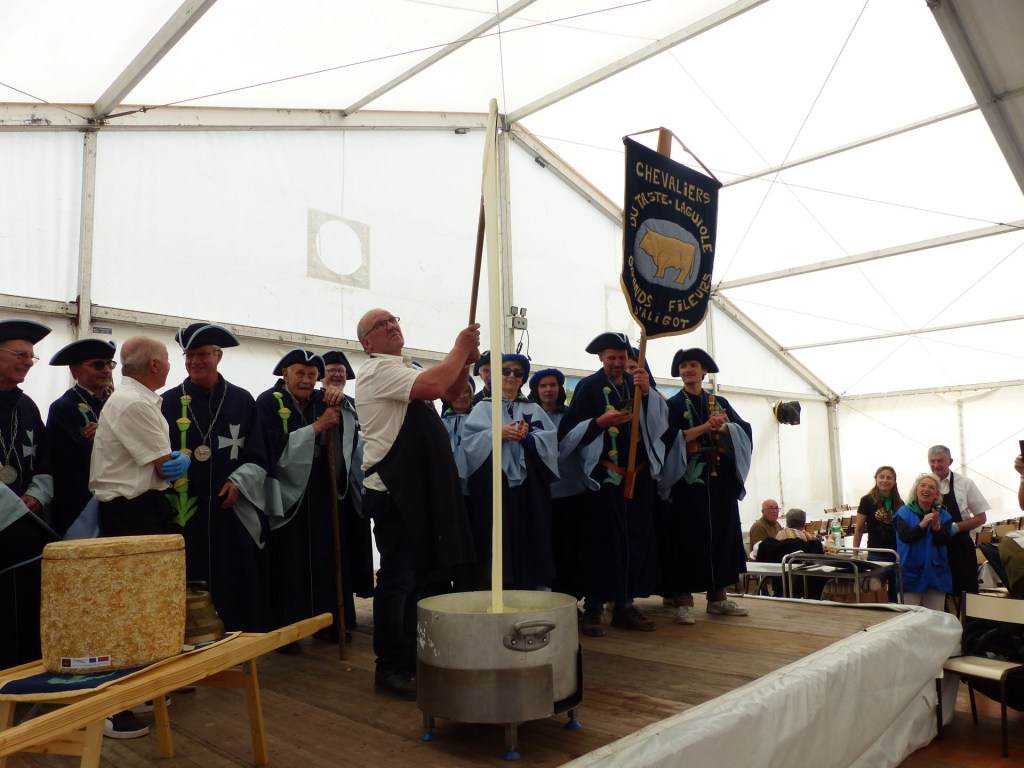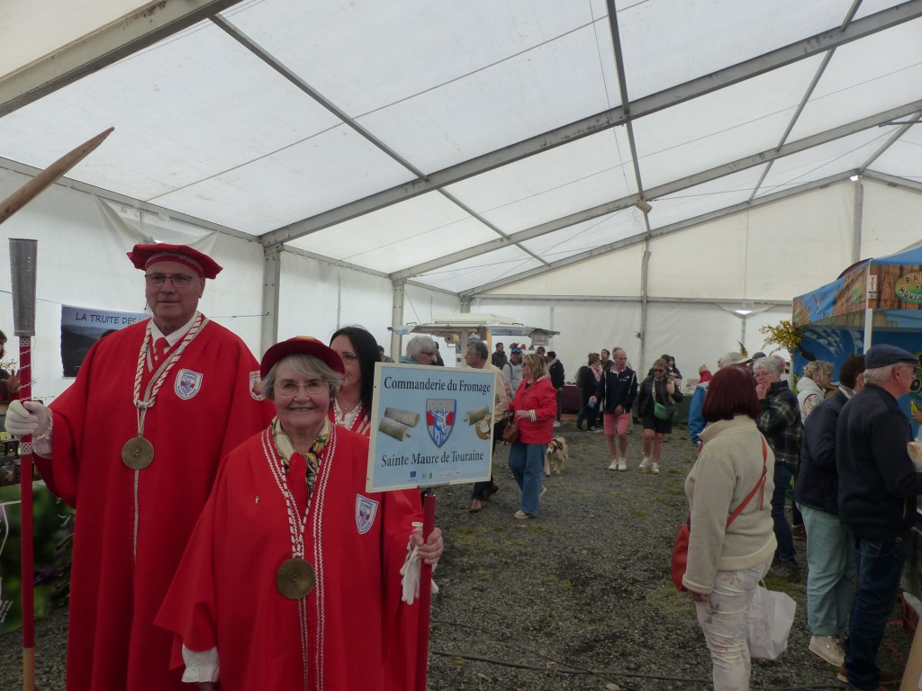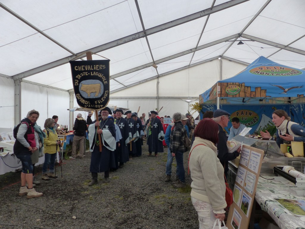 La grande place du village est entourée de barrières, qui permettent au public de découvrir chaque troupeau, par passages réguliers tout au long de la journée du dimanche. C’est un beau spectacle de voir ces vaches, munies d’un collier en cuir large, auquel la cloche est suspendue et surmonté pour l’occasion d’un « arbre » de fleurs en papier crépon et souvent d’un drapeau aux couleurs de La France. Nous avons défilé dans le site du marché des producteurs, avec la Confrérie de Laguiole, le samedi après midi et le dimanche depuis le matin. Après un tour des stands, l’animation étant assurée par notre Confrère Bernard Primois, pour donner les informations aux visiteurs. Beaucoup de visiteurs sont venus vers nous, nous disant : Ste Maure de Touraine, nous sommes voisins, nous venons de la Sarthe, de la Mayenne, de La Vienne, des Charentes, mais aussi de Richelieu, de Amboise, de Tours etc….