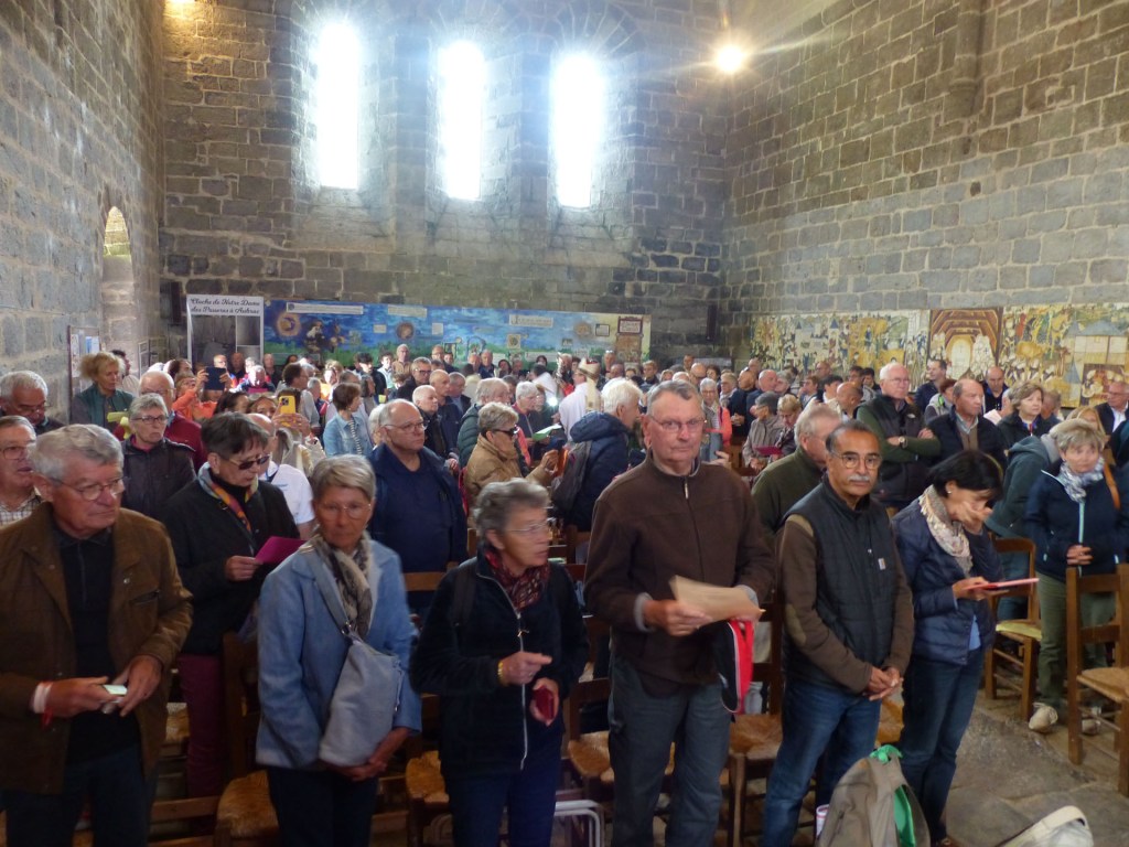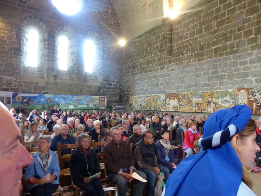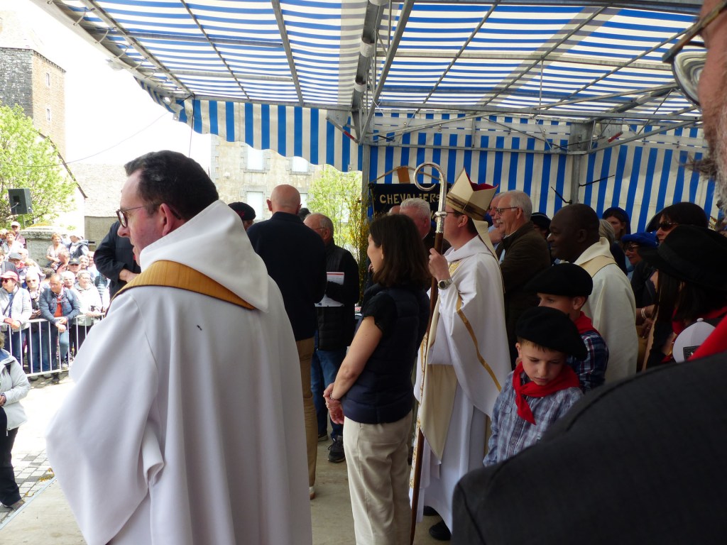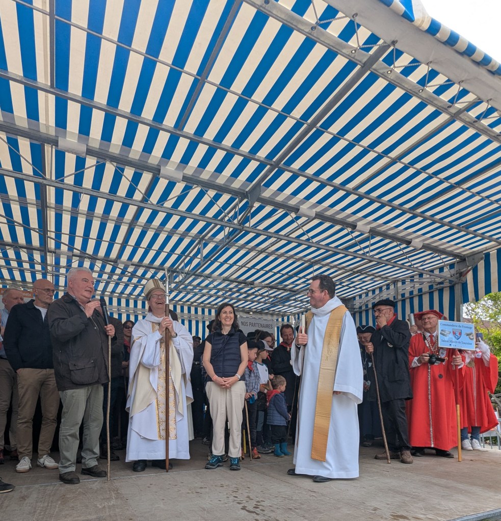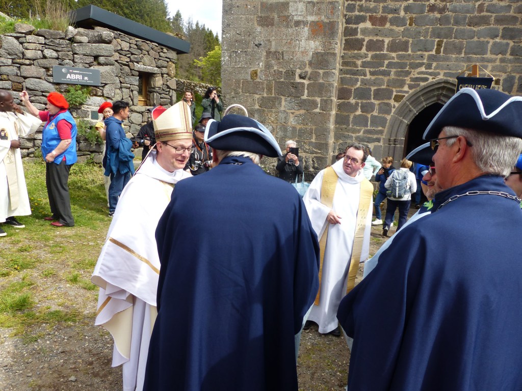 Le premier défilé, nous conduit à « La Domerie », l’église, tenue au 10ème siècle par une communauté de Moines Hospitaliers qui accueillaient, soignaient, nourrissaient les nombreux pèlerins allant vers Compostelle, heureux de trouver un lieu pour se restaurer sur cet immense plateau d’Aubrac. Sur l’esplanade de la Domerie, nous sommes accueillis par Monseigneur Luc Meyer, Evêque de Rodez et Vabres, ordonné Evêque de Rodez le 17 septembre 2022, accompagné de Monsieur le Curé de la paroisse et d’un prêtre Africain, pour lequel cette fête était une découverte, redisant à son Confrère : Que c’est beau, que c’est beau !