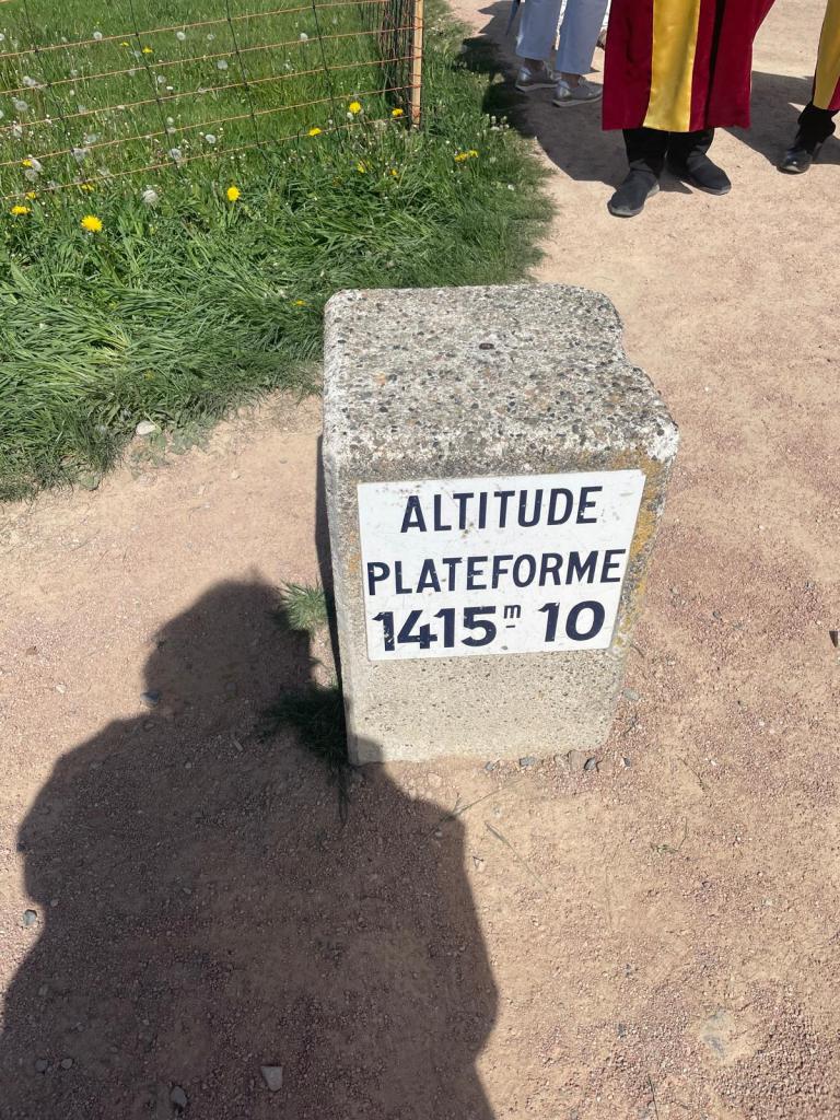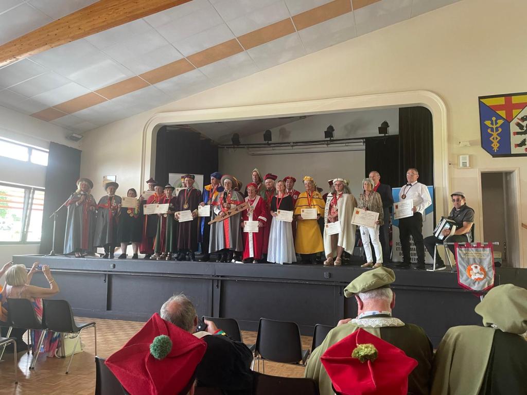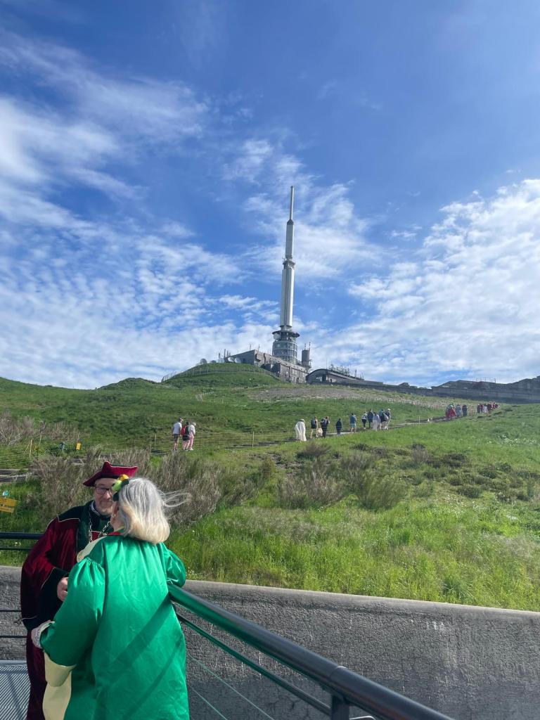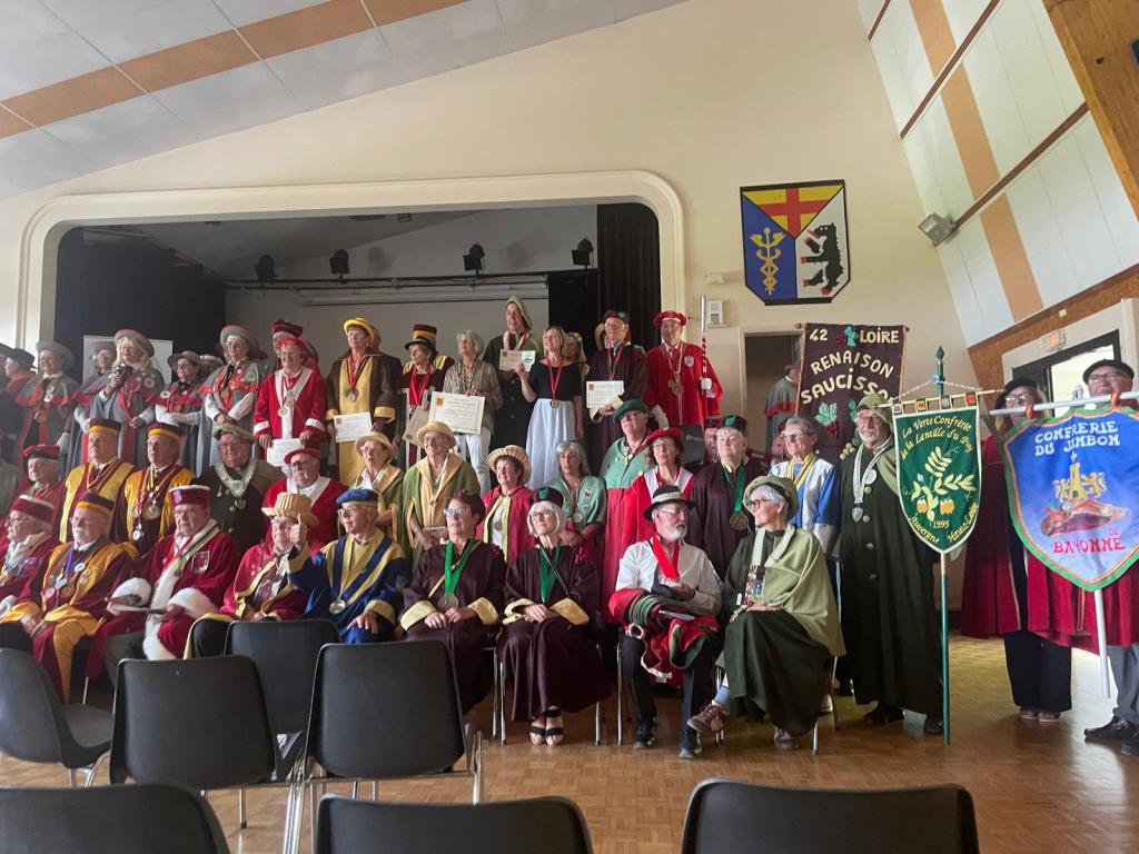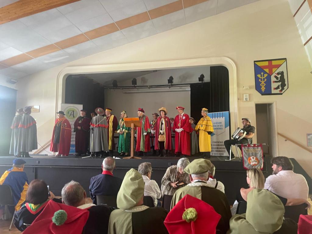 A l’issu d’une copieuse collation et après avoir revêtu nos habits d’apparat, icônes de nos traditions respectives, nous partîmes, avec 28 autres confréries, à l’assaut du Géant du parc des volcans d’Auvergne par « Le Panoramique des Dômes », un funiculaire électrique à crémaillère qui permet l’accès au sommet du Puy de Dôme, culminant à 1 465 m. La journée se poursuivit avec l’ouverture du chapitre par le Grand Commandeur, les intronisations ; moment solennel où j’eus le privilège de me faire adouber et devenir « Gourmandin d’honneur » ; puis par un repas regroupant autour de la table plus de 120 convives qui ont particulièrement apprécié la dégustation de notre buche d’argent. Pour la première fois, la Commanderie du fromage de Sainte-Maure-de-Touraine était représentée aux côtés de nos consœurs et confrères, à la tenue aux couleurs des volcans qui, comme nous, promeuvent et défendent un patrimoine culinaire singulier : celui du fromage.