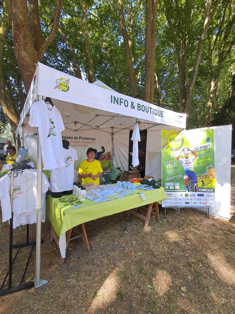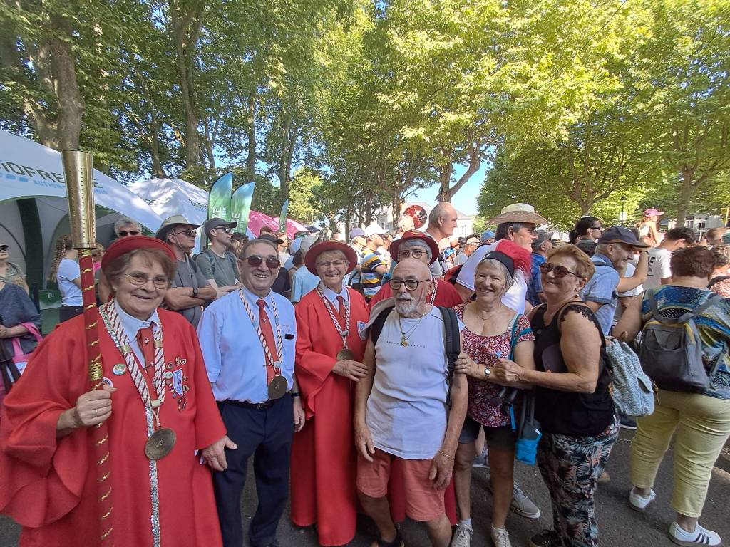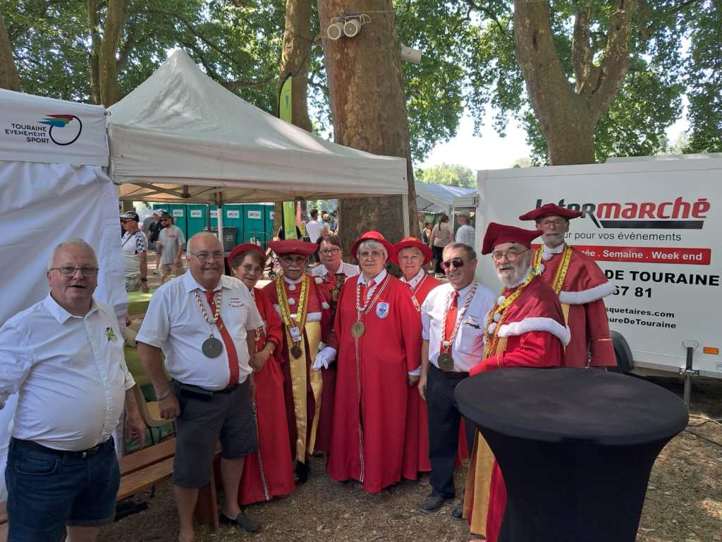 Chinon, petite ville au grand renom, expression empruntée à François Rabelais natif du chinonnais, illustre parfaitement la cité médiévale. Chinon dominé par sa forteresse royale, son centre-ville imprégné d’histoire, et remarquable par son emplacement en bordure de Vienne au coeur du Val de Loire fait partie du périmètre classé au patrimoine mondial de l’ UNESCO sans oublier l’étendue de son célèbre vignoble avec ses vins AOP de Chinon connus dans le monde entier. Suite à la demande de Bernard Machefer, la Commanderie en tant que partenaire de la Roue Tourangelle se devait d’être représentée à cette journée de départ de la 9ème étape du Tour de France de 174 km. Départ fictif de l’incontournable caravane publicitaire à 11h10 suivie par les coureurs à 13h10 pour le véritable départ à Anché, puis Champigny sur Veude, Richelieu, Preuilly sur Claise, etc avant l’arrivée à Chateauroux. Nous sommes arrivés au parking de la Belle Laveuse à 8h pour rejoindre le village festif à 900 m sur la remarquable promenade des Drs Mattraits très ombragée avec ses platanes centenaires ou était placé le stand de la Roue Tourangelle.Village important avec restauration, buvettes, des ateliers dédiés au cirque, au vélo, à la boule de fort,etc , stands de produits locaux, de ventes de vélos et réparations de vélos, d’artisanat, 2 écrans géants pour suivre l’étape du jour. Après avoir pris un café offert ou vin ou autre boisson accompagnés de délicieuses chouquettes, nous avons préparé les plateaux de fromages pour permettre aux bénévoles de la Roue d’accueillir les partenaires de la Roue Tourangelle au stand tout au long de la journée. En complément de nombreux plateaux garnis préparés par leurs soins. Ayant la permission de Didier pour quitter le stand, nous en avons profité pour faire un tour en tenue pour faire la promotion de notre fromage le long des quais où arrivait une foule de nombreux visiteurs heureux de se retrouver à l’ombre par une belle journée ensoleillée pour participer à cet évènement exceptionnel; nous avons rencontré des gens de partout (Australie, Angleterre) et avons pu communiquer avec eux grâce à l’anglais de Ghislaine. La radio Ici Touraine nous a fait passer en direct et France 3 nous a posé des questions sur notre fromage et notre raison d’être présents avant notre rencontre imprévue avec Gérard (Grand Maître des Rillons et Rillettes de Tours) et Ginette venus en visiteurs sans leurs capes mais avec des ornements bleu, blanc, rouge pour défendre les couleurs de la France.