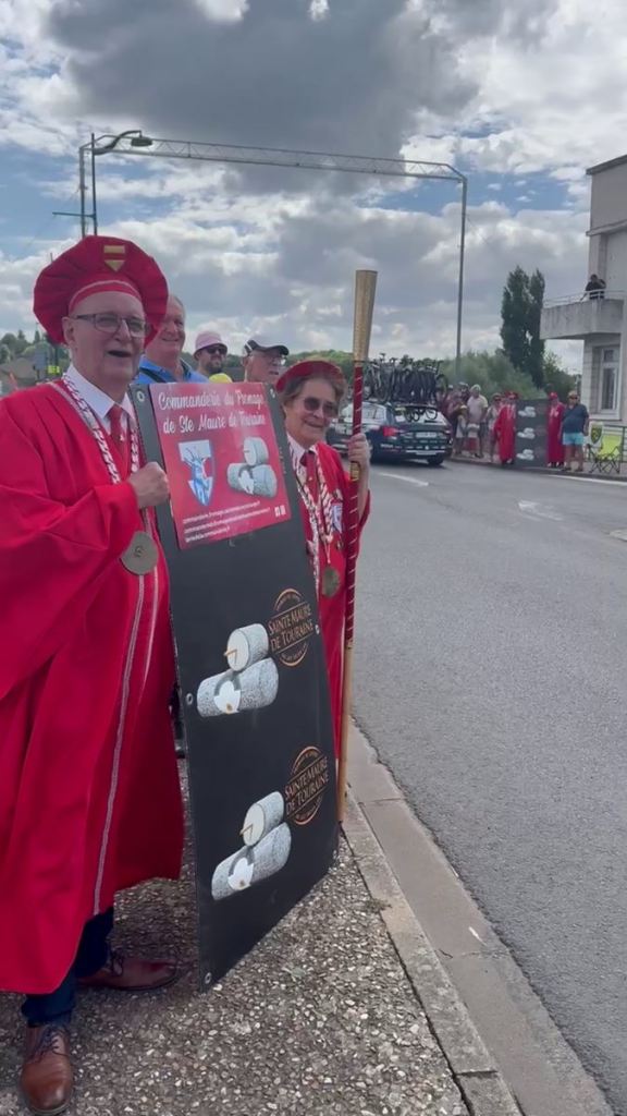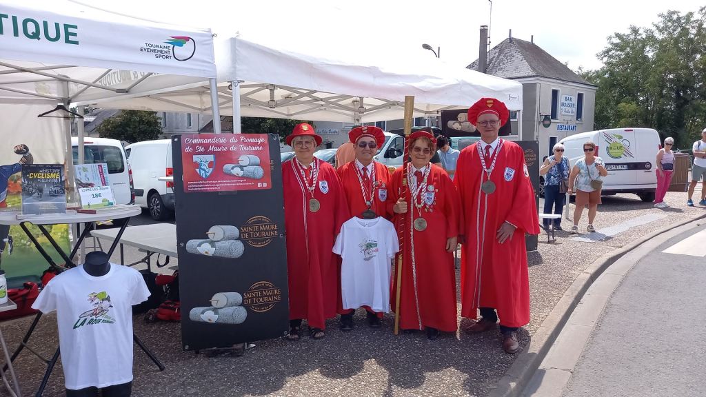 Par cette belle journée ensoleillée du mardi 29 juillet, comme promis, nous sommes allés à 4 dignitaires rejoindre à 13h notre confrère et ami Bernard Machefer président de la Roue Tourangelle pour promouvoir le Sainte-Maure de Touraine AOP lors du passage du Tour de France Féminin à l’Ile Bouchard. Sur l’île entre les 2 ponts en bordure de route, les 2 stands de la Roue Tourangelle étaient installés pour offrir le verre de l’amitié accompagné de dés de melon, de galettes et de nos toasts au fromage de chèvre, et aussi vente de maillots, de tasses, etc imprimés avec Rustine, la chèvre mascotte de la Roue Tourangelle. Bernard a fait la part belle au Sainte-Maure de Touraine en mettant de grands panneaux dédiés à ce fromage d’exception de chaque côté de la route. En face de nous, le chapiteau de la mairie de l’Ile Bouchard avec buvette pour désaltérer le public nombreux venu assister à ce passage du Tour de France, des passionnés de vélo, des voisins, des curieux, des scouts, etc. Mme Nathalie Vigneau, Maire de cette commune était ravie et fière de cet évènement qui de mémoires d’habitants n’avait pas encore eu lieu.