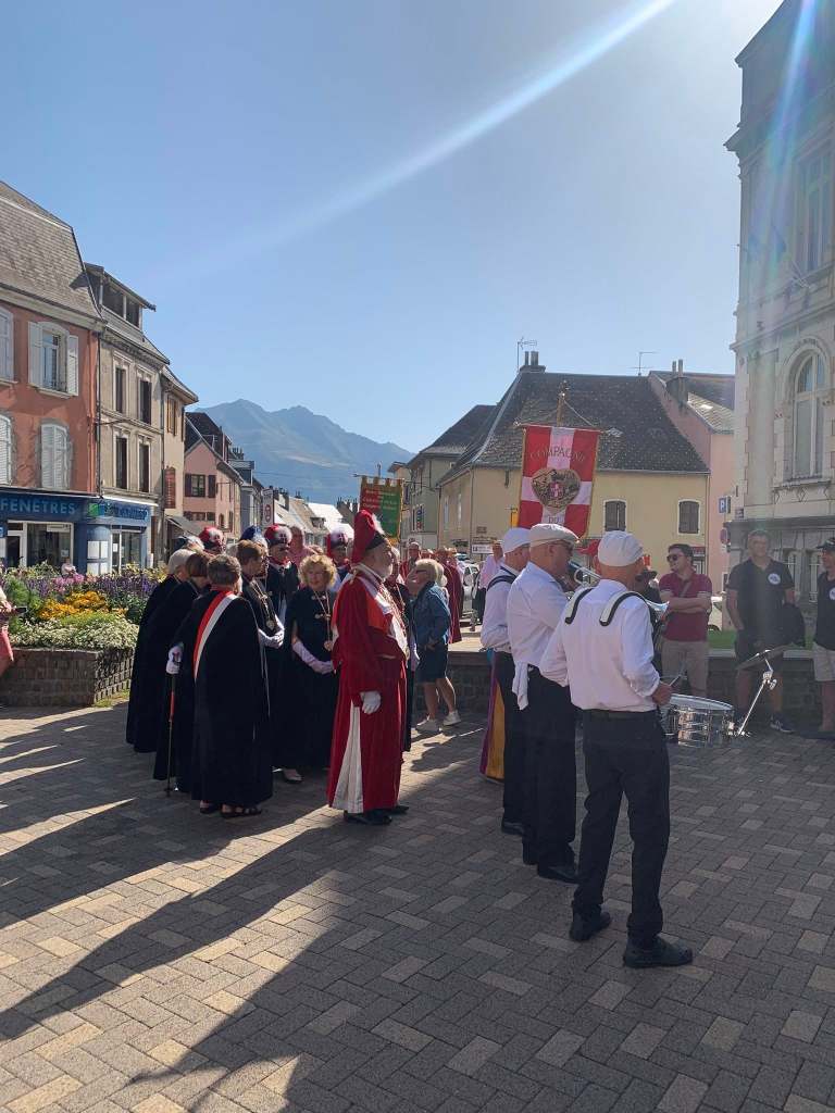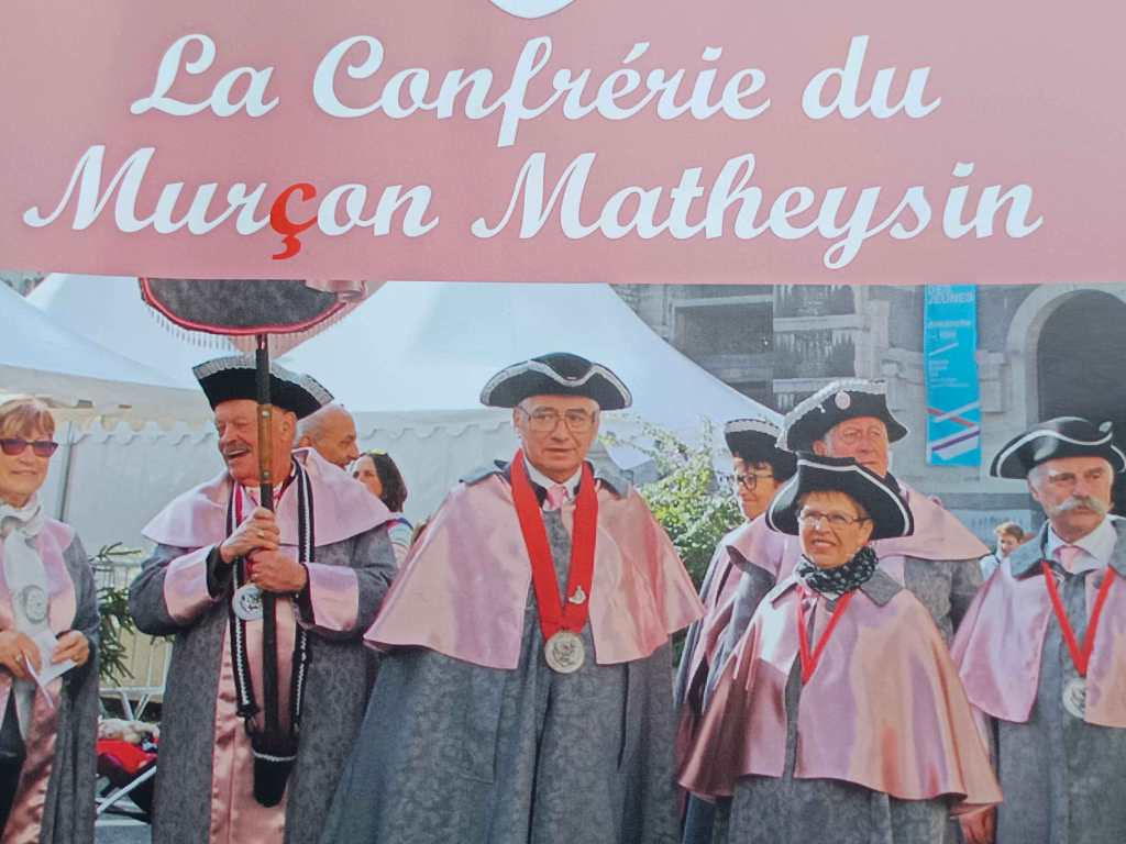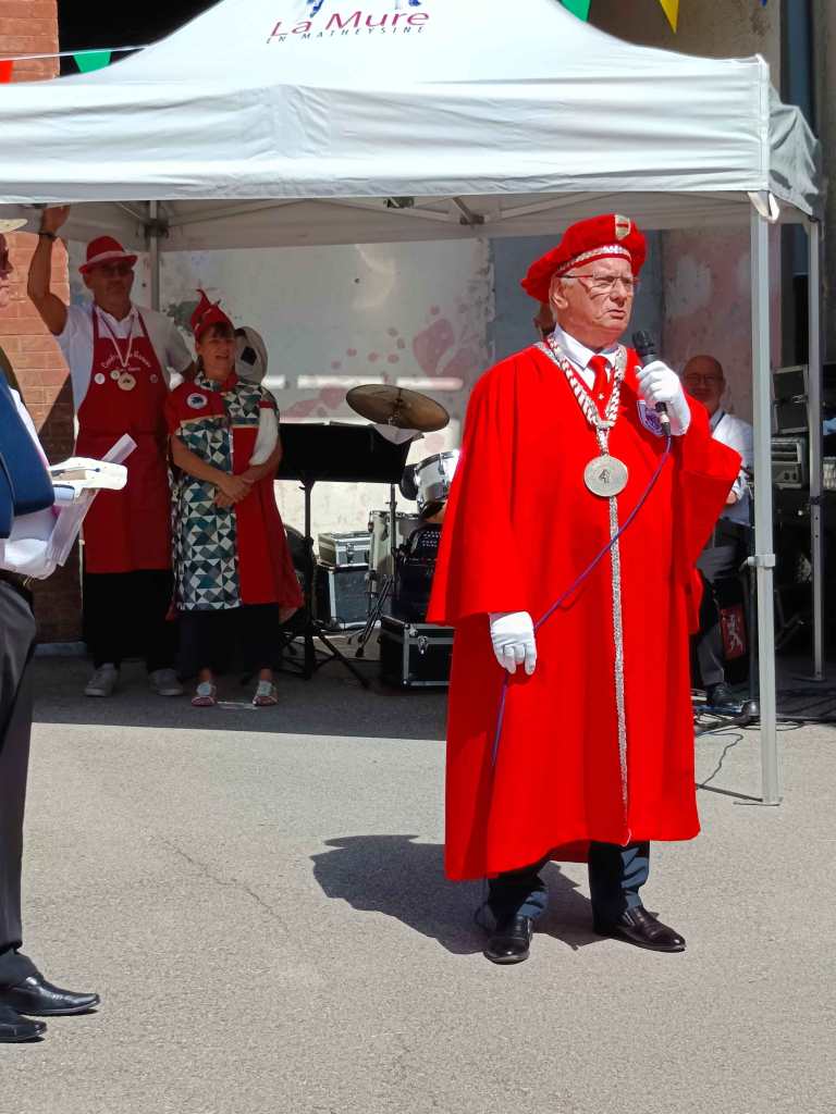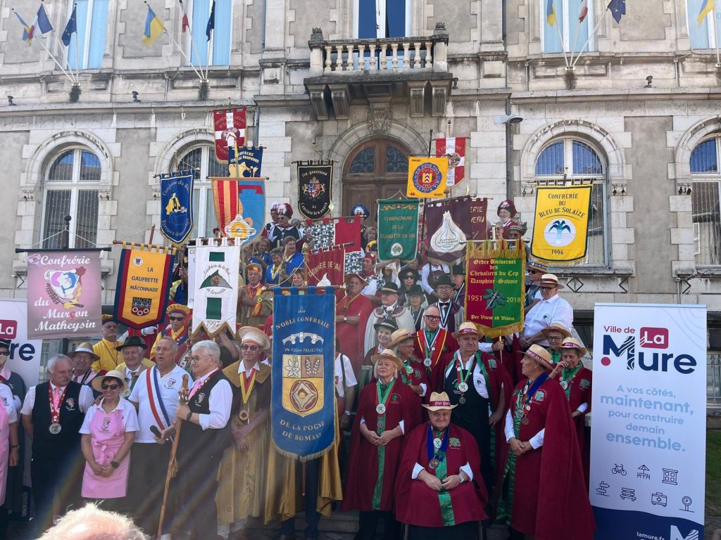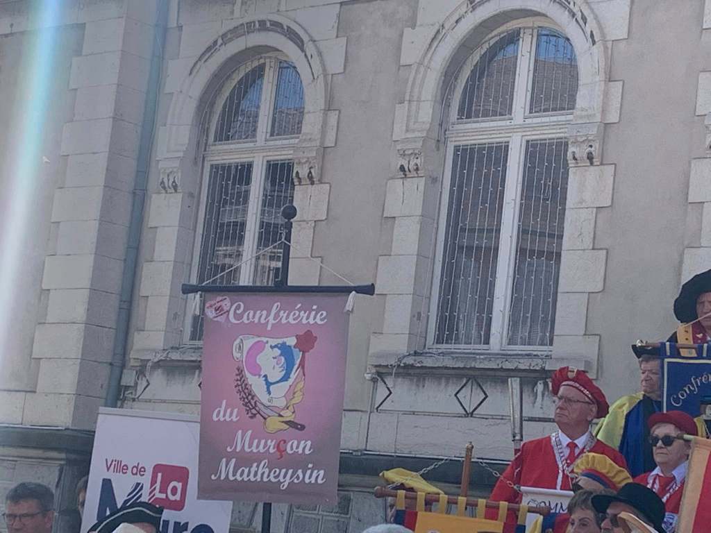 C’est sous une chaleur torride que nous sommes arrivés, la veille du chapitre, à LA MURE (Isère) invités par la Confrérie du Murçon Matheysin (saucisson à cuire). Nous avons dormi et mangé les deux soirs dans un internat proposé par la confrérie. Cette initiative nous a permis de rencontrer et connaître une vingtaine de confréries aux repas du soir (JB. a pu faire ont été appréciés). Rendez-vous le lendemain pour le petit déjeuner dans la cour d’une école maternelle. Présentation de la trentaine de confréries présentes avant le défilé en ville (nous étions les seuls hors région), puis bénédiction à l’église par le prêtre. Retour à notre point de départ où nous avons pris l’apéritif (kir) avec dégustation de Murçon, bien mérité vu la chaleur étouffante. Ensuite le repas fut servi sous chapiteau au même endroit, suivi des intronisations où JB a présenté notre Commanderie.