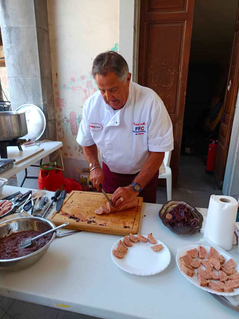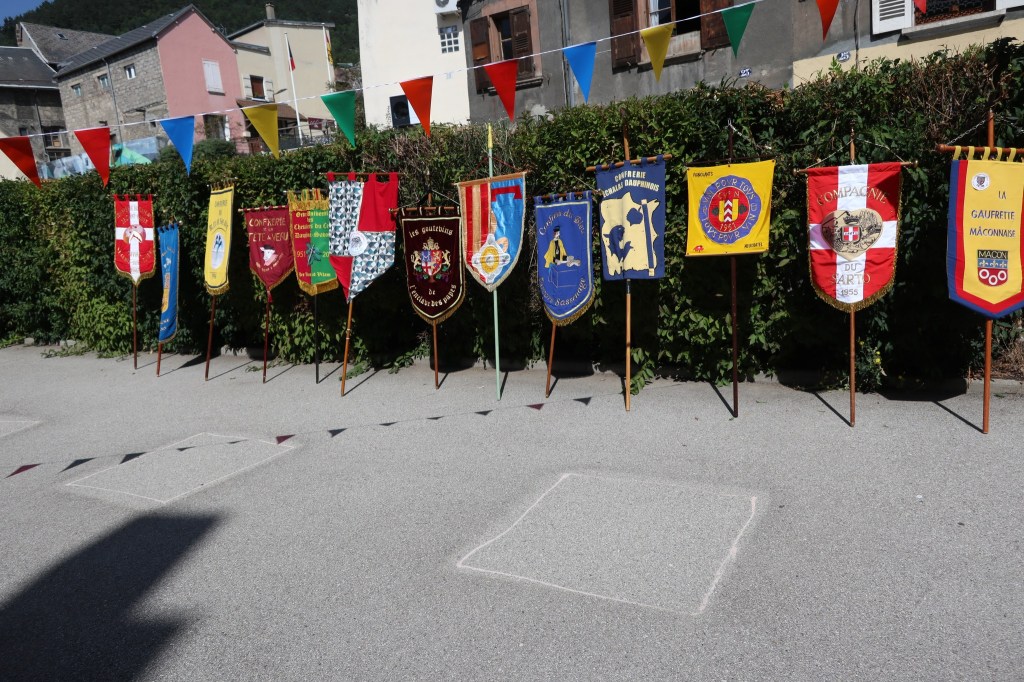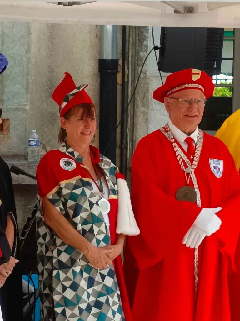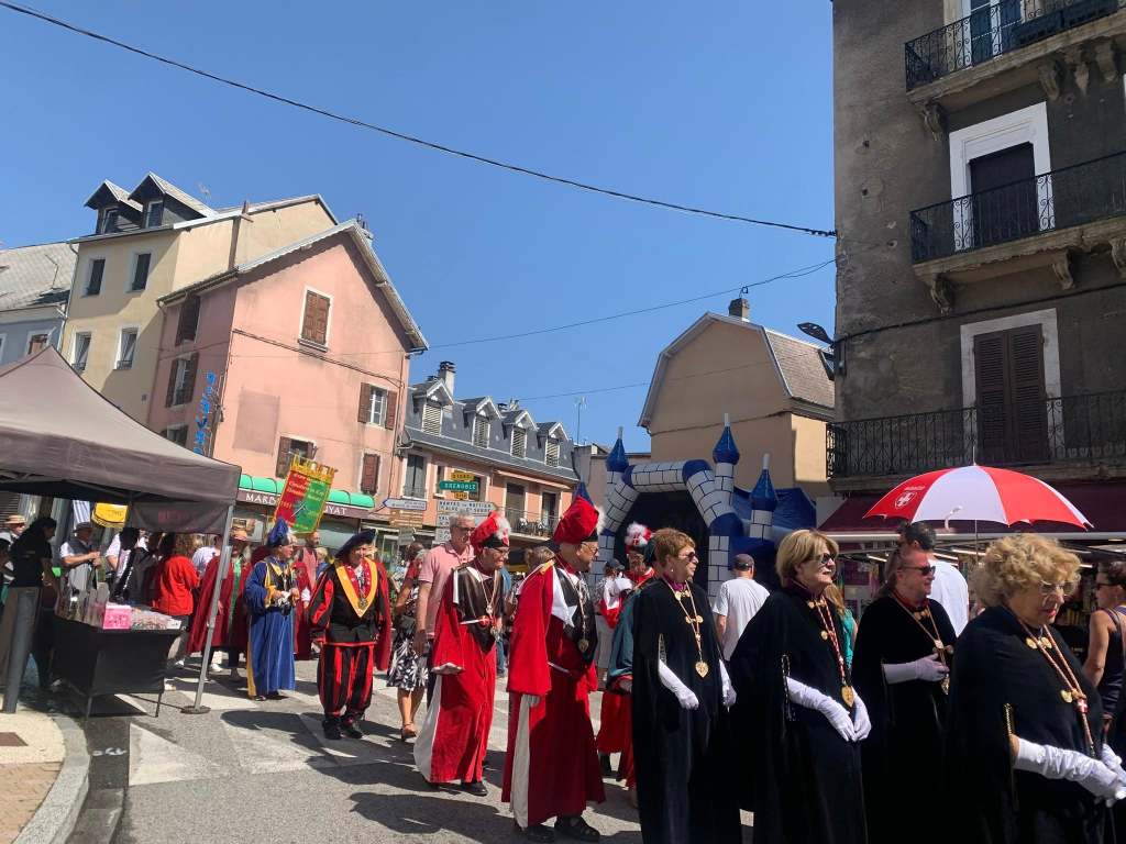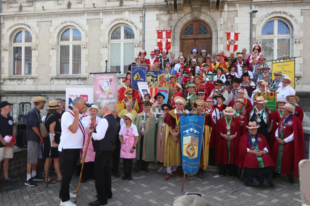 C’est sous une chaleur torride que nous sommes arrivés, la veille du chapitre, à LA MURE (Isère) invités par la Confrérie du Murçon Matheysin (saucisson à cuire). Nous avons dormi et mangé les deux soirs dans un internat proposé par la confrérie. Cette initiative nous a permis de rencontrer et connaître une vingtaine de confréries aux repas du soir (JB. a pu faire ont été appréciés). Rendez-vous le lendemain pour le petit déjeuner dans la cour d’une école maternelle. Présentation de la trentaine de confréries présentes avant le défilé en ville (nous étions les seuls hors région), puis bénédiction à l’église par le prêtre. Retour à notre point de départ où nous avons pris l’apéritif (kir) avec dégustation de Murçon, bien mérité vu la chaleur étouffante. Ensuite le repas fut servi sous chapiteau au même endroit, suivi des intronisations où JB a présenté notre Commanderie.