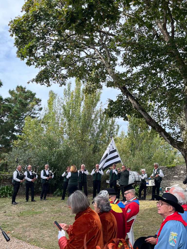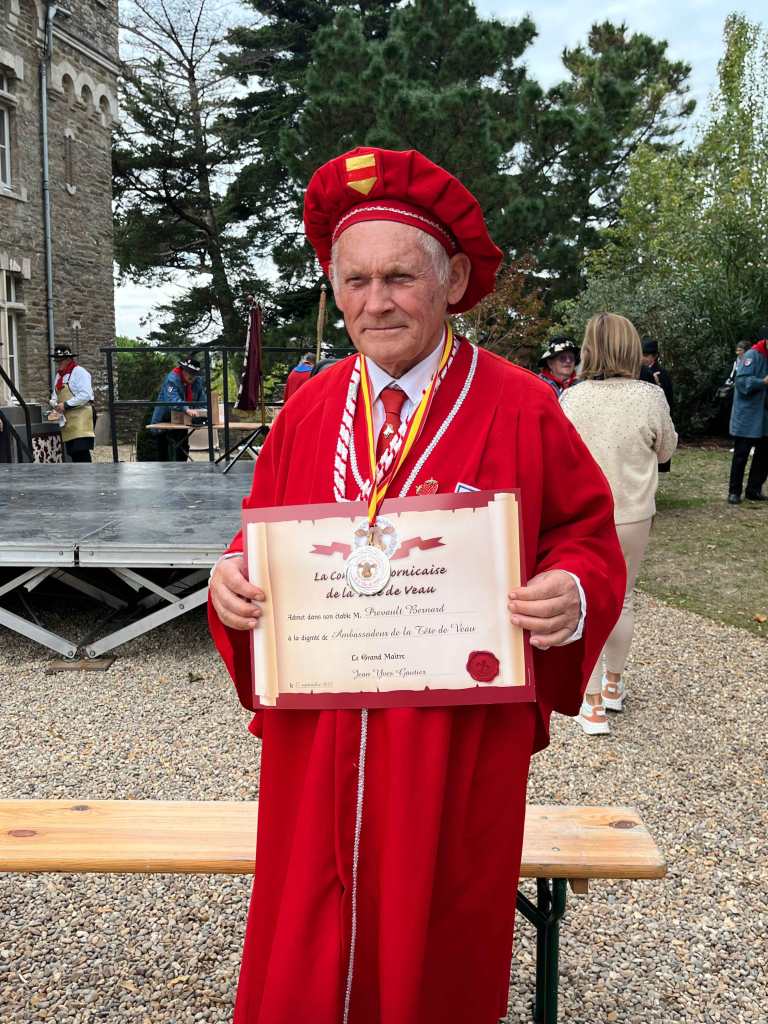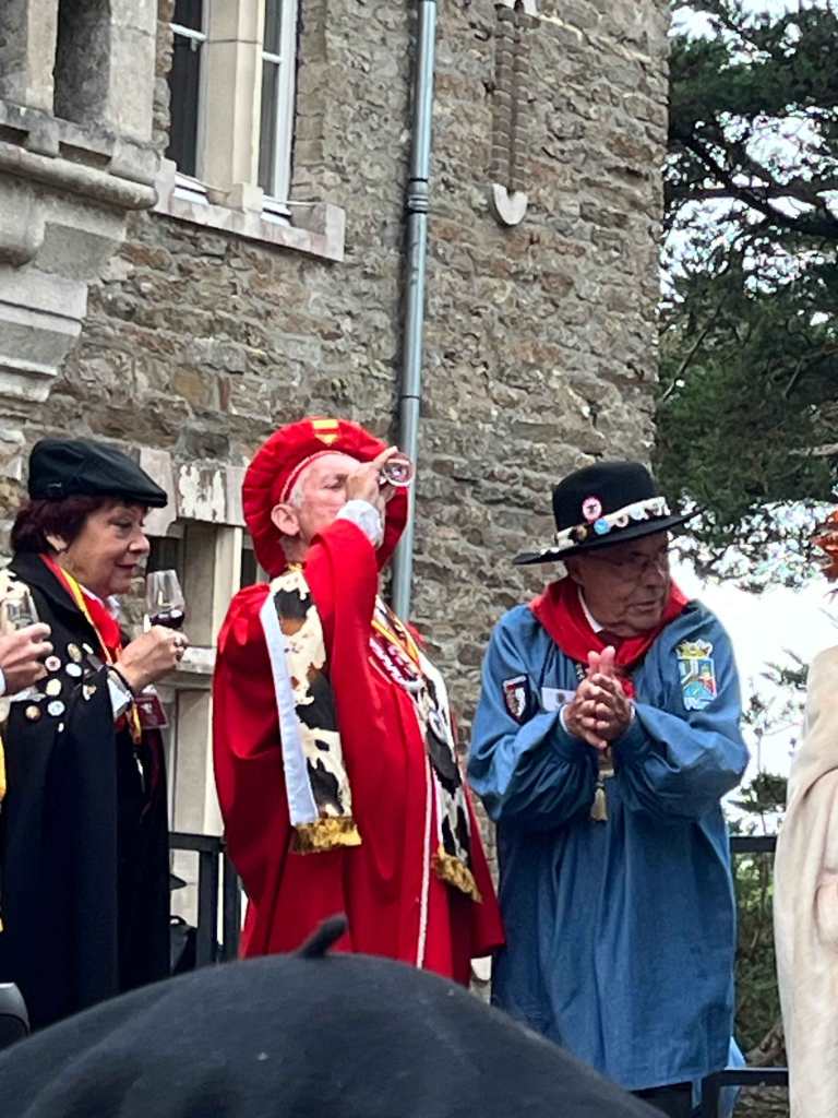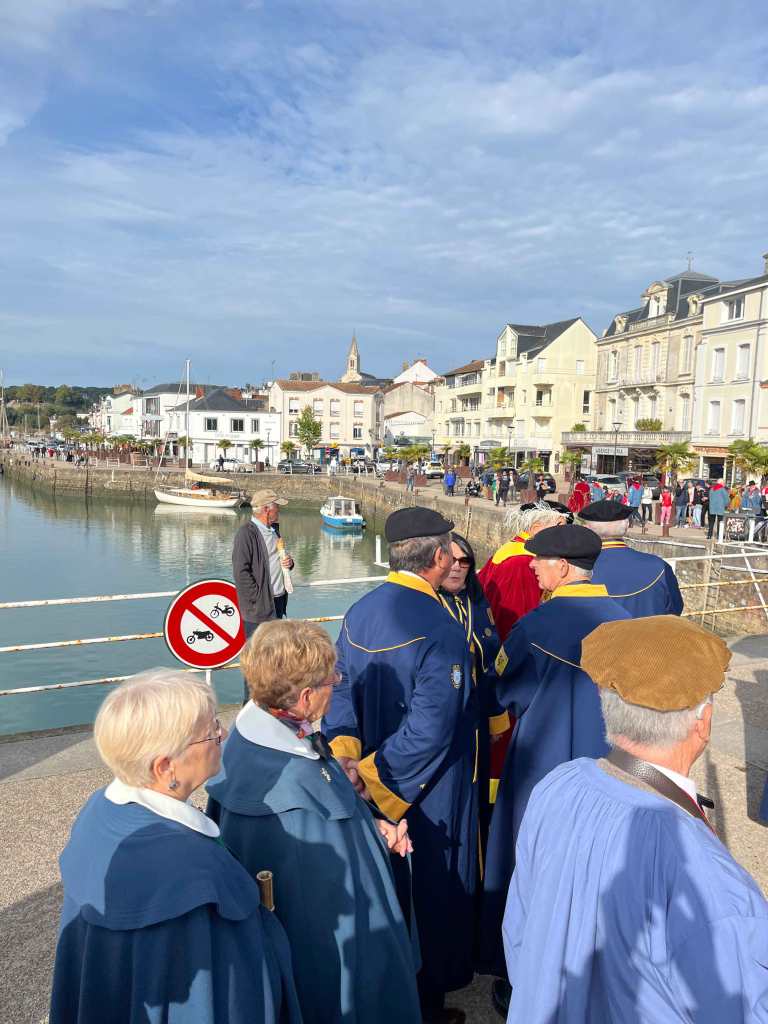 Ce samedi 27 septembre, la Confrérie de la Tête de Veau Pornicaise célébrait son 12ème chapitre. Elle se compose de 55 veaux. Après un très appétissant petit déjeuner terre et mer, nous sommes partis en bus , direction Pornic. Nous avons déambulé le long du port et sur la Ria où la présentation des 28 Confréries a été faite. Nous avons continué notre balade direction le château, toujours sous la conduite musicale du Bagad de la presqu’île. Dans la cour du château, 16 intronisations ont été faites , dont 1 veau d’or ( haut grade ). Retour à La salle des fêtes du Clion sur mer pour un repas de gala avec ambiance musicale.
