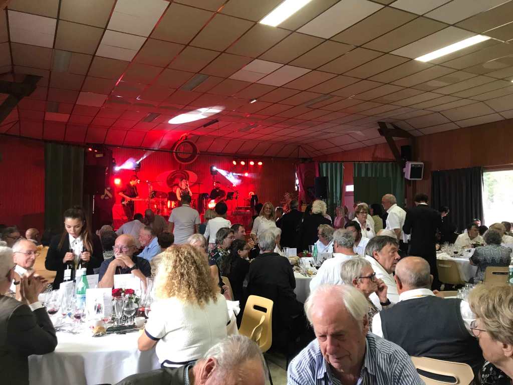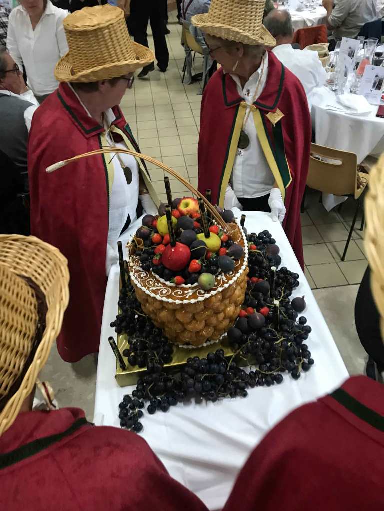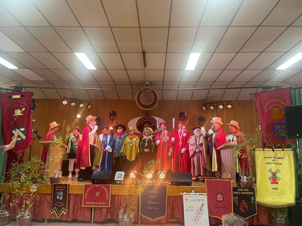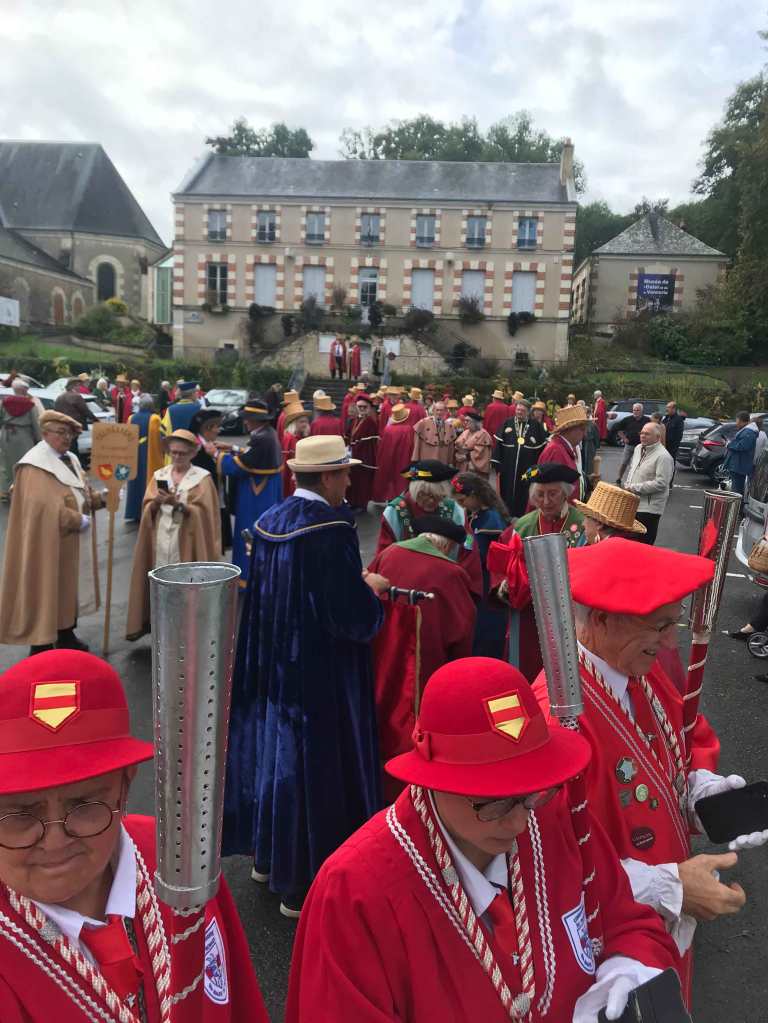 A l’issue d’une copieuse collation où notre buche cendrée fut proposée entre rillettes et viennoiseries, nous eûmes le privilège de visiter l’église paroissiale Saint-André du XIIe siècle, la coopérative de vannière et le musée de l’Osier et de la Vannerie. Après avoir revêtu nos habits d’apparat, nous nous retrouvâmes sur le perron de la mairie pour la traditionnelle photographie de groupe, sous l’œil protecteur du géant Toutantosier 1er qui culmine à plus de 4 m de haut. Le chapitre solennel fût officiellement ouvert par le Grand Maître face à 44 autres confréries venues de toutes les régions de France, de la Belgique et de la Suisse, suivi par les intronisations ; moment solennel où nous eûmes, Jean et moi, l’honneur de nous faire adouber « Compagnon » et ainsi devenir à notre tour « Façonneur » du noble osier. La journée se poursuivit par un repas de qualité, regroupant autour de la table plus de 200 convives et animé par l’orchestre musical « Showtime ».