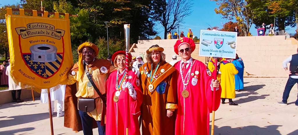 Plus de 40 confréries se sont retrouvées le samedi matin à Fontaine les Dijon pour le Grand Chapitre mais déjà le vendredi après midi elles étaient nombreuses à assister au cœur de la Cité Internationale de la Gastronomie à une conférence sur le repas gastronomique des français et les climats du vignoble de Bourgogne et à une visite de musée. Après une dégustation de vin de la côte de nuit un diner de produits du terroir été servi. Le lendemain buffet d’accueil…mise en habits…. Défilé ….Chapitre et 15 intronisations dont Mth et un collectionneur qui a fait don à la confrérie de 149 moutardiers . Moutardiers qui vont enrichir le musée de la moutarde que la confrérie est en train de créer…. Après un apéritif agréable un déjeuner de gala a été servi … avec animation musicale très festive. Très bel accueil où nous avons pu faire la connaissance de nombreuses confréries de l’Est qui ont été très heureuses, lors de la dégustation, de découvrir ou « mieux connaitre » notre Fromage de Sainte Maure de Touraine.