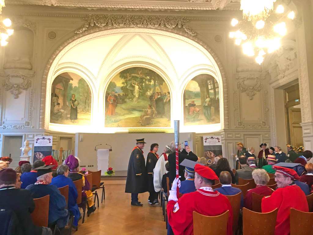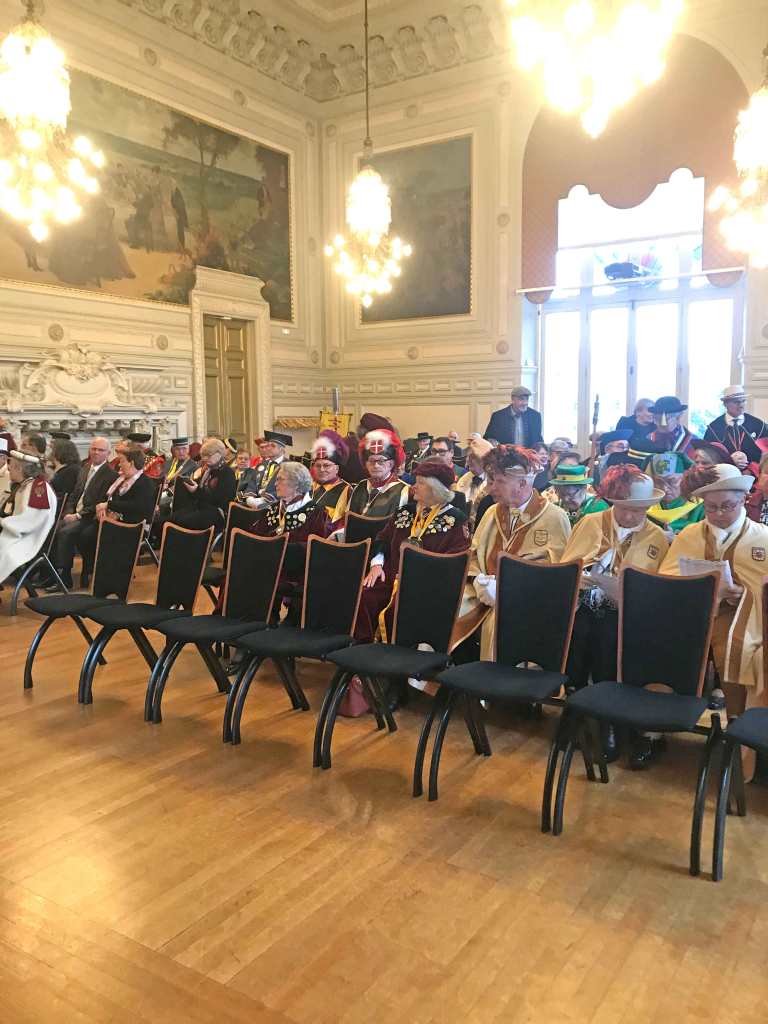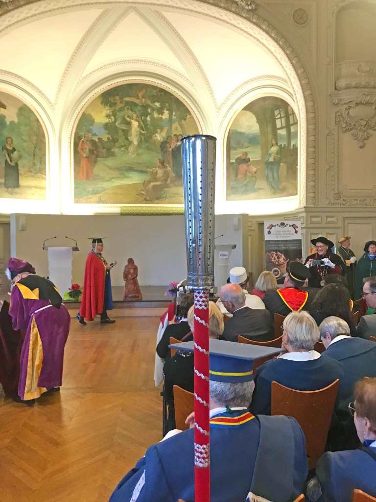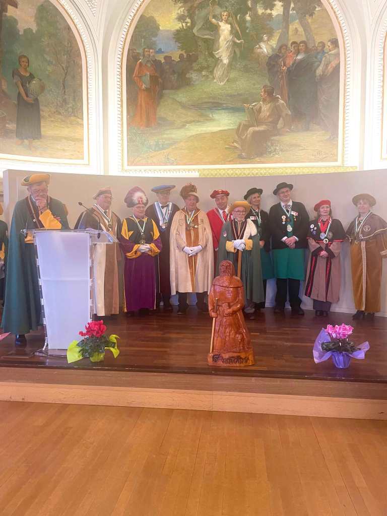 Après une collation pantagruélique composée de rillettes, rillons et viennoiseries, nous avons revêtu nos habits d’apparat pour l’appel des confréries et l’entrée dans la salle des mariages. Le chapitre solennel fût officiellement ouvert par le Grand Maître face à 69 autres confréries venues de toutes les régions de France et de la Belgique, suivi par les intronisations ; moment solennel où j’eu l’honneur de me faire adouber « Chevalier » et ainsi devenir un digne ambassadeur de Saint-Antoine. L’épilogue de ce chapitre fût assuré par Cécile Tardivon et son équipe avec le service d’un repas à faire pâlir Gargantua, regroupant autour de la table près de 260 convives.