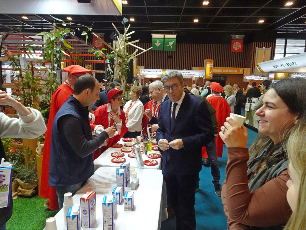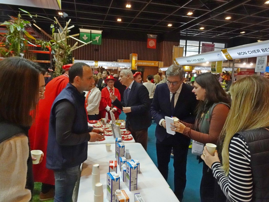 Lundi 23 février, de bon matin et de bonne humeur, nous nous sommes retrouvés à la Chambre d’agriculture pour rejoindre Agathe (responsable de ce déplacement au salon international de l’agriculture à Paris) pour partir à 5h du matin en car et prendre au passage les participants du Loir et Cher avant de retrouver notre stand commun, « Centre Val de Loire » qui accueille le 37 et le 41. En demandant une table pour notre installation après avoir pris possession des lieux, café et viennoiseries ont été servis et appréciés, puis nous avons préparé et découpé les fromages pour assurer les dégustations de notre fameux Sainte-Maure de Touraine avant l’arrivée progressive des visiteurs venus de toute la France, curieux de goûter et de connaitre les secrets de sa fabrication et de sa paille gravée qui assure sa traçabilité dans le monde entier.