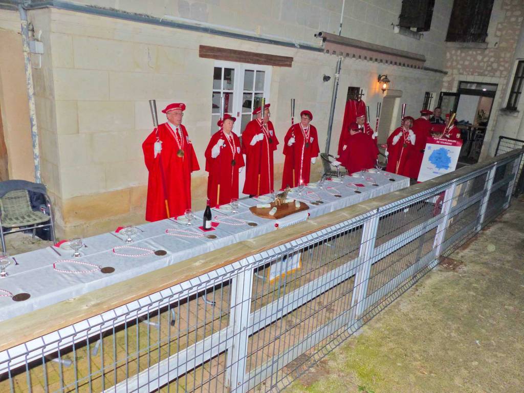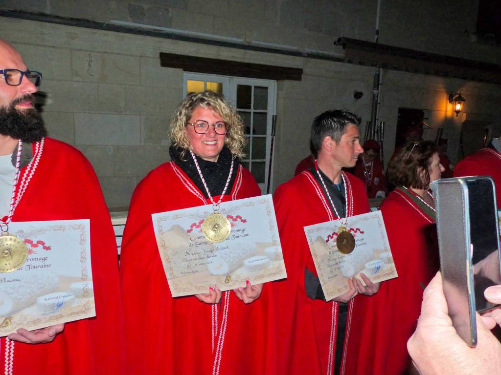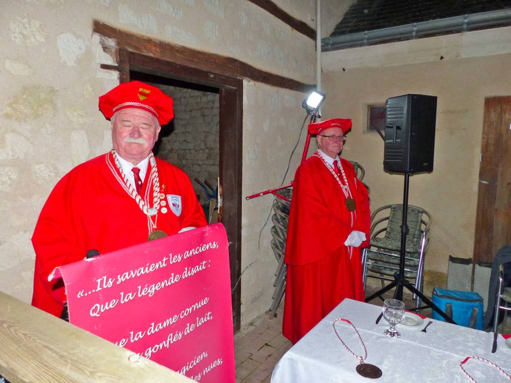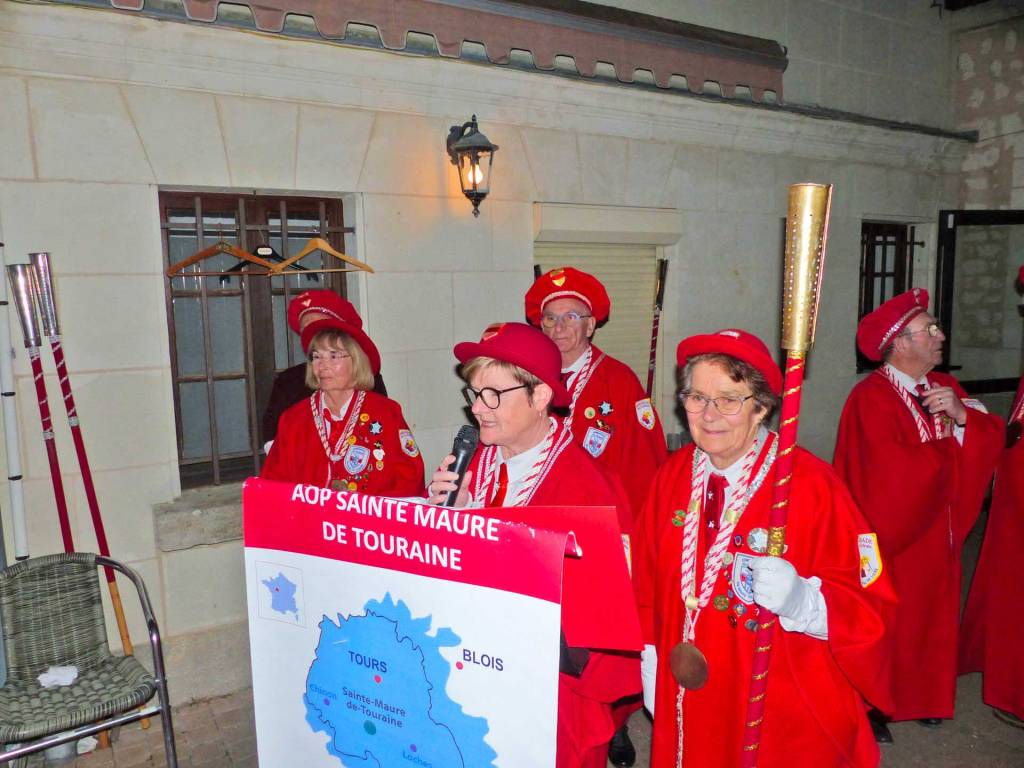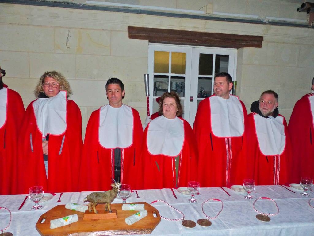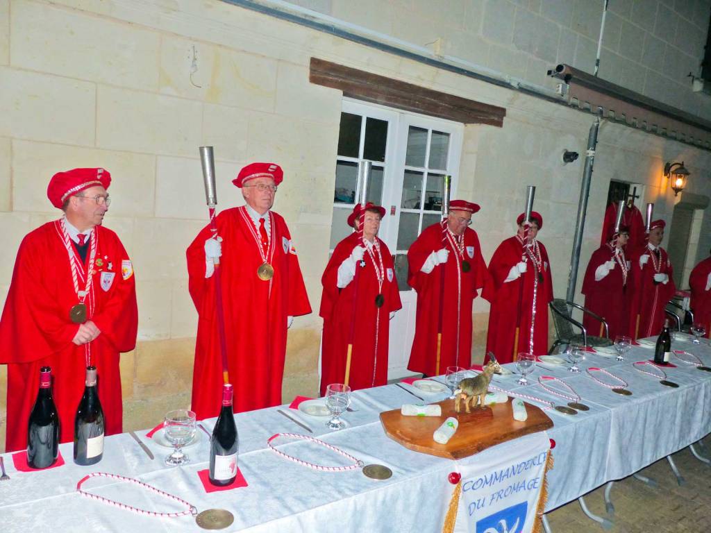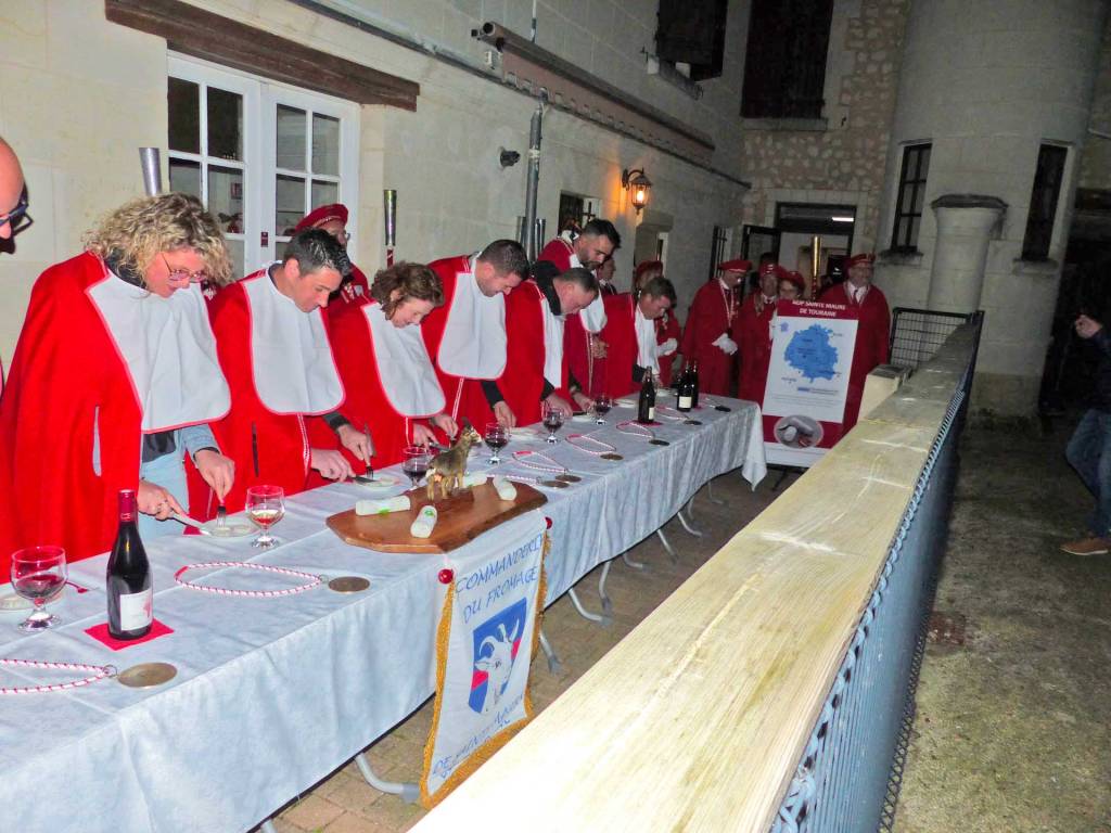 Le Grand Fromager Christine Dubois donne les indications spécifiques des fromages à déguster, en commençant par le demi-sec et terminant par le sec pour découvrir toutes les subtilités de ce pur produit du terroir. Le Grand Echanson, Jean Ligeard commente ensuite les vins qui accompagnent cette dégustation, Chinon pour les uns, Vouvray pour les autres. Les assiettes et les verres étant vides, les impétrants sont de nouveau appelés pour être adoubés Chevaliers par notre Grand Maitre, médailles et diplômes leur sont ensuite remis pour une dernière photo et la conclusion de Madeleine :