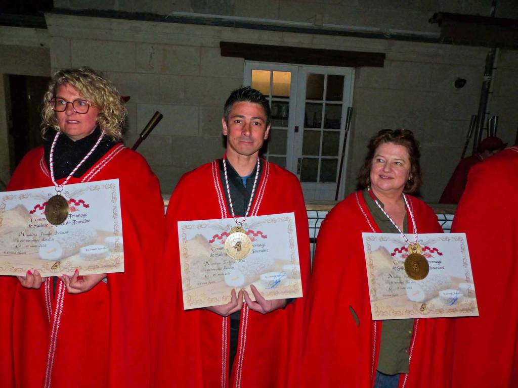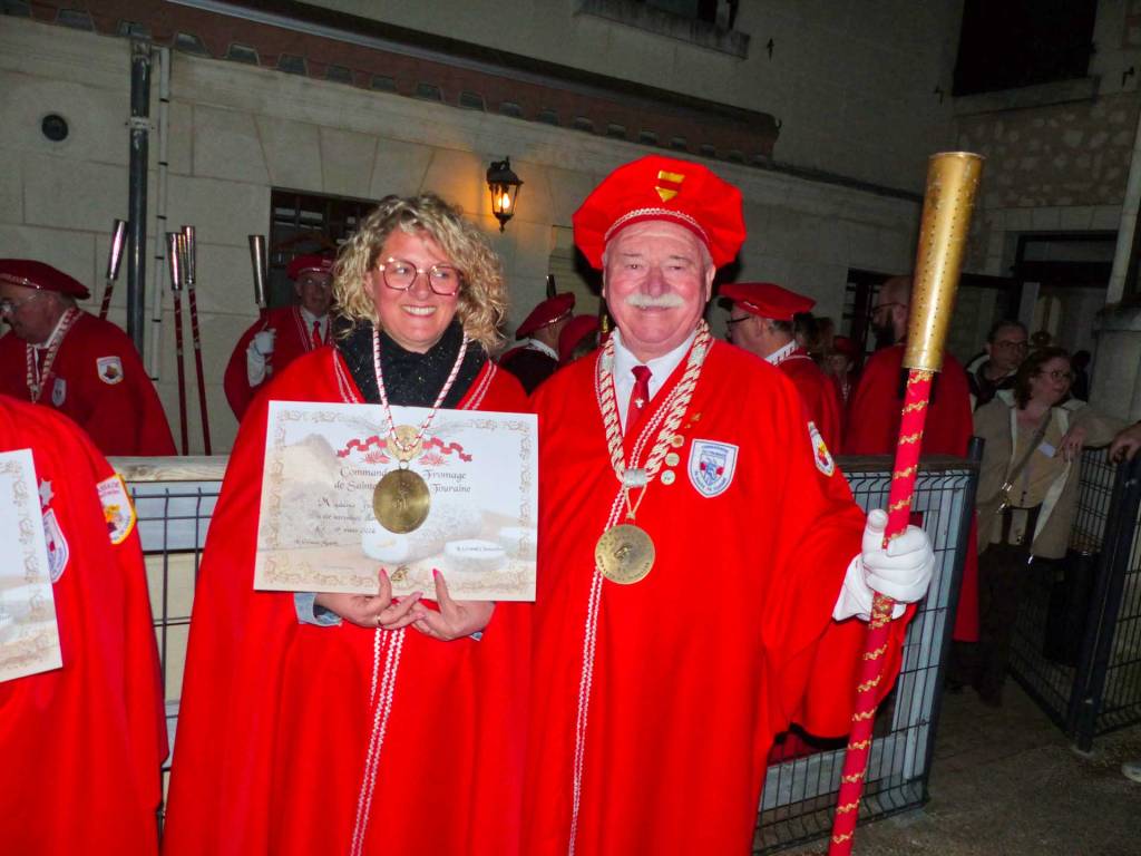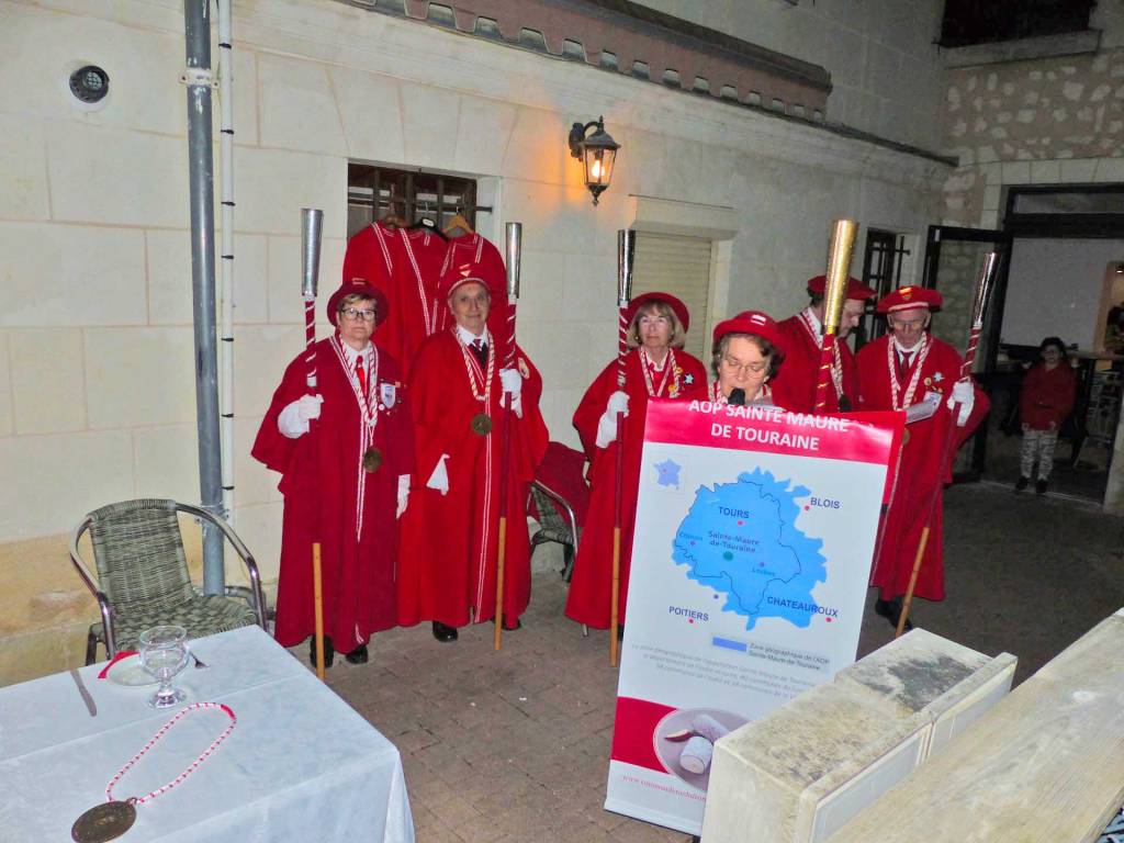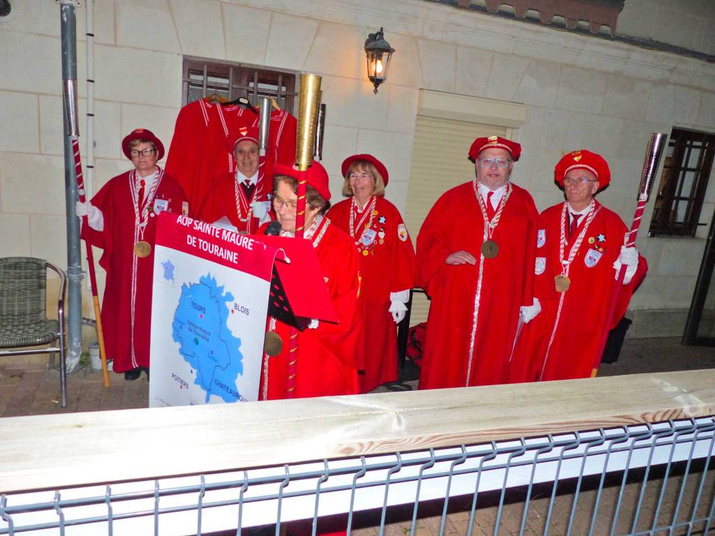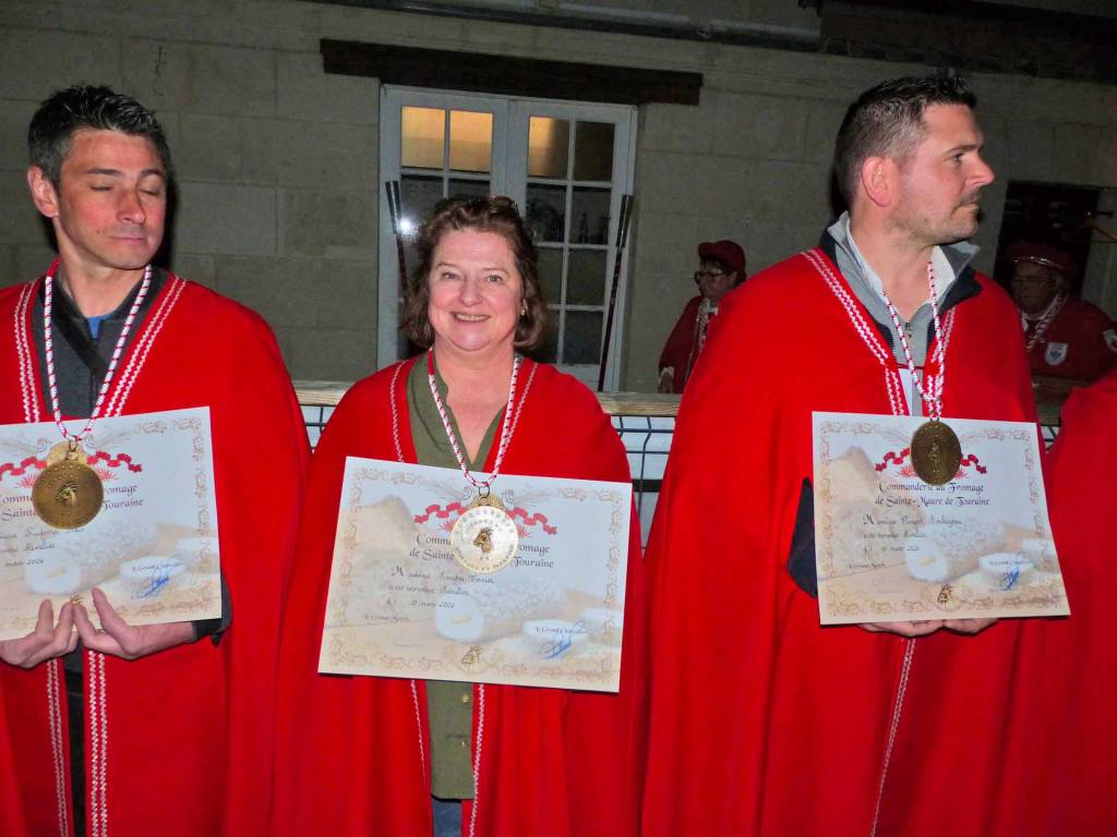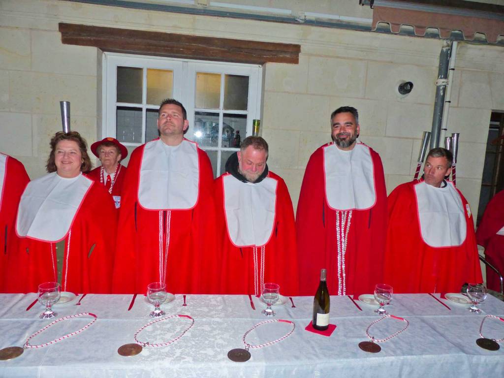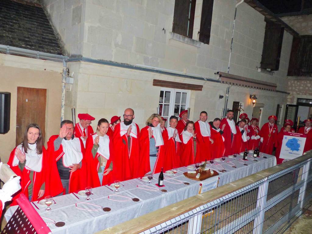 Le Grand Fromager Christine Dubois donne les indications spécifiques des fromages à déguster, en commençant par le demi-sec et terminant par le sec pour découvrir toutes les subtilités de ce pur produit du terroir. Le Grand Echanson, Jean Ligeard commente ensuite les vins qui accompagnent cette dégustation, Chinon pour les uns, Vouvray pour les autres. Les assiettes et les verres étant vides, les impétrants sont de nouveau appelés pour être adoubés Chevaliers par notre Grand Maitre, médailles et diplômes leur sont ensuite remis pour une dernière photo et la conclusion de Madeleine :