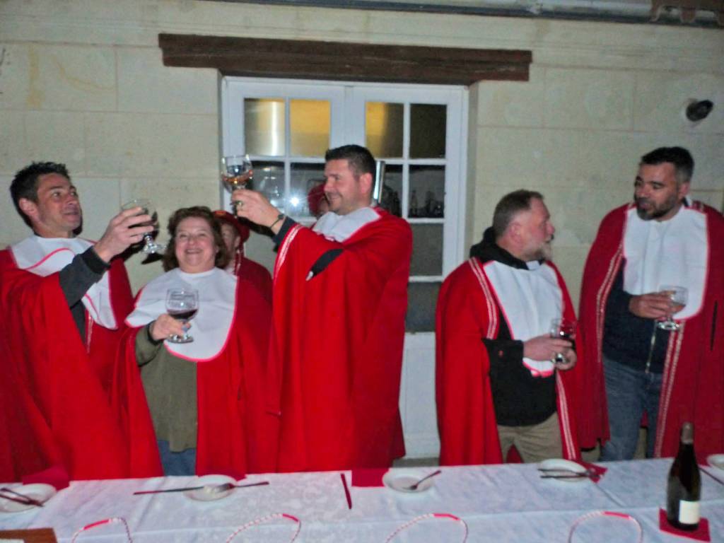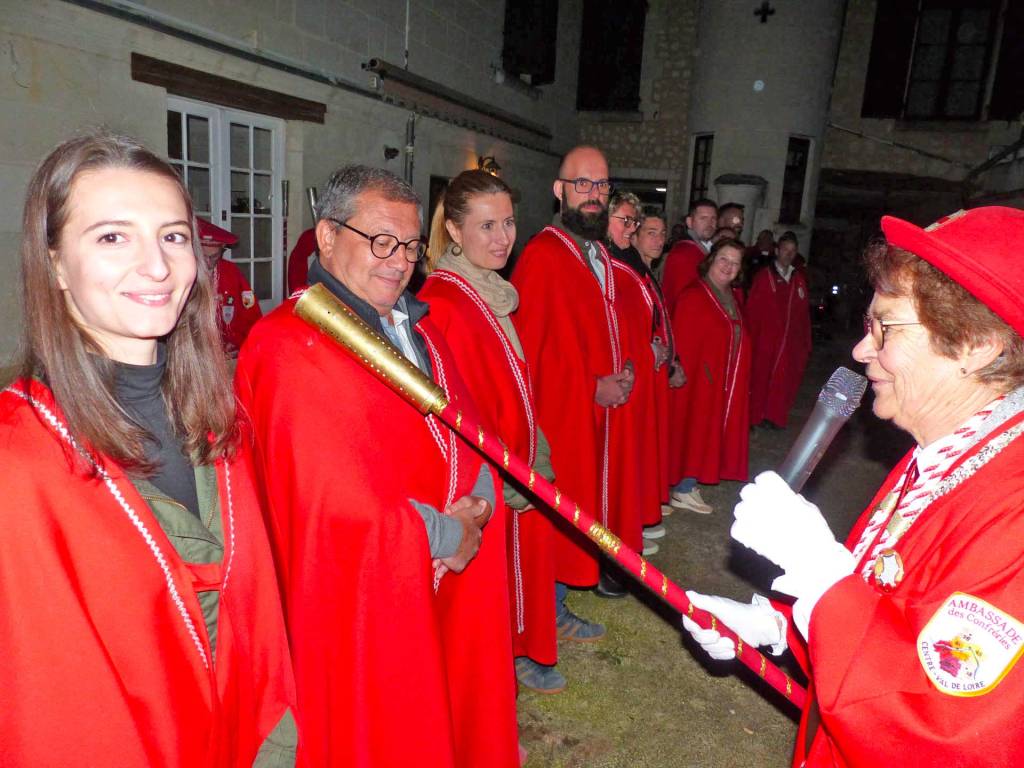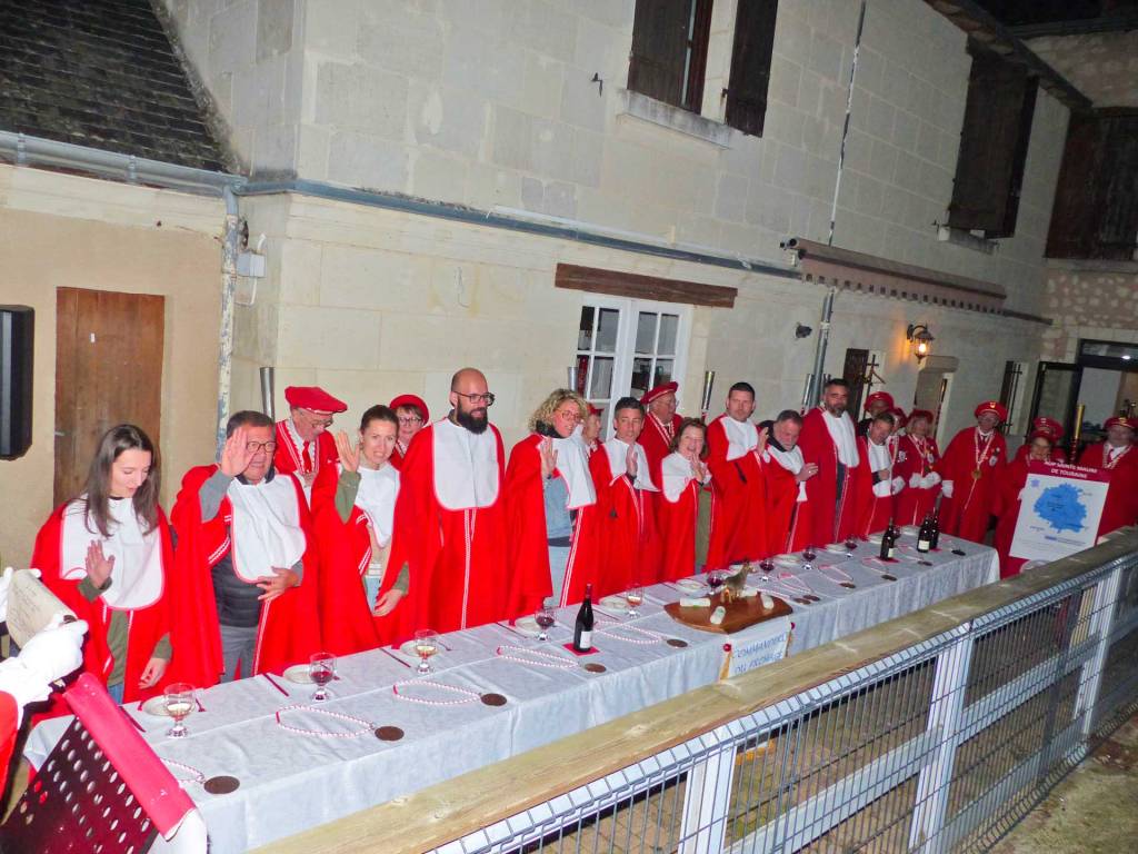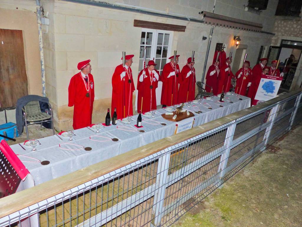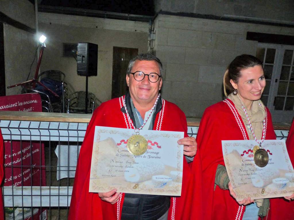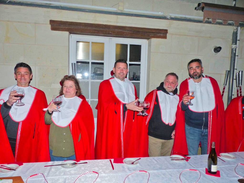 Le Grand Fromager Christine Dubois donne les indications spécifiques des fromages à déguster, en commençant par le demi-sec et terminant par le sec pour découvrir toutes les subtilités de ce pur produit du terroir. Le Grand Echanson, Jean Ligeard commente ensuite les vins qui accompagnent cette dégustation, Chinon pour les uns, Vouvray pour les autres. Les assiettes et les verres étant vides, les impétrants sont de nouveau appelés pour être adoubés Chevaliers par notre Grand Maitre, médailles et diplômes leur sont ensuite remis pour une dernière photo et la conclusion de Madeleine :