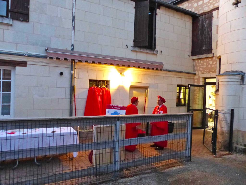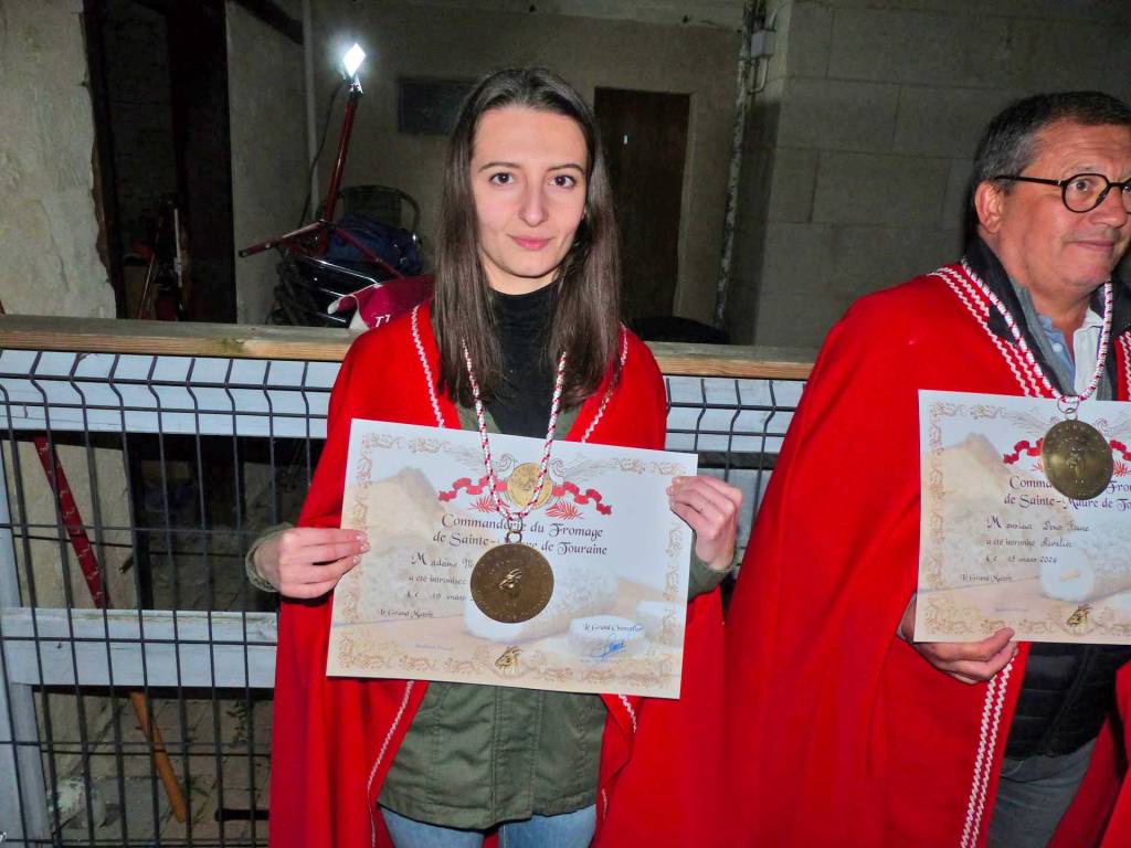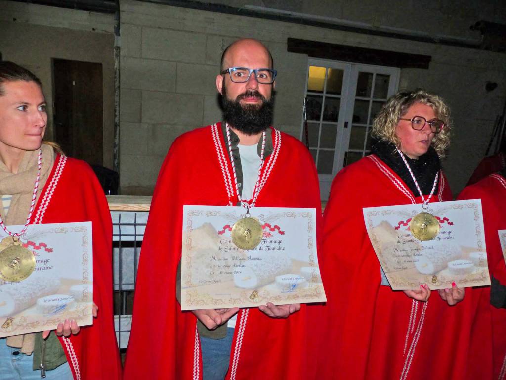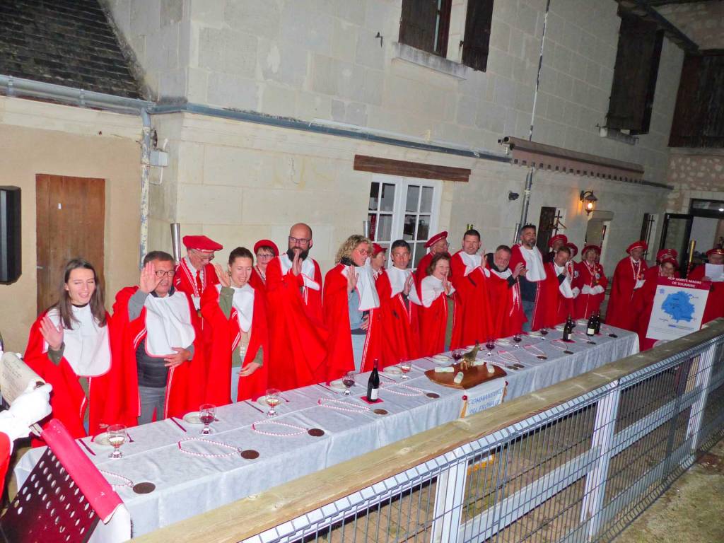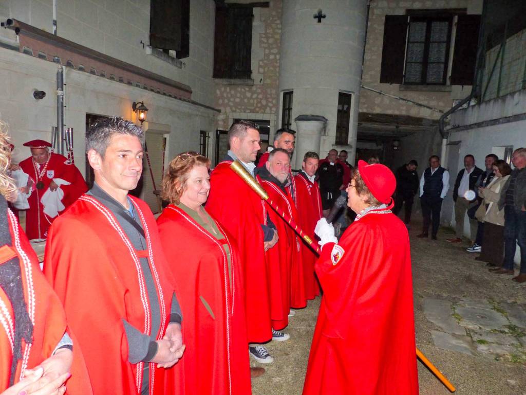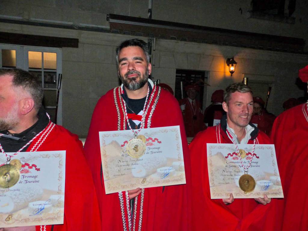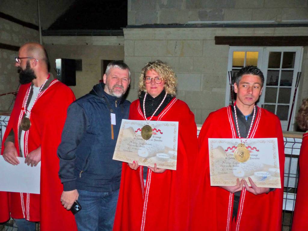 Le Grand Fromager Christine Dubois donne les indications spécifiques des fromages à déguster, en commençant par le demi-sec et terminant par le sec pour découvrir toutes les subtilités de ce pur produit du terroir. Le Grand Echanson, Jean Ligeard commente ensuite les vins qui accompagnent cette dégustation, Chinon pour les uns, Vouvray pour les autres. Les assiettes et les verres étant vides, les impétrants sont de nouveau appelés pour être adoubés Chevaliers par notre Grand Maitre, médailles et diplômes leur sont ensuite remis pour une dernière photo et la conclusion de Madeleine :