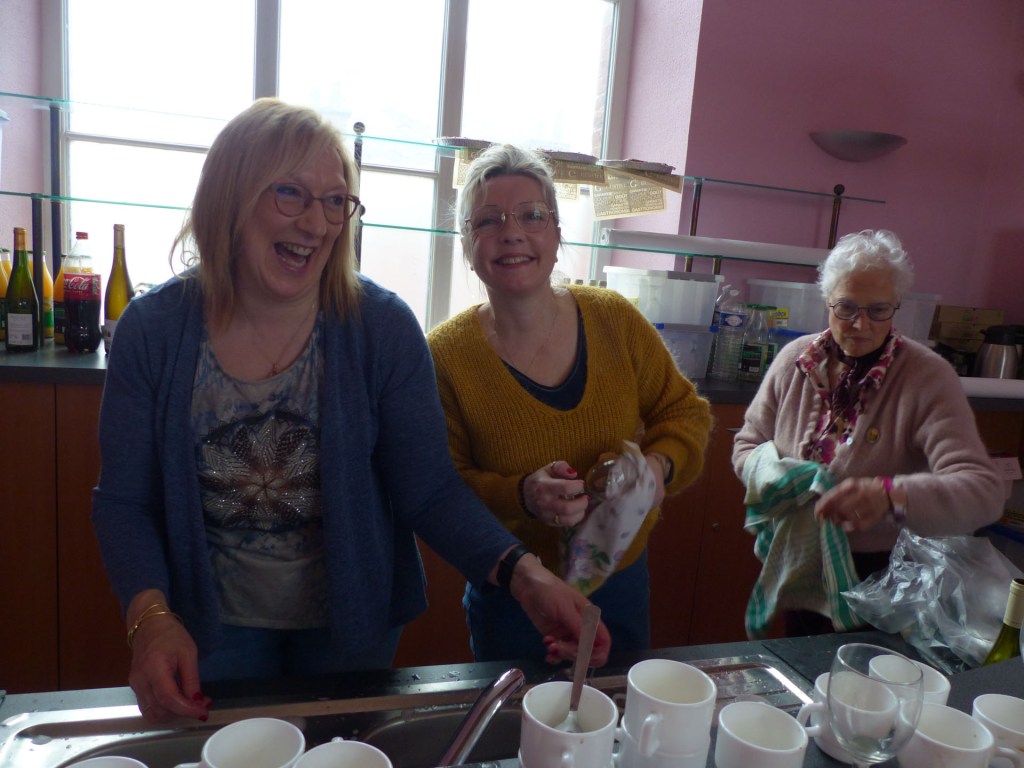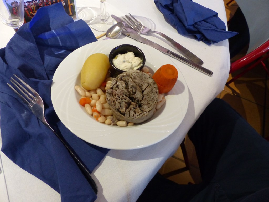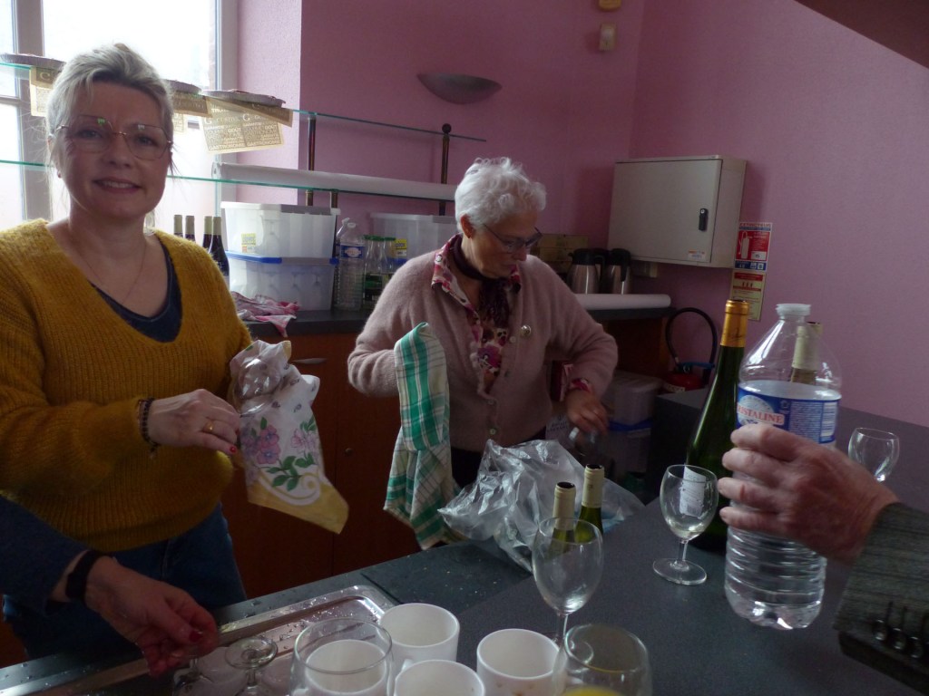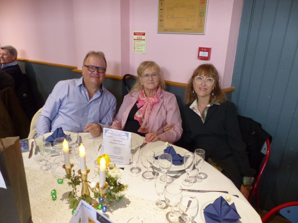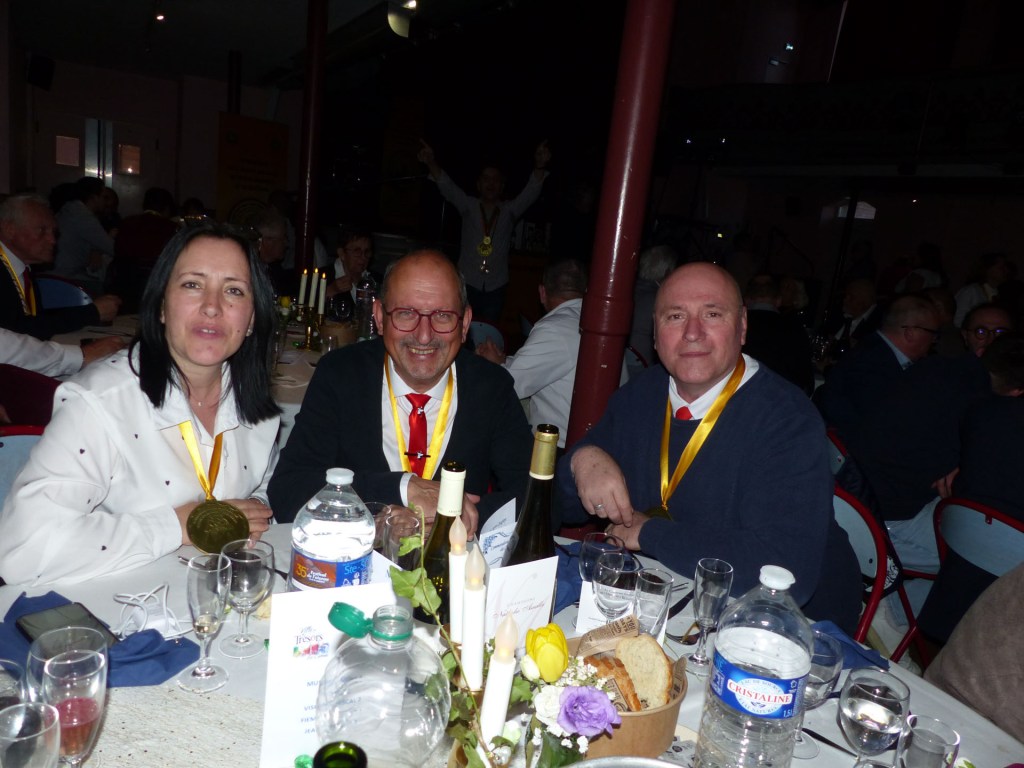 Le repas peut commencer, Coupe de Champagne et ses gourmandise, suivie de l’escalope de foie gras poêlée, brunoise de pommes au calvados, Puis c’est le plat sublime : « L’Andouille chaude » et ses légumes. (un régal), ou cassolette de St Jacques pour ceux qui préfèrent. Suivi du Sorbet Cassis et eau de vie de Bourgogne pour préparer nos estomacs à savourer Le suprême de volailles de Licques, gratin à la Tomme de Cambrai.