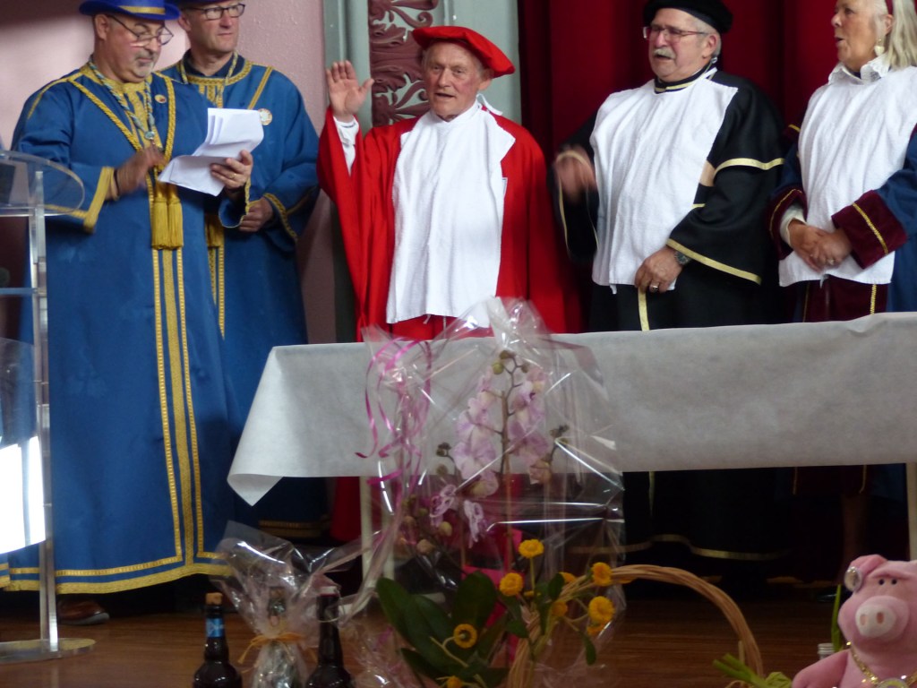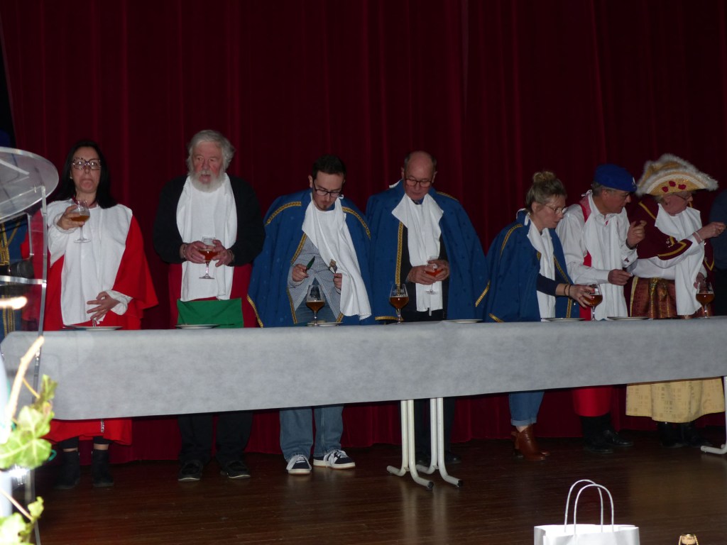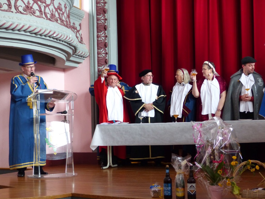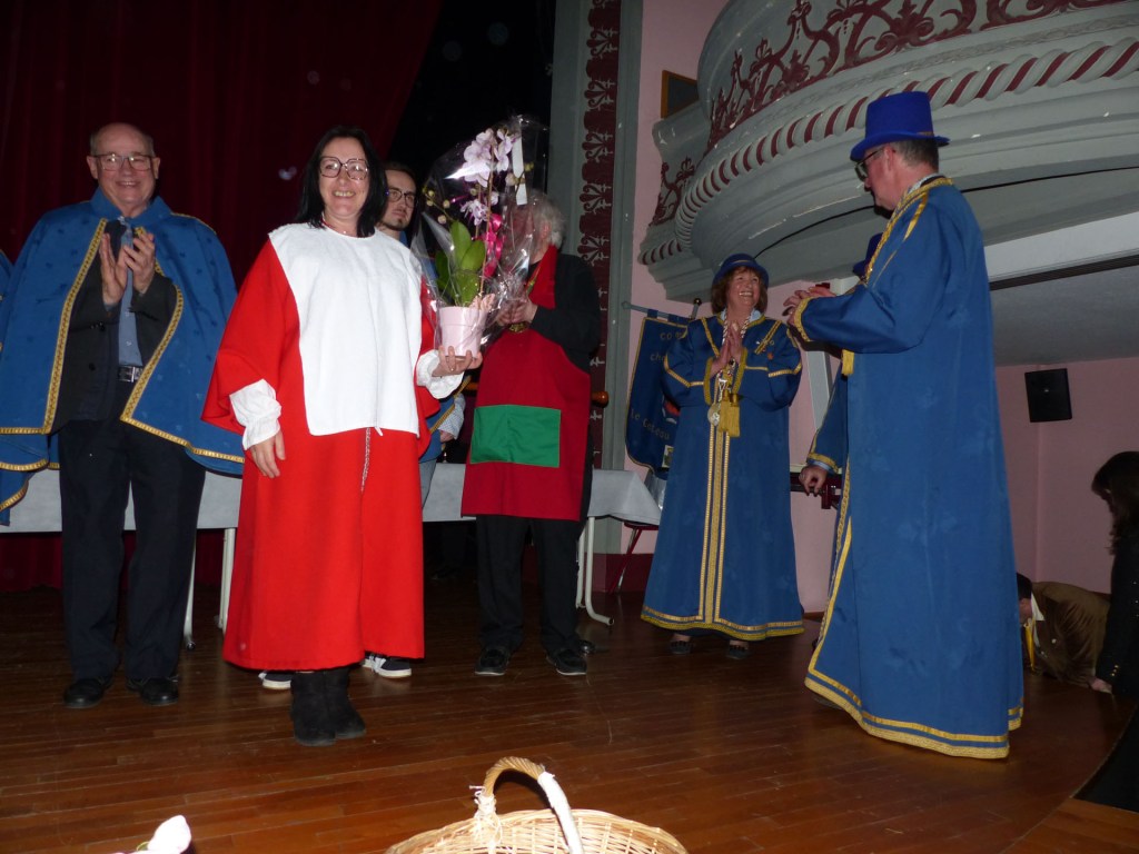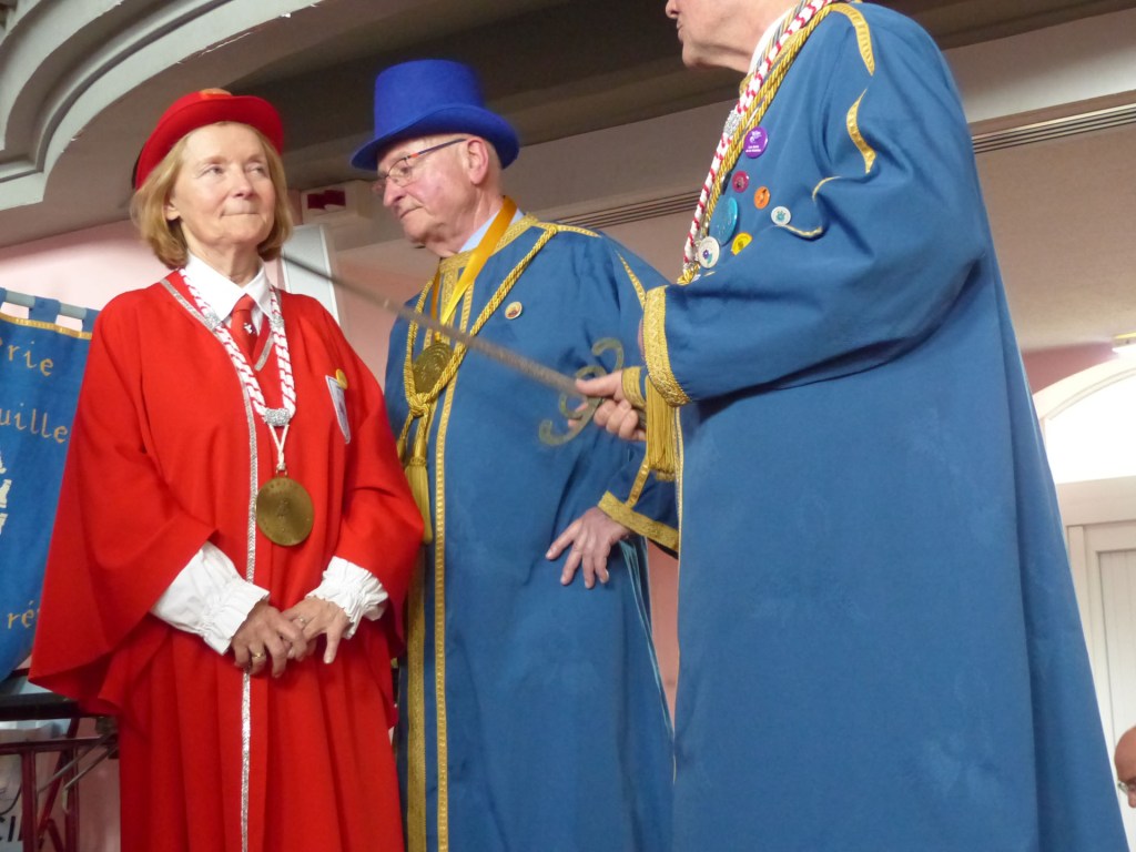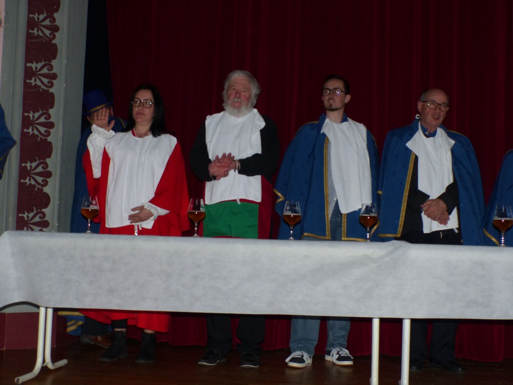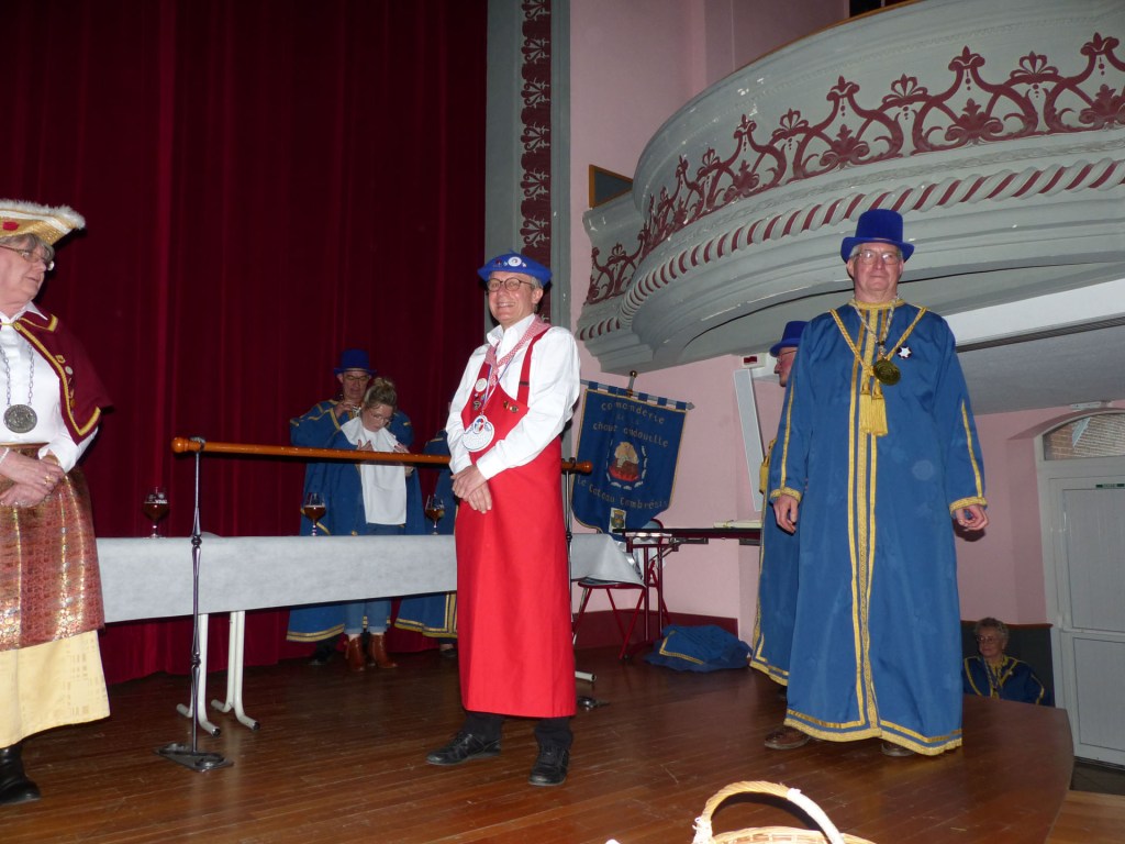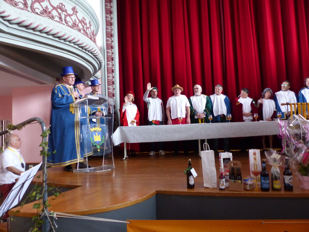De retour au Théâtre, une coupe de champagne, nous aide à célébrer le 20 ème chapitre qui va se tenir sur la scène au cours duquel Patrick, Grand Maitre Commandeur, va adouber 40 nouveaux Chevaliers, dont le 800 ème de l’histoire de La Commanderie. Le tirage au sort désigne notre Marie Esther, souriante et ravie de cette surprise. Un beau trophée lui sera remis, pour marquer cet événement.