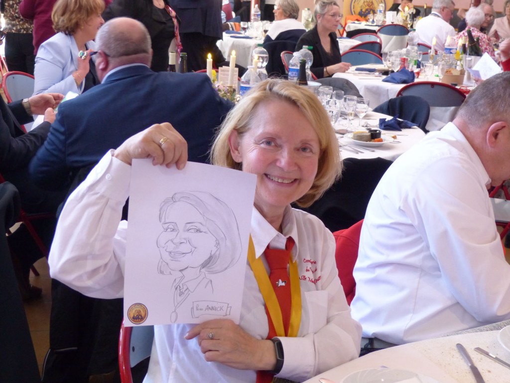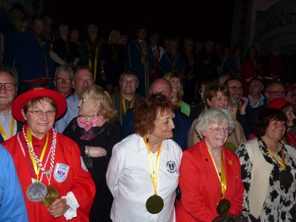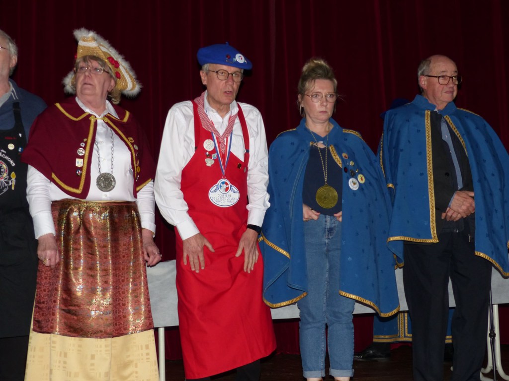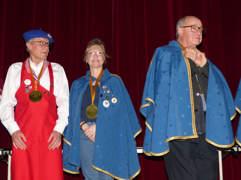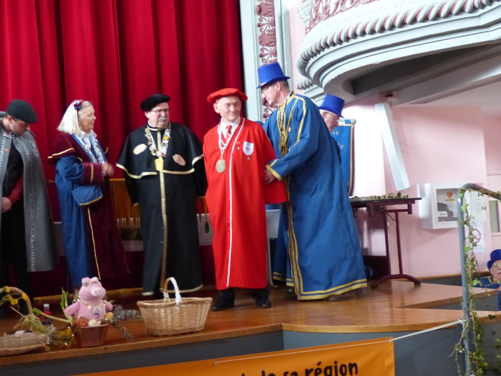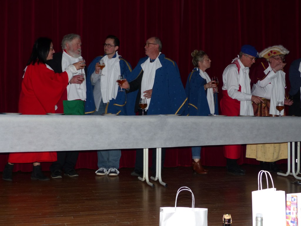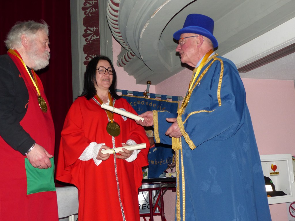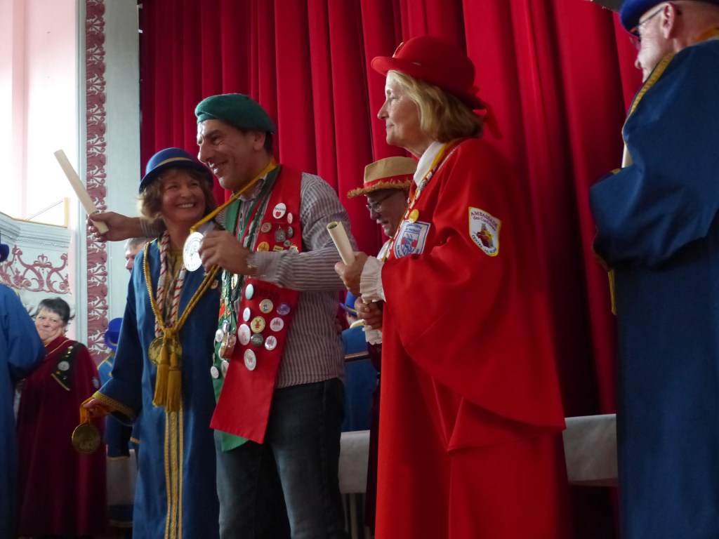 De retour au Théâtre, une coupe de champagne, nous aide à célébrer le 20 ème chapitre qui va se tenir sur la scène au cours duquel Patrick, Grand Maitre Commandeur, va adouber 40 nouveaux Chevaliers, dont le 800 ème de l’histoire de La Commanderie. Le tirage au sort désigne notre Marie Esther, souriante et ravie de cette surprise. Un beau trophée lui sera remis, pour marquer cet événement.