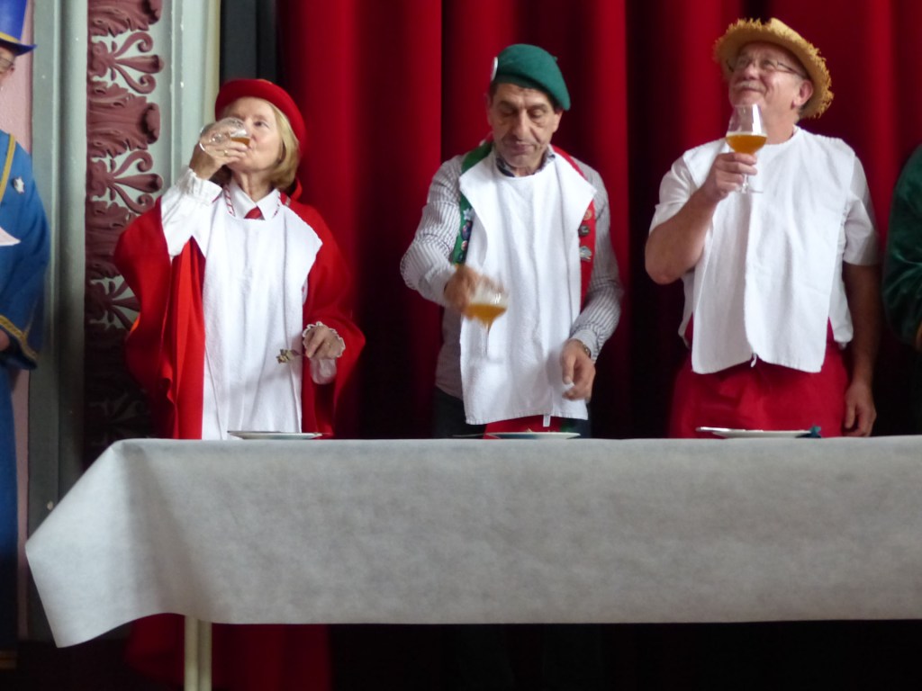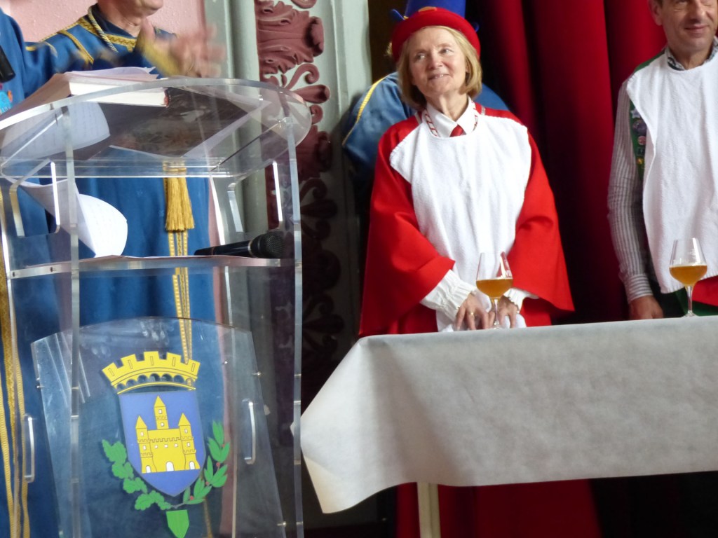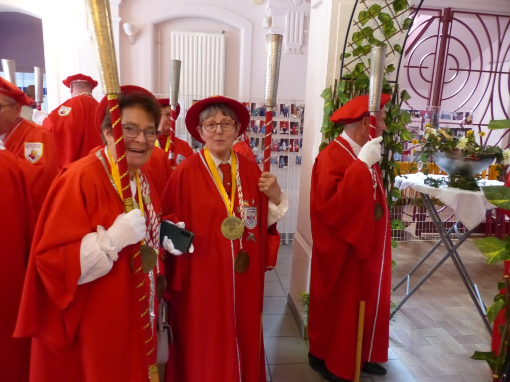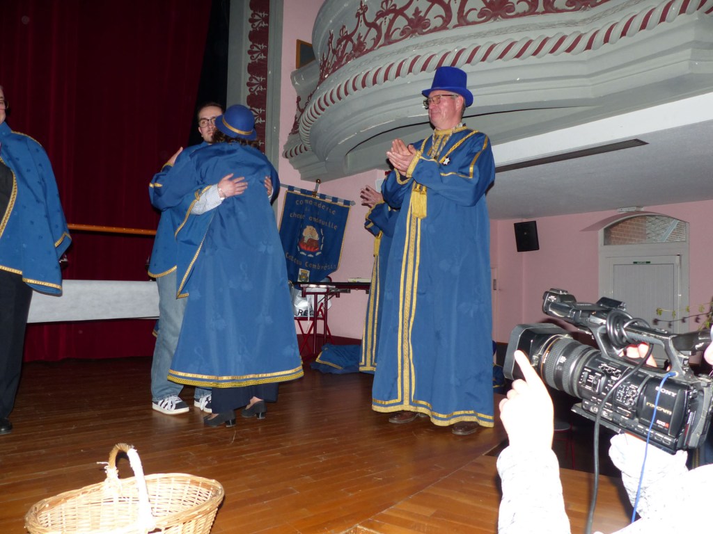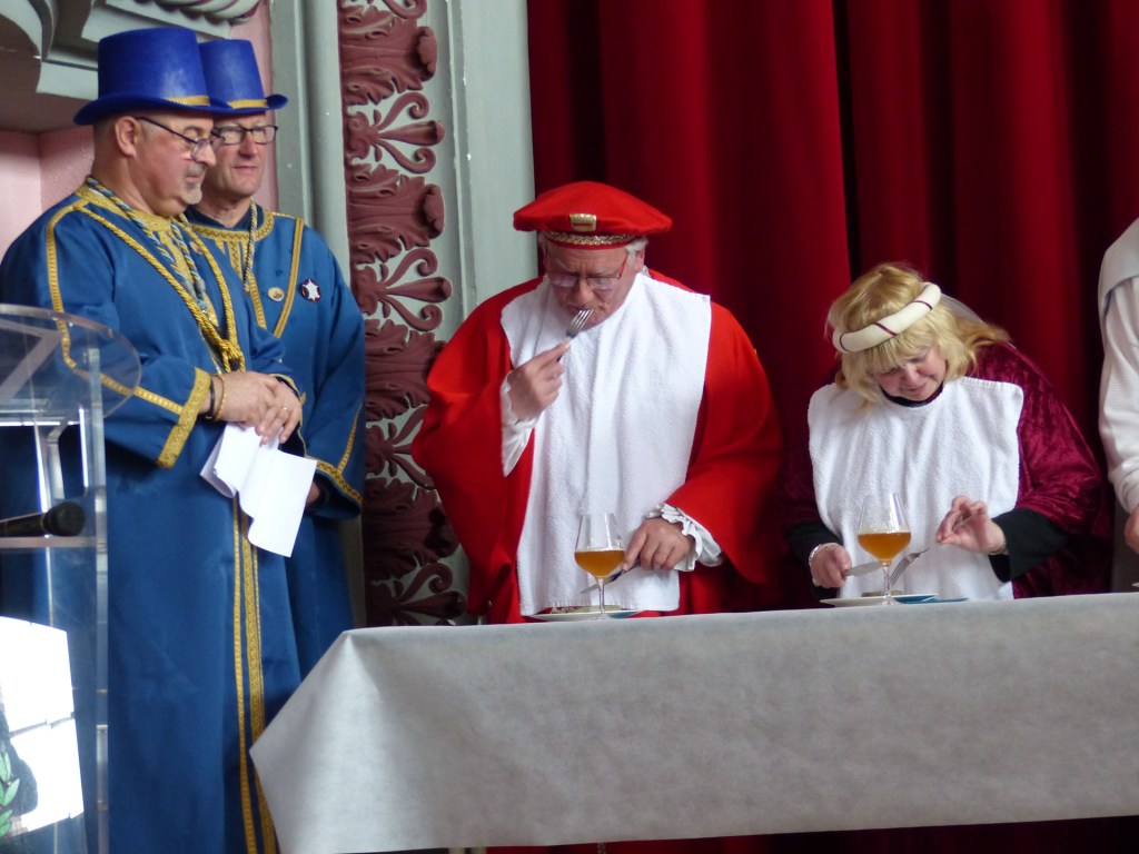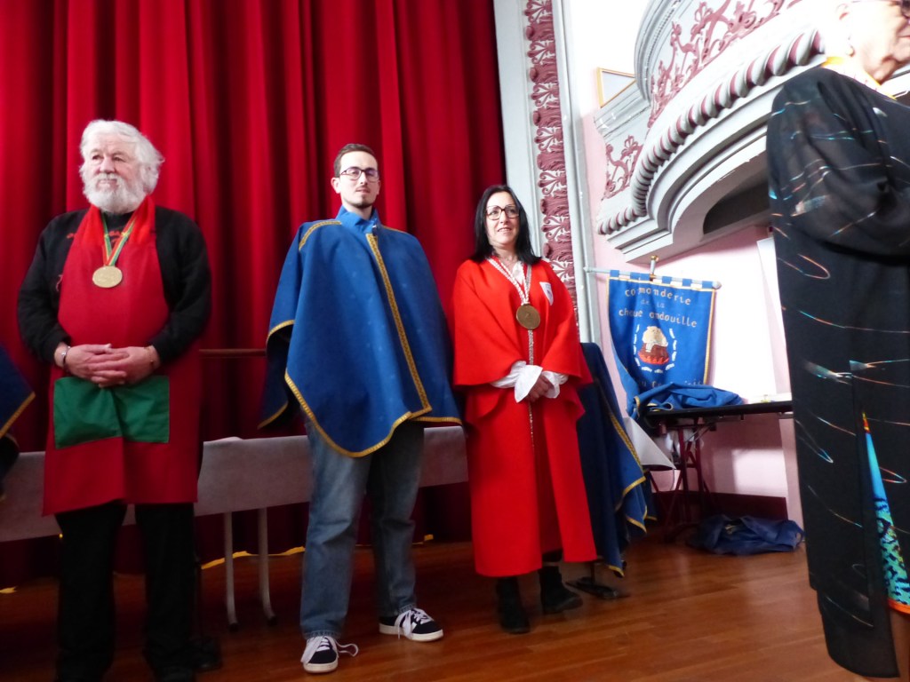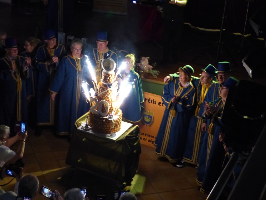De retour au Théâtre, une coupe de champagne, nous aide à célébrer le 20 ème chapitre qui va se tenir sur la scène au cours duquel Patrick, Grand Maitre Commandeur, va adouber 40 nouveaux Chevaliers, dont le 800 ème de l’histoire de La Commanderie. Le tirage au sort désigne notre Marie Esther, souriante et ravie de cette surprise. Un beau trophée lui sera remis, pour marquer cet événement.