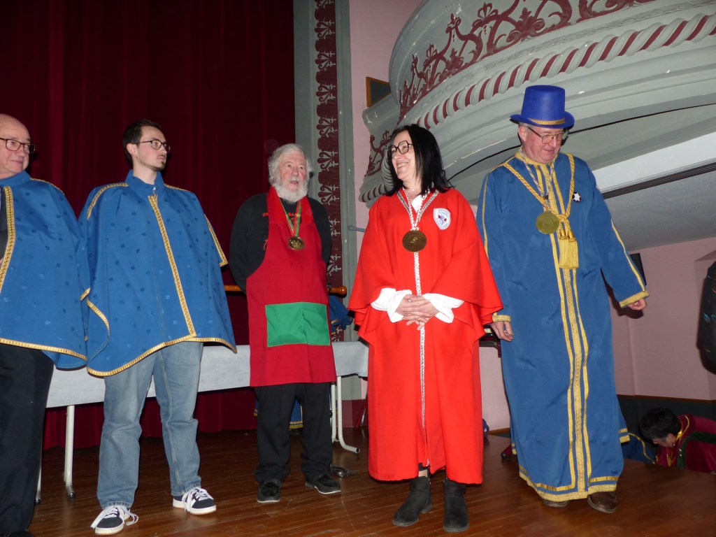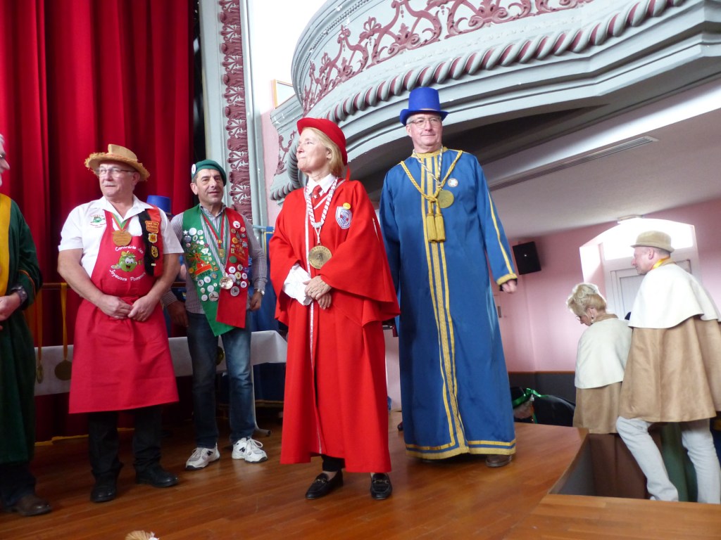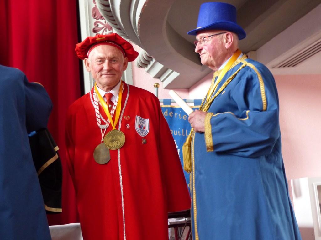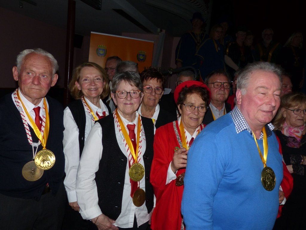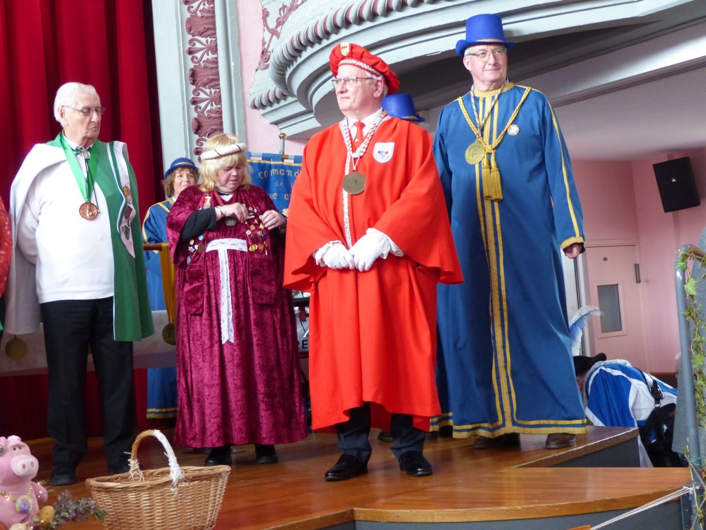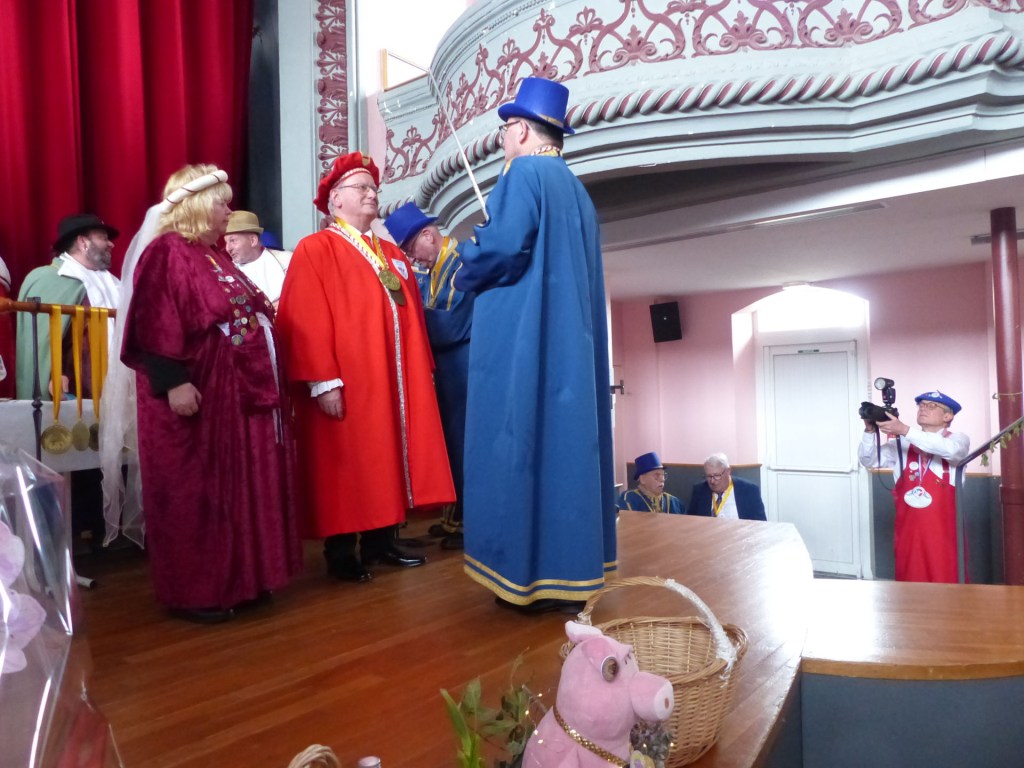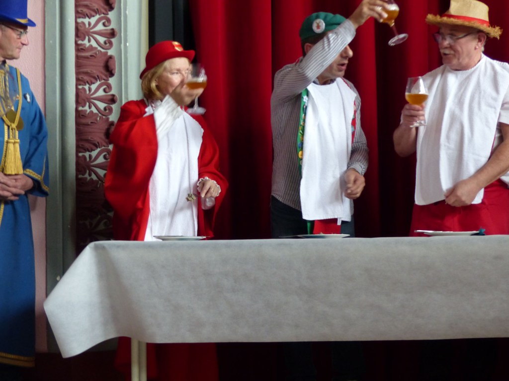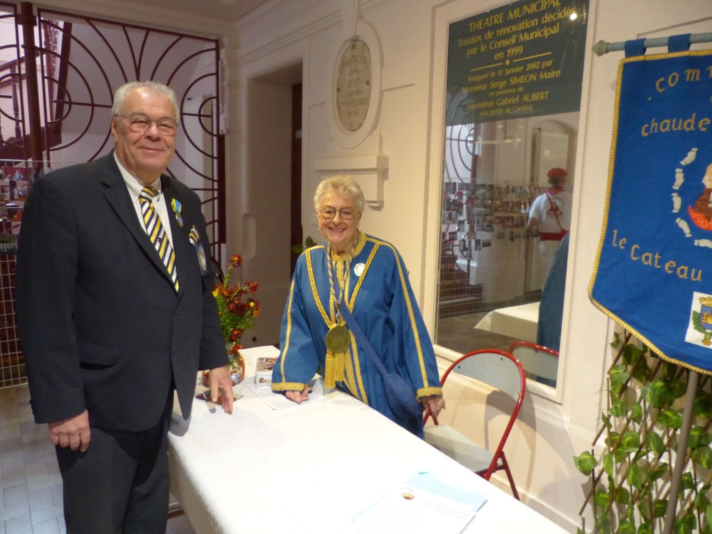 De retour au Théâtre, une coupe de champagne, nous aide à célébrer le 20 ème chapitre qui va se tenir sur la scène au cours duquel Patrick, Grand Maitre Commandeur, va adouber 40 nouveaux Chevaliers, dont le 800 ème de l’histoire de La Commanderie. Le tirage au sort désigne notre Marie Esther, souriante et ravie de cette surprise. Un beau trophée lui sera remis, pour marquer cet événement.