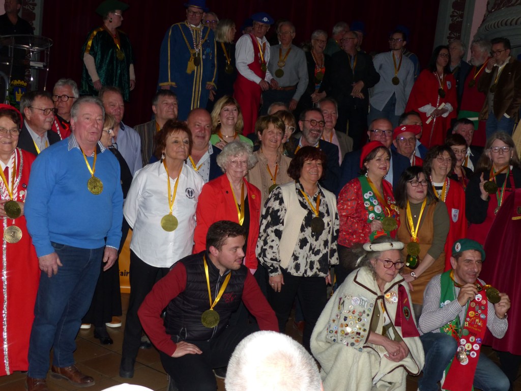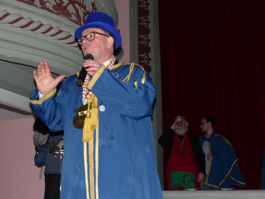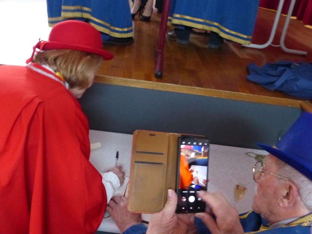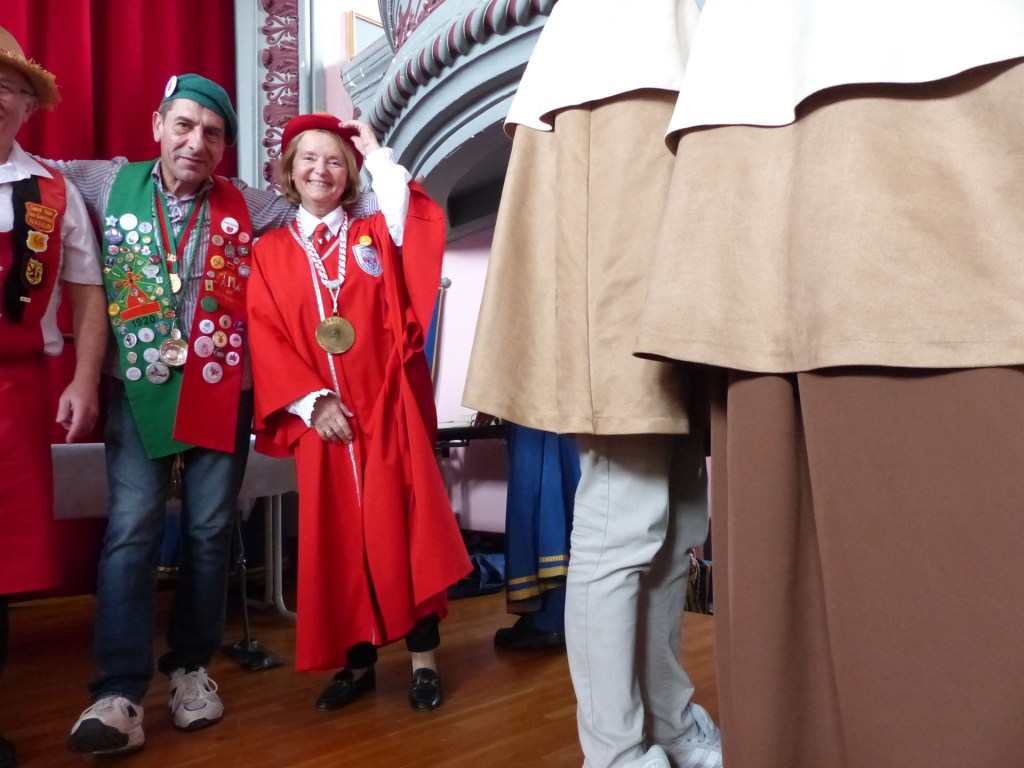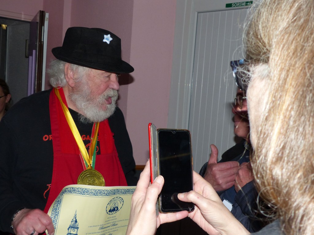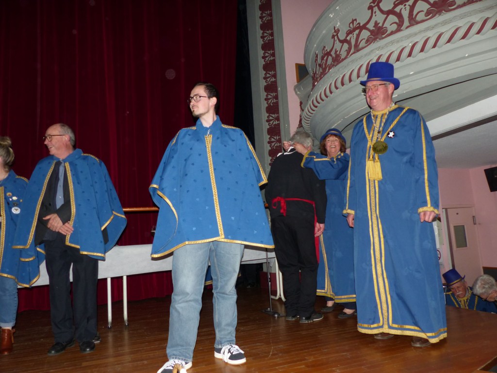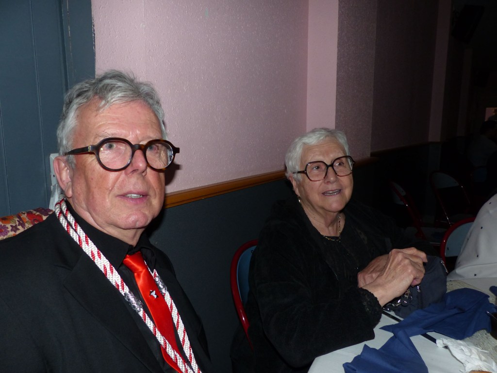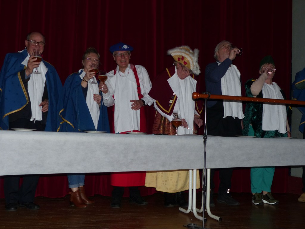 De retour au Théâtre, une coupe de champagne, nous aide à célébrer le 20 ème chapitre qui va se tenir sur la scène au cours duquel Patrick, Grand Maitre Commandeur, va adouber 40 nouveaux Chevaliers, dont le 800 ème de l’histoire de La Commanderie. Le tirage au sort désigne notre Marie Esther, souriante et ravie de cette surprise. Un beau trophée lui sera remis, pour marquer cet événement.