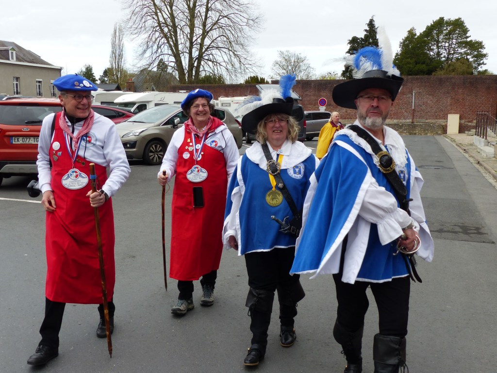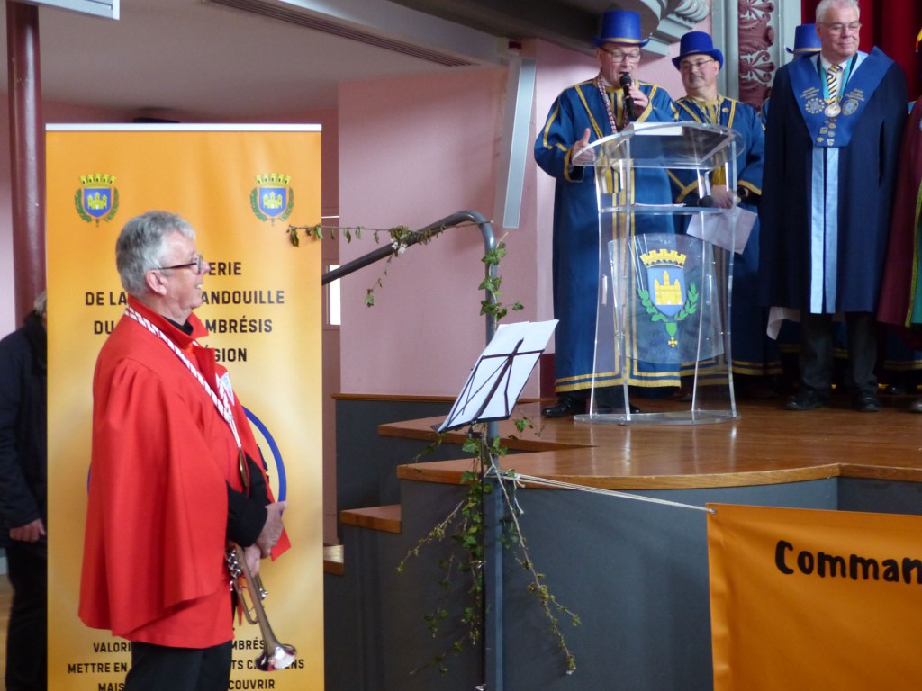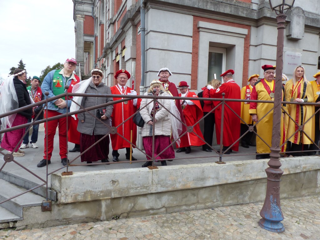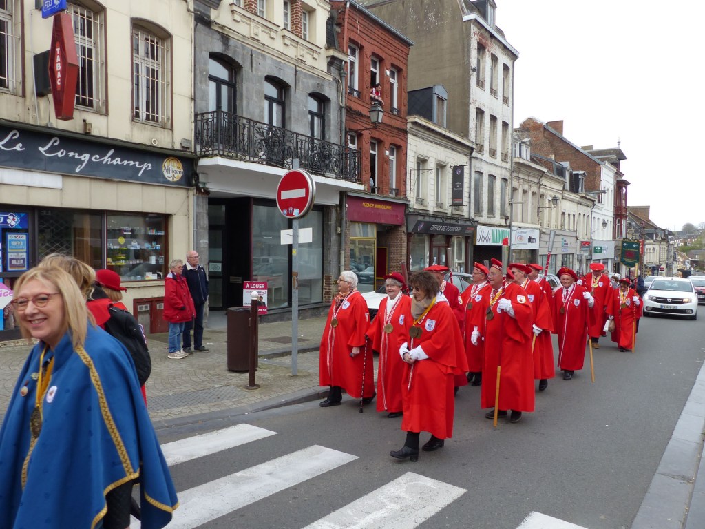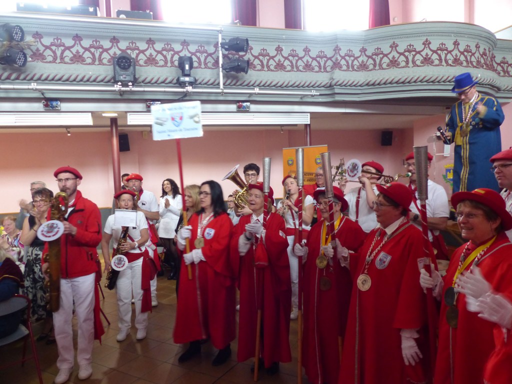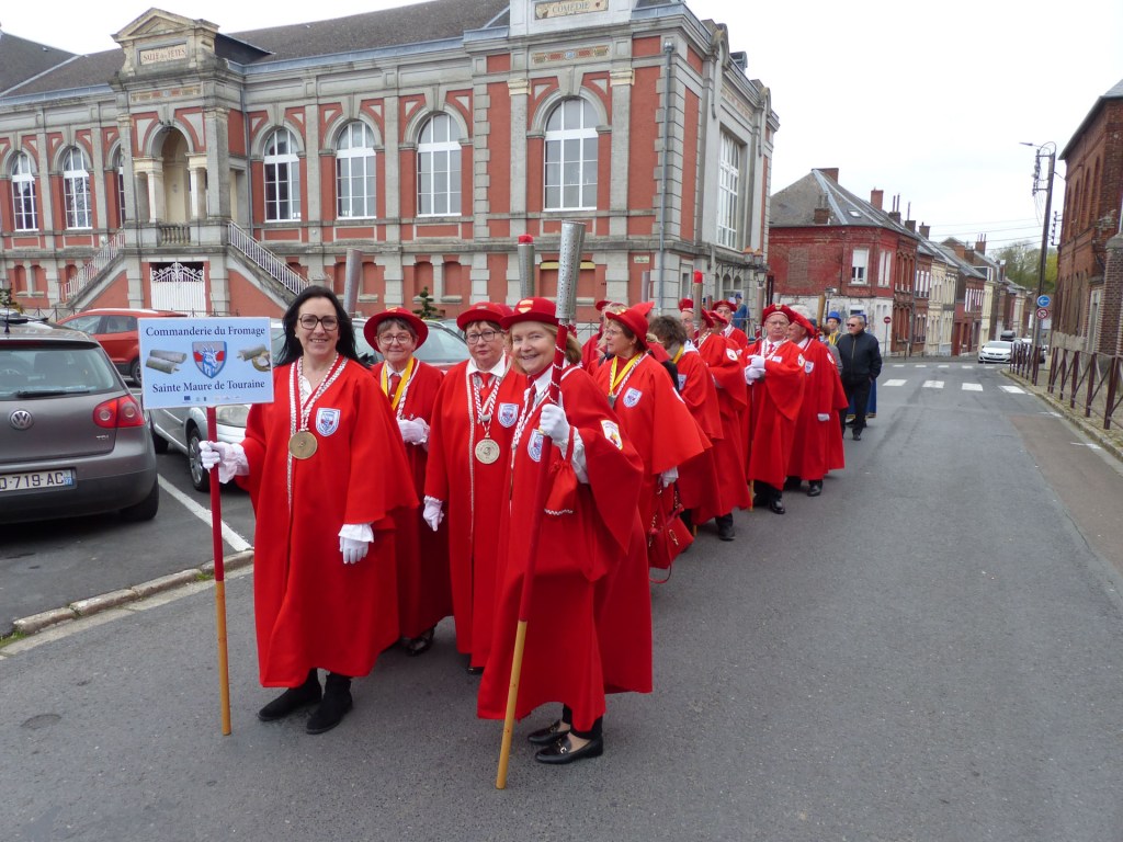 Innovation appréciée et plébiscitée par les Confréries présentes samedi soir 4 avril, Un buffet de produits locaux, servi au « Carré des Arts », tenu pas le traiteur Marc Fossez, rassemblait les Confréries arrivées pour un moment de convivialité, de partage de dialogue, faire connaissance, renouer des liens avec des Confréries de France, de Belgique, en allant des uns aux autres en toute tranquillité. Un moment très réussi. Dimanche matin, dans la bonne tradition Confrérique, les Confréries sont accueillies au Théâtre René Ledieu, par la Banda, jeune et joyeuse, tonique et dynamique qui va nous accompagner jusqu’au Repas en faisant une HOLA à l’adresse des 2 Commanderies, Sainte Maure de Touraine, Marraine, La Chaude Andouille Filleule, pour un solide petit déjeuner, (car la journée sera longue). Le groupe de Sainte Maure de Touraine compte 23 délégués, dont notre Officier Sonneur Pascal, qui apportera son concours de soliste trompette à Loïc, organiste de l’orgue de l’Abbatiale St Martin, pour la Messe de Pâques.