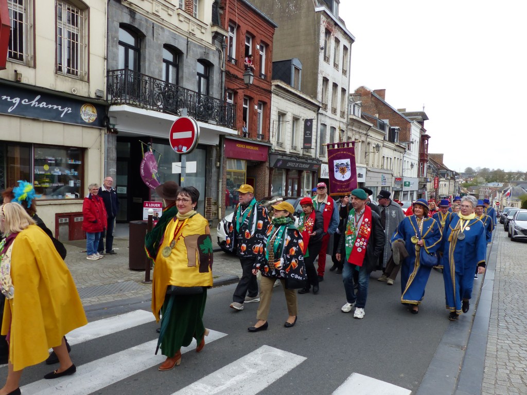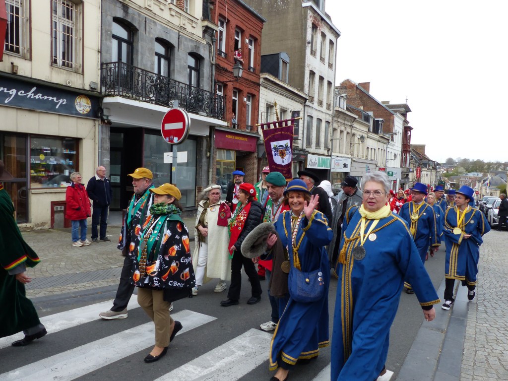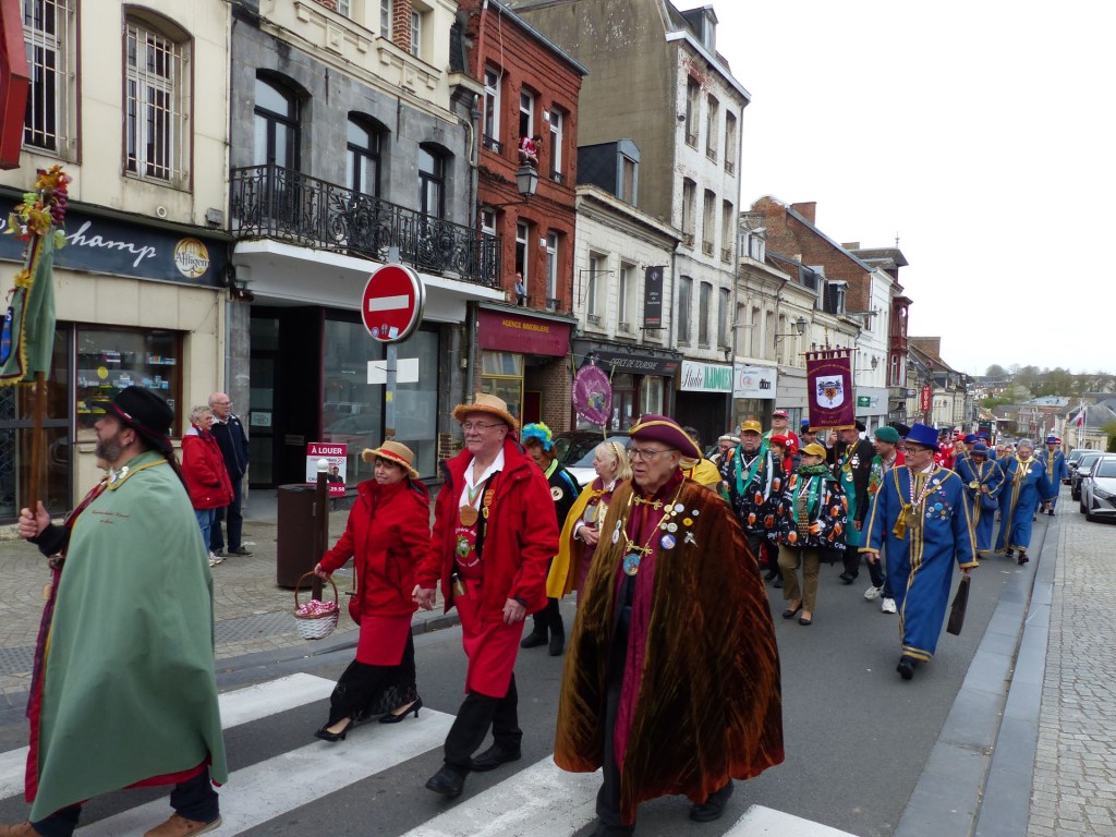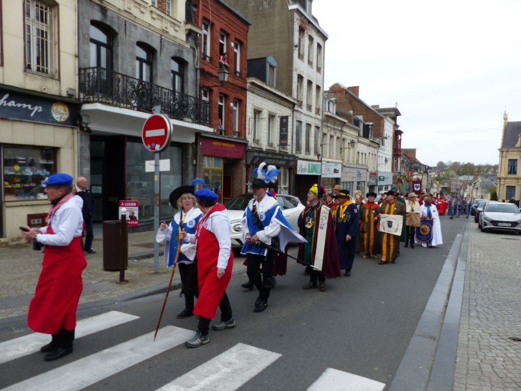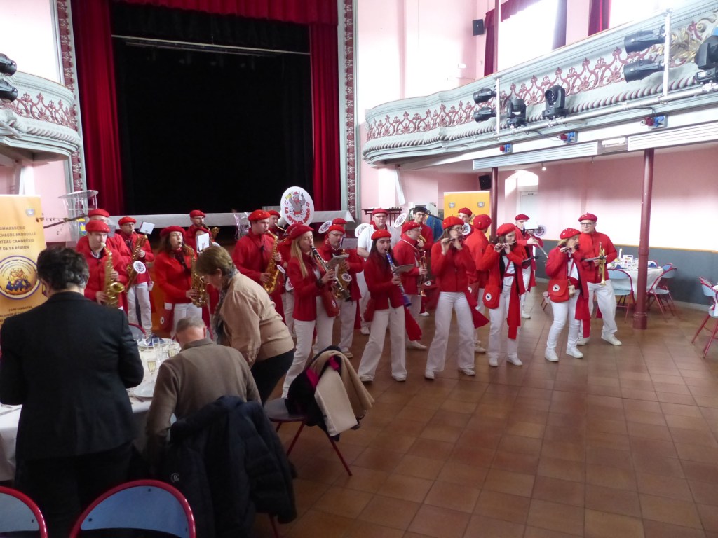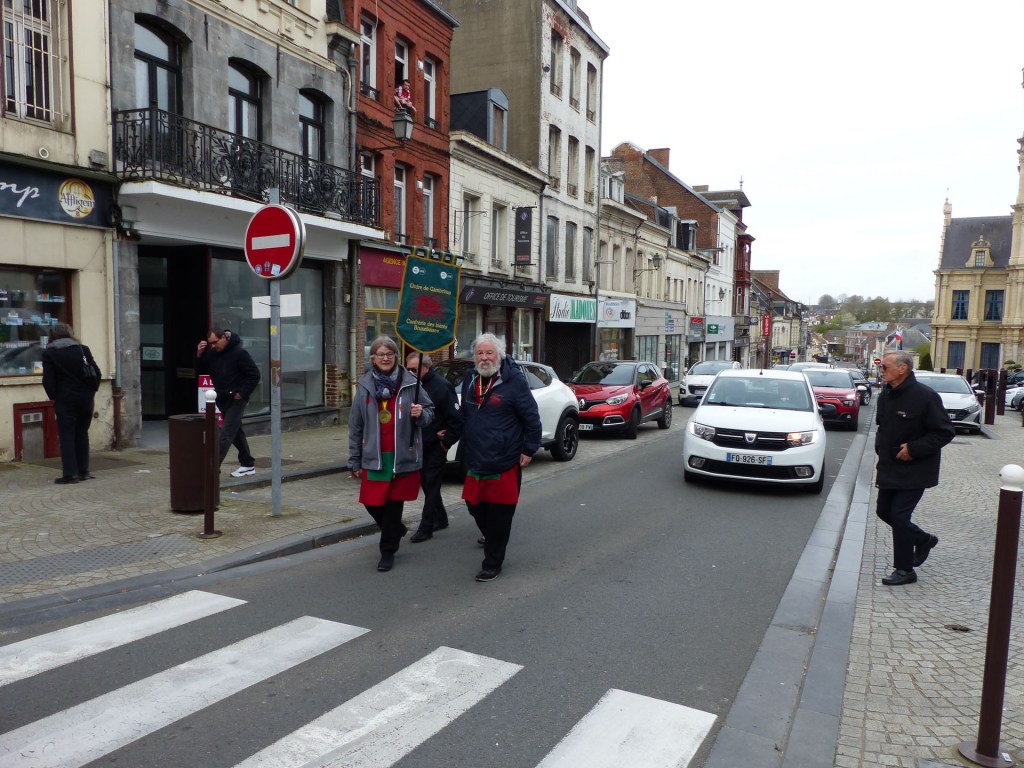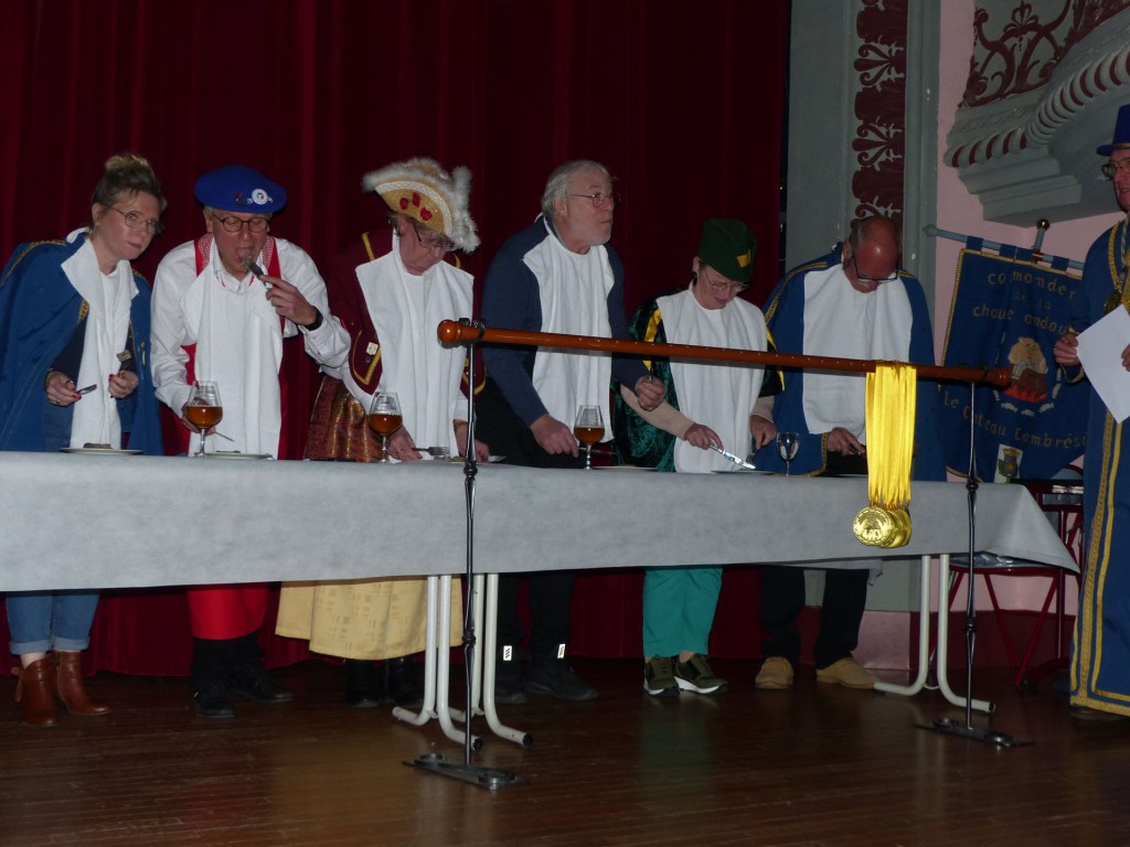 Innovation appréciée et plébiscitée par les Confréries présentes samedi soir 4 avril, Un buffet de produits locaux, servi au « Carré des Arts », tenu pas le traiteur Marc Fossez, rassemblait les Confréries arrivées pour un moment de convivialité, de partage de dialogue, faire connaissance, renouer des liens avec des Confréries de France, de Belgique, en allant des uns aux autres en toute tranquillité. Un moment très réussi. Dimanche matin, dans la bonne tradition Confrérique, les Confréries sont accueillies au Théâtre René Ledieu, par la Banda, jeune et joyeuse, tonique et dynamique qui va nous accompagner jusqu’au Repas en faisant une HOLA à l’adresse des 2 Commanderies, Sainte Maure de Touraine, Marraine, La Chaude Andouille Filleule, pour un solide petit déjeuner, (car la journée sera longue). Le groupe de Sainte Maure de Touraine compte 23 délégués, dont notre Officier Sonneur Pascal, qui apportera son concours de soliste trompette à Loïc, organiste de l’orgue de l’Abbatiale St Martin, pour la Messe de Pâques.