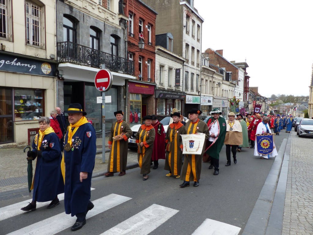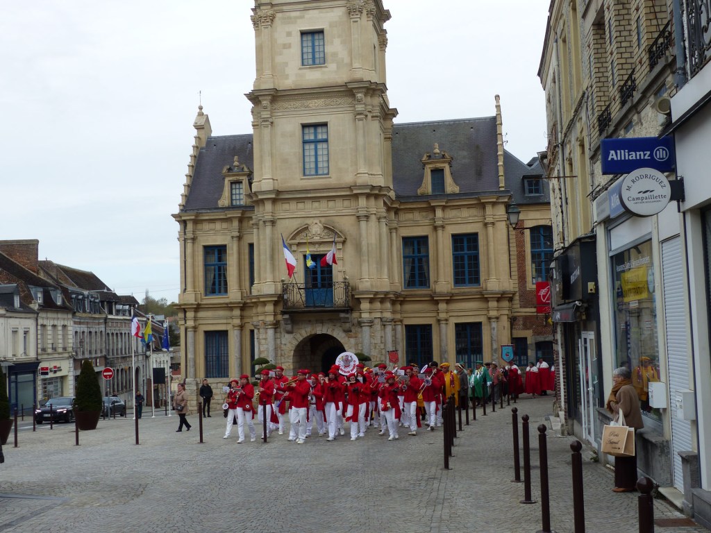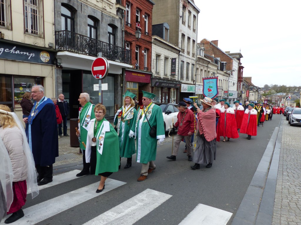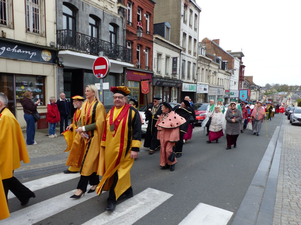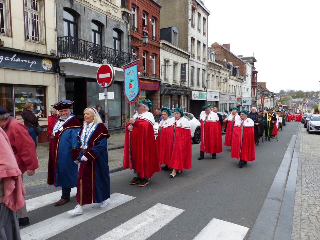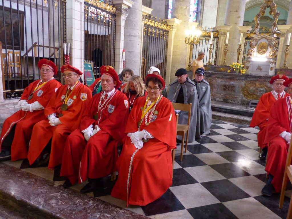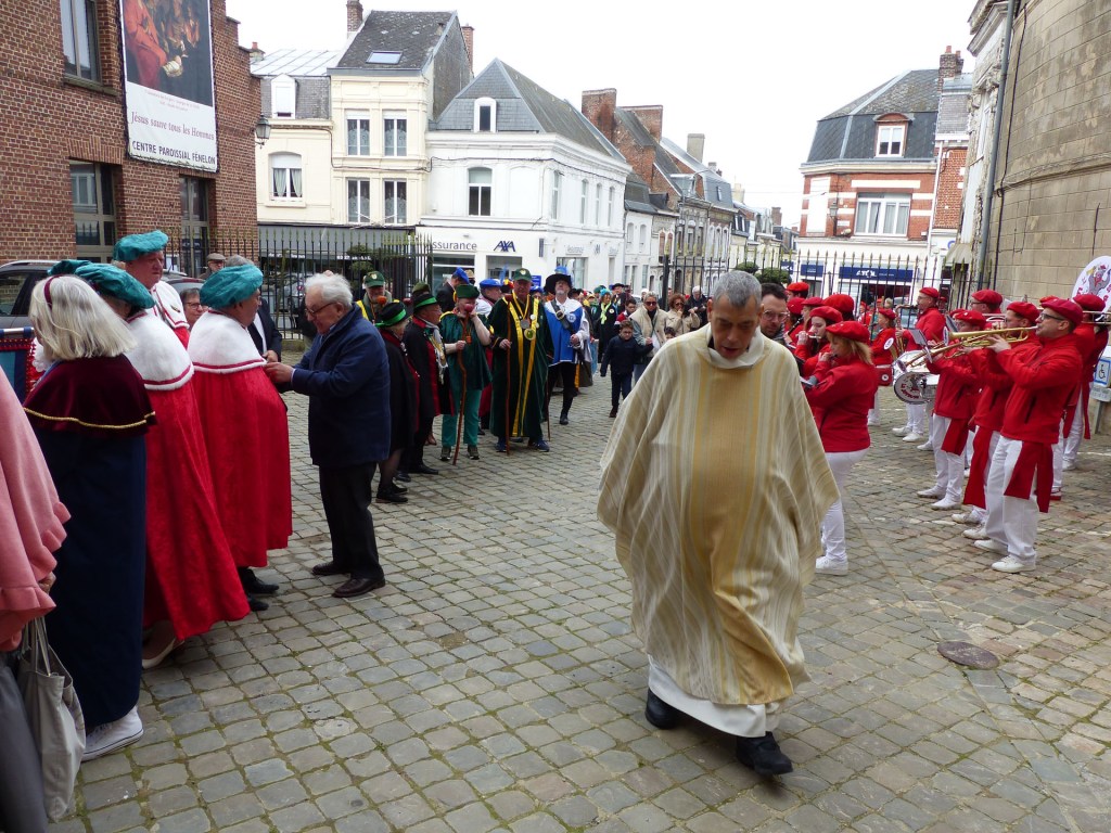 Le défilé traverse le Centre-ville, depuis le théâtre, passant devant le magnifique Beffroi, arrive devant l’Abbatiale, accueilli par Monsieur Le Curé Jean Denis sur le parvis, qui salue chacune des 40 Confréries, prenant note du produit représenté. Les offrandes lui seront remises à l’Offertoire au pied de l’autel. L’entrée solennelle des Confréries dans la nef au son de « Ouverture Music For The Royal Fireworks » de Haendel, interprété par Loïc à l’orgue et Pascal à la trompette, accroit la solennité et le recueillement de l’instant.