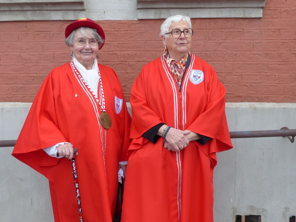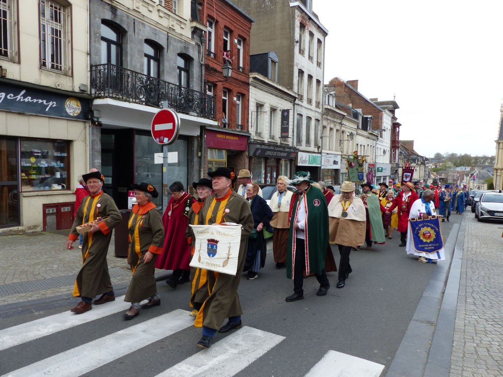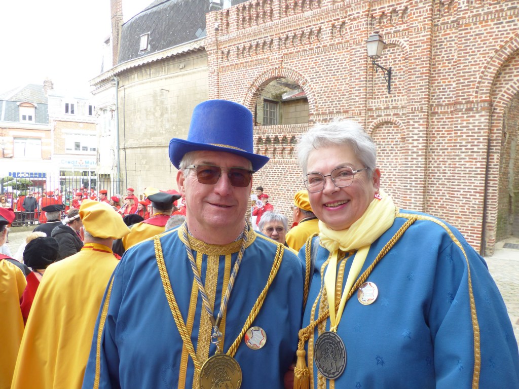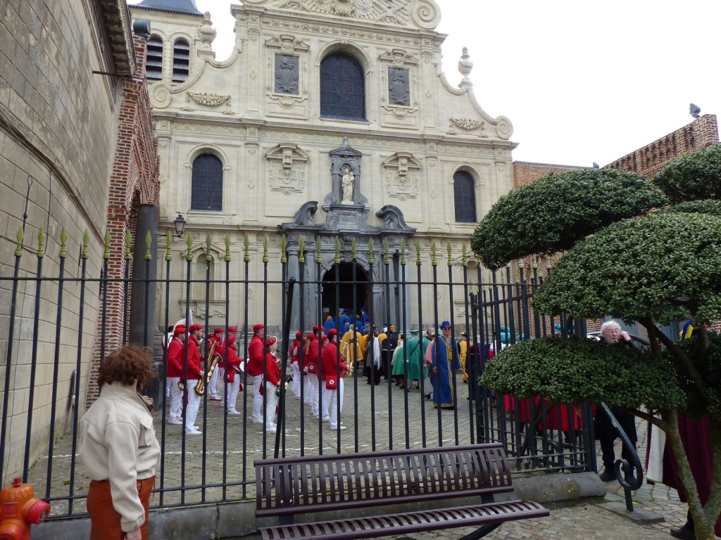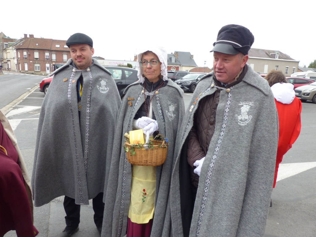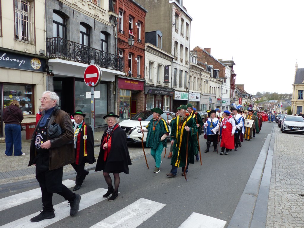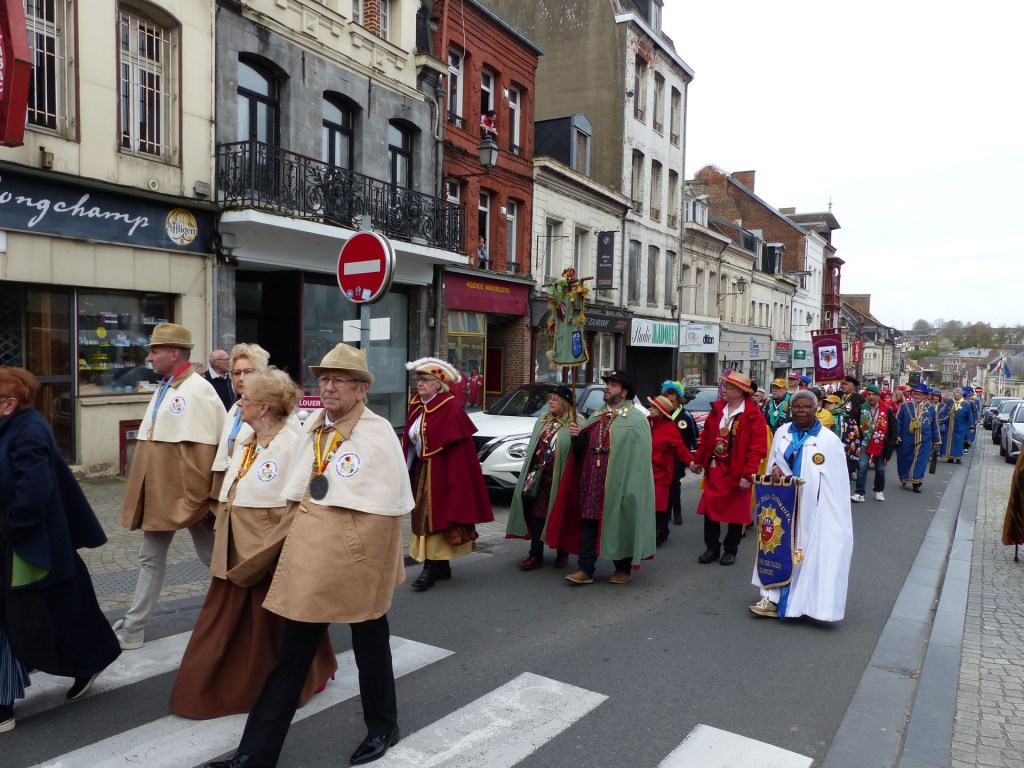 Le défilé traverse le Centre-ville, depuis le théâtre, passant devant le magnifique Beffroi, arrive devant l’Abbatiale, accueilli par Monsieur Le Curé Jean Denis sur le parvis, qui salue chacune des 40 Confréries, prenant note du produit représenté. Les offrandes lui seront remises à l’Offertoire au pied de l’autel. L’entrée solennelle des Confréries dans la nef au son de « Ouverture Music For The Royal Fireworks » de Haendel, interprété par Loïc à l’orgue et Pascal à la trompette, accroit la solennité et le recueillement de l’instant.