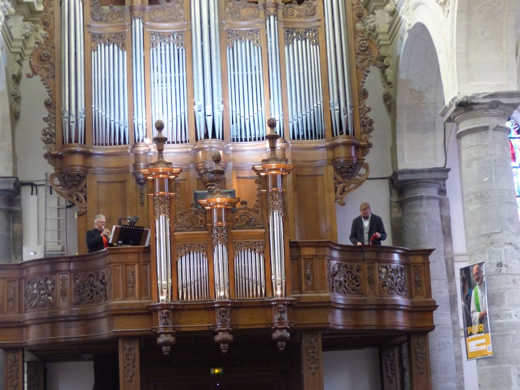 Après le mot d’accueil de la communauté paroissiale par Monsieur Le Curé, Patrick Ledieu énumère les noms des 40 Confréries présentes, puis la messe commence. Au moment de la remise des offrandes, Trompette et Orgue exécutent « Le Choral du Veilleur » de J-S Bach Pendant la communion, Loïc et Pascal ont interprété une pièce de J-S Bach : « Air in B Flat Major » (en si bémol majeur).